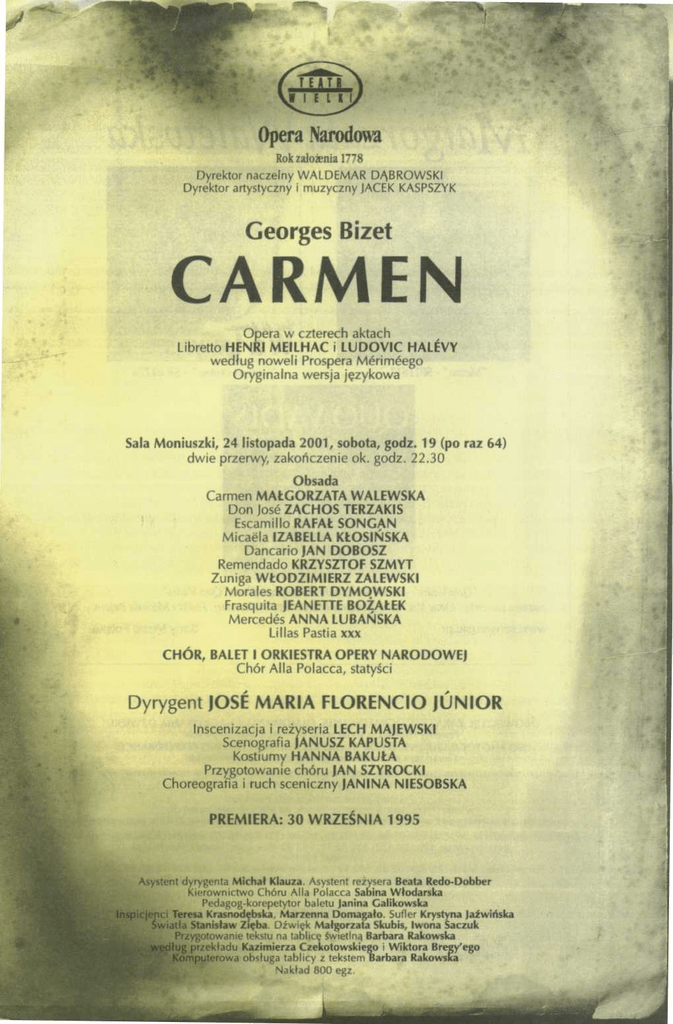 Opera Narodowa Rok zalozenia 1778 Dyrektor naczelny WALDEMAR DABROWSKI Dyrektor artystyczny i muzyczny JACEK KASPSZYK Georges Bizet CARMEN Opera w czterech aktach Libretto HENRI MEILHAC i LUDOVIC HALÉVY wedlug noweli Prospera Mériméego Oryginalna wersja jezykowa Sala Moniuszki, 24 listopada 2001, sobota, godz. 19 (po raz 64) dwie przerwy, zakonczenie ok . godz . 22 .30 Obsada Carmen MALGORZATA WALEWSKA Don José ZACHOS TERZAKIS Escamillo RAFAL SONGAN Micaela IZABELLA KLOSINSKA Dancario JAN DOBOSZ Remendado KRZYSZTOF SZMYT Zuniga WEODZIMIERZ ZALEWSKI Morales ROBERT DYMOWSKI Frasquita JEANETTE BOZALEK Mercedes ANNA LUBANSKA Lillas Pastia xxx CHÓR, Chór BALET I ORKIESTRA OPERY NARODOWEJ Alla Polacca, statysci Dyrygent JOSÉ MARIA FLORENCIO JUNIOR Inscenizacja i rezyseria LECH MAJEWSKI Scenografia JANUSZ KAPUSTA Kostiumy HANNA BAKULA Przygotowanie chóru JAN SZYROCKI Choreografla i ruch sceniczny JANINA NIESOBSKA PREMIERA : 30 WRZESNIA 1995 Asystent dyrygenta Michat Klauza . Asystent rezysera Beata Redo-Dobber Kierownictwo Chóru Alla Polacca Sabina Wlodarska Pedagog-korepetytor baletu Janina Galikowska lnspicjenci Teresa Krasnodgbska, Marzenna Domagato . Sufler Krystyna Jazwinska Swiatla Stanistaw Zieba. Dzwiek Malgorzata Skubis, Iwona Saczuk Przygotowanie tekstu na tablice Swietlna Barbara Rakowska wedlug przekladu Kazimierza Czekotowskiego o i Wiktora Bregyego Komputerowa obsluga tablicy z tekstem Barbara Rakowska Naklad 800 egz .