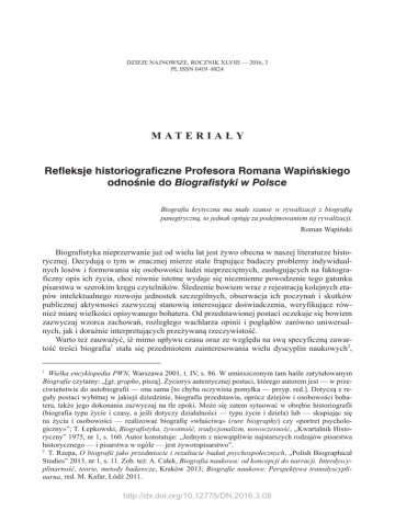 DZIEJE NAJNOWSZE, ROCZNIK XLVIII — 2016, 3 PL ISSN 0419–8824 M AT E R I A Ł Y Refleksje historiograficzne Profesora Romana Wapińskiego odnośnie do Biografistyki w Polsce Biografia krytyczna ma małe szanse w rywalizacji z biografią panegiryczną, to jednak optuję za podejmowaniem tej rywalizacji. Roman Wapiński Biografistyka nieprzerwanie już od wielu lat jest żywo obecna w naszej literaturze historycznej. Decydują o tym w znacznej mierze stale frapujące badaczy problemy indywidualnych losów i formowania się osobowości ludzi nieprzeciętnych, zasługujących na faktograficzny opis ich życia, choć równie istotne wydaje się niezmienne powodzenie tego gatunku pisarstwa w szerokim kręgu czytelników. Śledzenie bowiem wraz z rejestracją kolejnych etapów intelektualnego rozwoju jednostek szczególnych, obserwacja ich poczynań i skutków publicznej aktywności zazwyczaj stanowią interesujące doświadczenia, weryfikujące również miarę wielkości opisywanego bohatera. Od przedstawionej postaci oczekuje się bowiem zazwyczaj wzorca zachowań, rozległego wachlarza opinii i poglądów zarówno uniwersalnych, jak i doraźnie interpretujących przeżywaną rzeczywistość. Warto też zauważyć, iż mimo upływu czasu oraz ze względu na swą specyficzną zawartość treści biografia1 stała się przedmiotem zainteresowania wielu dyscyplin naukowych2, Wielka encyklopedia PWN, Warszawa 2001, t. IV, s. 86. W umieszczonym tam haśle zatytułowanym Biografie czytamy: „[gr. grapho, piszą]. Życiorys autentycznej postaci, którego autorem jest — w przeciwieństwie do autobiografii — ona sama [to chyba oczywista pomyłka — przyp. red.]. Dotyczą z reguły postaci wybitnej w jakiejś dziedzinie, biografia przedstawia, oprócz dziejów i osobowości bohatera, także jego dokonania zazwyczaj na tle epoki. Może się zatem sytuować w obrębie historiografii (biografia typu życie i czasy, a jeśli dotyczy działalności — typu życie i dzieła) lub — skupiając się na życiu i osobowości — realizować biografię «właściwą» (rure biography) czy «portret psychologiczny»”; T. Łepkowski, Biografistyka, żywotność, tradycjonalizm, nowoczesność, „Kwartalnik Historyczny” 1975, nr 1, s. 160. Autor konstatuje: „Jednym z niewątpliwie najstarszych rodzajów pisarstwa historycznego — i pisarstwa w ogóle — jest żywotopisarstwo”. 2 T. Rzepa, O biografii jako przedmiocie i rezultacie badań psychospołecznych, „Polish Biographical Studies” 2013, nr 1, s. 11. Zob. też: A. Całek, Biografia naukowa: od koncepcji do narracji. Interdyscyplinarność, teorie, metody badawcze, Kraków 2013; Biografie naukowe. Perspektywa transdyscyplinarna, red. M. Kafar, Łódź 2011. 1 http://dx.doi.org/10.12775/DN.2016.3.08 146 Witold Wojdyło, Arkadiusz Fordoński chociażby takich jak literaturoznawstwo, pedagogika, socjologia, psychologia społeczna, nauki polityczne i historia3. Tego rodzaju badania w obrębie humanistyki i nauk społecznych odgrywają rolę znaczącą. Sprawdzają się m.in. w studiach biograficznych nad dziejami narodu, wspólnot lokalnych, mieszkańców pogranicza, a także różnorodnych grup społecznych4. Biografia stanowi też punkt wyjścia do powołania biografistyki, traktowanej zwłaszcza przez nauki humanistyczne i społeczne jako subdyscyplina mająca wpływ na wytyczanie ważnych i oryginalnych nurtów badawczych. Z kolei wyodrębnienie przedmiotu badań biograficznych w pierwszej chwili wydaje się niezmiernie proste, choćby z tego względu, iż zakładamy, że jest to czyjaś biografia. Jednak ten pierwszy, zrozumiały odruch szybko znika, gdy zgłębimy treść pojęcia biografia oraz sformułujemy pytanie, czemu służy oraz przez kogo i w oparciu o jakie przesłanki została sporządzona, do kogo jest adresowana i dlaczego właśnie w to, a nie inne miejsce. Uwzględniając powyższe przesłanki, możemy dokonać typologizacji5 biografii na: 1) jednostkową (opisuje wyłącznie życie jednostki); 2) zbiorową (kiedy sporządzono ją w oparciu o analizy wielu biografii jednostkowych, odpowiednio dobranych i przebadanych w kontekście określonego kryterium i celu). Celem badań biograficznych jest odkrycie pewnych regularności losów ludzkich, obrazu życia społecznego tkwiącego w świadomości poszczególnych osób, pozyskanie informacji odnośnie do konkretnych wydarzeń, istotnych w jego życiu. Ważne jest także badanie tzw. momentów krytycznych w życiu człowieka, często przełomowych, które wiele zmieniły w życiu osobistym, wpłynęły pobudzająco lub hamująco na określone jego sfery. Badania biograficzne odkrywają wreszcie, jak otoczenie społeczne i warunki historyczne, polityczne, kulturotwórcze, ekonomiczne kształtują przebieg ludzkiego życia lub jego istotnej części, np. działalności politycznej, pisarskiej. W każdej biografii pojawiają się wątki psychologiczne, społeczne, edukacyjne, ekonomiczne, geograficzne, historyczne, polityczne. Śledzenie tych wątków — jednego, dwóch lub trzech — i ich wzajemnego wpływu na siebie ujawnia wzajemne zależności, przyczyny i skutki określonych zdarzeń w życiu człowieka, cenione wartości itp.6 Zob. chociażby artykuł Dyskusje i polemiki. Biografistyka dziejów najnowszych, „Dzieje Najnowsze” 1973, nr 3, s. 153–185. 4 Wychodząc naprzeciw tym tendencjom i uwzględniając wzrost zainteresowania biografistyką w dniu dzisiejszym, z inicjatywy pracowników naukowych Instytutu Historii i Stosunków Międzynarodowych Uniwersytetu Szczecińskiego, m.in. profesorów Adama Wątora i Tomasza Sikorskiego, przy współudziale pracowników Zakładu Polskiego Słownika Biograficznego Instytutu Historii Polskiej Akademii Nauk i wydatnym zaangażowaniu władz miejskich Szczecina, animowano pismo naukowe „Polish Biographical Studies”. W prospekcie pierwszego numeru periodyku, omawiając jego cele, zespół redakcyjny konstatował, że głów