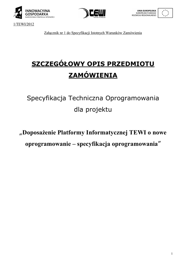 1/TEWI/2012 Załącznik nr 1 do Specyfikacji Istotnych Warunków Zamówienia SZCZEGÓŁOWY OPIS PRZEDMIOTU ZAMÓWIENIA Specyfikacja Techniczna Oprogramowania dla projektu „Doposażenie Platformy Informatycznej TEWI o nowe oprogramowanie – specyfikacja oprogramowania” 1 SPIS TREŚCI: I. PRZEDMIOT ZAMÓWIENIA ............................................................................................................................................3 II. ZAŁOŻENIA REALIZACJI PROJEKTU .................................................................................................................................4 III. CEL PROJEKTU................................................................................................................................................................5 IV. REZULTATY PROJEKTU ...............................................................................................................................................5 1. OPROGRAMOWANIA SPECJALISTYCZNE KIERUJĄCE PLM (PRODUCT LIFECYCLE MANAGEMENT) .............................................................6 1.1. Założenia ogólne.......................................................................................................................................................6 1.2. Podstawowa funkcjonalność ....................................................................................................................................9 2. OPROGRAMOWANIA DO WYKONYWANIA OBLICZEŃ NAUKOWYCH I INŻYNIERSKICH ............................................................................13 2.1. Założenia ogólne.....................................................................................................................................................13 2.2. Podstawowa funkcjonalność ..................................................................................................................................13 SŁOWNIK SKRÓTÓW ............................................................................................................................................................14 2 I. Przedmiot zamówienia Przedmiotem zamówienia jest„ Zakup oprogramowania badawczego, serwisu aktualizującego i rozszerzającego ilość licencji do platformy TEWI”. Zakres realizacji obejmuje w szczególności dostarczenie następujących komponentów rozumianych jako software: CZĘŚĆ I 1. Przedłużenie wsparcia techniczego oprogramowania specjalistycznego kierującego Zarządzaniem Cyklem Życia Produktu (Product Lifecycle Management – PLM) wraz z oprogramowaniem do wizualizacji produktu składającego się z: • CREO Parametric licencja komercyjna w ilości 1 sztuki • CREO Parametric licencja uniwersytecka na 500 stanowisk w ilości 1 sztuki • Creo Illustrate licencja edukacyjna na 50 stanowisk w ilości 1 sztuki • MathCAD licencja komercyjna w ilości 1 sztuki • MathCAD licencja uniwersytecka na 200 stanowisk w ilości 1 sztuki • Windchill access dla programów: CATIA, SolidWorks, Unigraphics, Autodesk, CREO – każda z licencji jest licenją uniwersytecka na 100 stanowisk gwarantujące: • kompatybilność z oprogramowaniem CATIA v.5, SolidWorks 2008, UG NX6, AutoCAD 2009, Autodesk Inventor 2009, ProEngineer v.5 • możliwość przeglądania i wprowadzanie (edycję) zmian w rysunkach CAD 2. Uzupełnienie asysty technicznej dla licencji 100NUP Oracle Database Standard Edition o rok. 3. Wymagania dodatkowe dla oferowanego oprogramowania w części I: 3.1. kompatybilność z oprogramowaniem CATIA v.5, SolidWorks 2008, UG NX6, AutoCAD 2009, Autodesk Inventor 2009, ProEngineer v.5 3.2. pełna integracja w zakresie wymiany danych między wszystkimi modułami oferowanego oprogramowania. CZĘŚĆ II 3 1. oprogramowanie specjalistyczne do wykonywania obliczeń naukowych i inżynierskich Matlab firmy MathWorks lub równoważne, zawierające moduły Wavelet, Image Processing, Optimization, Global Optimization, Parallel Computing, Matlab Compiler, Symbollic toolbox, Communication system toolbox – 2 licencje edukacyjne. Jako równoważność traktuje się oprogramowanie pozwalające na uruchomienie programów opracowanych w środowisku Matlab 2010b opracowanych w Instytucie Informatyki Politechnik Łódzkiej 2. Pakiet aktualizacji na 1 rok do oprogramowania specjalistycznego do wykonywania obliczeń naukowych i inżynierskich Matlab firmy MathWorks, zawierające moduły Wavelet, Image Processing, Optimization, Global Optimization, Parallel Computing, Matlab Compiler – 1 licencja komercyjna + 1 licencja edukacyjna, lub pełna licencja (nie tylko na aktualizację, ale na pełne oprogramowanie) na inne oprogramowanie równoważne z prawem do rocznej aktualizacji. Jako równoważność traktuje się oprogramowanie pozwalające na uruchomienie programów opracowanych w środowisku Matlab 2010b opracowanych w Instytucie Informatyki Politechnik Łódzkiej 3. Pakiet oprogramowania dostarczających algorytmy i narzędzia dla projektowania, symulacji i analizy systemów komunikacyjnych – Communication System Toolbox – 1 licencja komercyjna + 1 licencja edukacyjna 4. Oprogramowanie specjalistyczne do wykonywania obliczeń naukowych i inżynierskich Methematica 8.0 lub nowsze, licencja sieciowa - 3 sztuki, wersja edukacyjna, lub inne równoważne. Jako równoważność traktuje się oprogramowanie pozwalające na uruchomienie programów opracowanych w środowisku Mathematica opracowanych w Instytucie Informatyki Politechnik Łódzkiej Licencje mają być nieograniczone czasowo z prawem sublicencjonowania dla innych ośrodków naukowo-badawczych oraz co najmniej jednorocznym serwisem aktualizacyjnym. Licencje komercyjne muszą umożliwiać prowadzenie pełnych prac badawczych (projekty na zamówienie, europejskie itp.) II. Założenia realizacji projektu Platforma umożliwi wprowadzenie nowych technologii informatycznych i innowacyjnych rozwiązań do procesu badań i rozwoju oraz wspó
