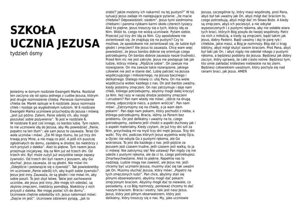 SZKOŁA UCZNIA JEZUSA tydzień ósmy Jesteśmy w ósmym rozdziale Ewangelii Marka. Rozdział ten zaczyna się od opisu jednego z cudów Jezusa, którym jest drugie rozmnożenie chleba. Pierwsze rozmnożenie chleba św. Marek opisuje w 6 rozdziale. Jezus rozmnaża chleb i rozdaje go wygłodniałym ludziom. W 6 rozdziale Ewangelii Marka uczniowie przychodzą do Jezusa i mówią: „Jest już późno. Zatem, Panie odeślij ich, aby mogli poszukać sobie pożywienia”. To jest w rozdziale 6. W rozdziale 8 jest coś innego, co bardzo lubię. Tym razem, to nie uczniowie idą do Jezusa, aby Mu powiedzieć „Panie, popatrz na ten tłum”; ale sam Jezus to zauważa. Teraz On woła uczniów i mówi: „Żal Mi tego tłumu, bo już trzy dni trwają przy Mnie, a nie mają co jeść. A jeśli ich puszczę zgłodniałych do domu, zasłabną w drodze; bo niektórzy z nich przyszli z daleka”. Ależ to piękne. Tym razem Jezus przejmuje inicjatywę. Idą za Nim już od trzech dni. Od trzech dni. Być może zużyli już wszystkie swoje zapasy żywności. Od trzech dni byli razem z Jezusem, aby Go słuchać. Jezus zauważa, że są głodni. Nie mówi im: „Odejdźcie i postarajcie się o żywność”. Tak powiedzieliby im uczniowie:„Panie odeślij ich, aby kupili sobie żywności". Jezus jest inny. Zauważa, że są głodni i nie mówi im, aby sobie poszli. To jest zbyt łatwe. Takie jest zachowanie uczniów, ale Jezus jest inny:„Nie mogę ich odesłać, są zbytnio zmęczeni, niektórzy pomdleją. Niektórzy z nich przyszli z daleka. Nie mogę posłać ich do domu”. Uczniowie chętnie odesłaliby ich. Jezus natomiast mówi: „Dajcie im jeść”. Uczniowie zdziwieni pytają, „Jak to zrobić? Jakże możemy ich nakarmić na tej pustyni?” W tej sytuacji Jezus zadaje im następujące pytanie: „Ile macie chlebów? Odpowiedzieli: siedem”. Jezus tymi siedmioma chlebami i paroma rybkami karmi około czterech tysięcy. Ależ to piękne. Jezus troszczy się o tych, którzy idą za Nim. Widzi to, czego nie widzą uczniowie. Pytam siebie. Przecież już trzy dni idą za Nim. Czy apostołowie nie zorientowali się, że znajdują się na pustyni? Czy to możliwe, że apostołowie nie zorientowali się, że ludzie byli głodni i zmęczeni? Ale Jezus to zauważa. Chcę wam więc powiedzieć, że Jezus bardzo dobrze się orientuje czego potrzebujemy. On bardzo dobrze zauważa nasze trudności. Przed Nim nic nie jest zakryte. Jezus nie postępuje tak jak ludzie, którzy mówią: „Pójdźcie sobie”. On zawsze ma rozwiązanie. On ma zawsze takie rozwiązanie, jakiego człowiek nie jest w stanie dać. Lubię patrzeć na Jezusa współczującego i miłosiernego, na Jezusa bacznego i delikatnego. Dlatego mówię ci: ufaj Panu. On ma wiele współczucia wobec każdego z nas. On jest bardzo uważny, kiedy jesteśmy zmęczeni. On nas zatrzymuje i daje nam chleb, którego potrzebujemy, abyśmy mogli dalej kroczyć za Nim. Ileż razy w naszej drodze jesteśmy zmęczeni i utrudzeni? Pan nam wtedy nie mówi: „idźcie na drugą stronę, odpocznijcie nieco, a potem wróćcie”. Pan nam mówi: „Zatrzymajmy się na chwilę, a Ja wam dam pokarm”. Pan daje nam pokarm, który pochodzi z nieba, a którego potrzebujemy. Bracia, idźmy za Panem bez problemu. On jest delikatny i uważny na to, czego potrzebujemy, zarówno jeśli chodzi o aspekt duchowy jak i o aspekt materialny. Kiedy czytam, że już trzy dni szli za Nim, przychodzą mi na myśl trzy dni męki Jezusa. Trzy dni walki. Trzy dni, podczas których Jezus wypełnia wolę Ojca, a Ojciec nie odsyła Go z pustymi rękoma, ale Go wskrzesza. To jest dla każdego z nas. Jeśli pójście za Jezusem jest czasem trudne, jeśli czasem jest walką, to ja ci mówię: Nie zatrzymuj się! Nie ustawaj! Pan nigdy cię nie odeśle z pustymi rękoma, ale da ci to, czego potrzebujesz. Zmartwychwstanie. Ależ to piękne. Napełnia nas to nadzieją. Ludzie mogą nas zawieść, ale Jezus nie. Jeśli chcemy być uczniami Jezusa, musimy stać się tak uważni jak On. Musimy słuchać Jezusa, który mówi: „Popatrz na tych zmęczonych ludzi”. Pan chce, abyśmy stali się pilnymi obserwatorami, abyśmy mogli dać pokarm zmęczonym braciom. Abyśmy mogli dać to niewiele, co posiadamy, a co Bóg rozmnoży, ponieważ chcemy to dać naszym braciom. Bracia i siostry, taki jest nasz Jezus. Jezus, który jest pilnym obserwatorem, który jest delikatny, który troszczy się o nas. My, jako uczniowie Jezusa, szczególnie ty, który masz wspólnotę, proś Pana, abyś był tak uważny jak On, abyś mógł dać braciom to, czego potrzebują, abyś mógł dać im Słowo Boże. A kiedy są zmęczeni, abyś ich pocieszył, a nie odsyłał wyposzczonych i z pustymi rękoma, aby nie osłabła wiara tych braci, których Bóg posyła do twojej wspólnoty. Patrz na nich z miłością, a kiedy są zmęczeni, bądź takim jak Jezus, dobry Pasterz. Bądź uważny i daj te parę ryb i chlebów, jakie masz, a Bóg je rozmnoży. Bóg dał ci krąg biblijny, abyś mógł służyć swoim braciom. Proś Pana, abyś był taki jak On, i abyś nigdy nie odesłał nikogo z pustymi rękoma, a będziesz podobny do Jezusa. Będziesz jak dobry zaczyn, który sprawia, że całe ciasto rośnie. Będziesz tym, kto umie zakładać królestwo niebieskie na tej ziemi. Będziesz człowiekiem uważnym, który pochyla się nad ranami braci, jak Jezus. AMEN Wtorek Środa Czwartek Mk 7,31-37 Znowu opuścił okolice Tyru i przez Sydon przyszedł nad Jezioro Galilejskie, przemierzając posiadłości Dekapolu. Przyprowadzili Mu głuchoniemego i prosili Go, żeby położył na niego rękę. On wziął go na bok, osobno od tłumu, włożył palce w jego uszy i śliną dotknął mu języka; a spojrzawszy w niebo, westchnął i rzekł do niego: «Effatha», to znaczy: Otwórz się! Zaraz otworzyły się jego uszy, więzy języka się rozwiązały i mógł prawidłowo mówić. Jezus przykazał im, żeby nikomu nie mówili. L