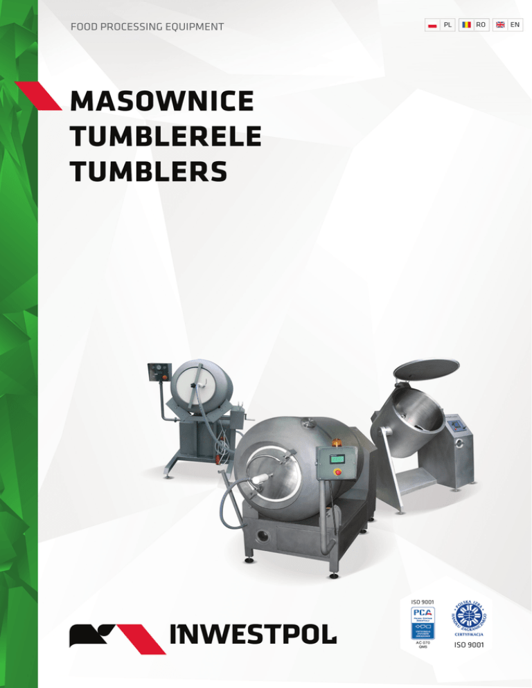 Inwestpol-Consulting Poland działa w branży urządzeń dla przemysłu spożywczego, ze szczególnym uwzględnieniem przetwórstwa mięsnego. Znamy wymagania i potrzeby klienta tej branży, bazując na 25-letnim doświadczeniu założyciela Firmy i zespołu pracowników. Większość naszych urządzeń trafia na eksport, a marka Inwestpol jest reprezentowana w ponad 20 krajach, gdzie sprzedajemy nasze maszyny za pośrednictwem sieci dystrybutorów i partnerów. Zaufali nam klienci między innymi z: Rosji, Białorusi, Ukrainy, Kazachstanu, Meksyku, Chile, Dominikany, Japonii, Chin i Państw Unii Europejskiej. Inwestpol- Consulting Polonia activeaza in principal in domeniul productiei de utilaje pentru industria alimentara si in special pentru unitati din industria alimentara a carnii. Satisfacem nevoile si dorintele clientilor nostri, bazandu-ne pe o experienta de 25 de ani in acest domeniu. Cea mai mare parte din utilajele noastre sunt exportate, iar marca Inwestpol este regasita in mai mult de 20 de state. Noi comercializam utilajele prin intermediul partenerilor si distribuitorilor. Ne-au oferit credibilitate clienti din: Rusia, Belorusia, Kazahstan,Mexic,Chile, Republica Dominecana,Japonia, China si state member U.E. Inwestpol-Consulting Poland operates in the sector of the food industry, with particular emphasis on meat processing. We know the customer’s requirements and needs of the industry, based on 25 years experience of the Company founder and team workers. Most of our equipment is exported, and the brand Inwestpol is represented in more than 20 countries where we sell our machines through distributors and partners. We are trusted by customers, among others from: Russia, Belarus, Ukraine, Kazakhstan, Mexico, Chile, Dominican Republic, Japan, China and the European Union States. PL FOOD PROCESSING EQUIPMENT MASOWNICA PRÓŻNIOWA MA Charakterystyka »» Urządzenie wykonane ze stali nierdzewnej »» Sterowanie przy pomocy panelu dotykowego Mitsubishi »» Pokrywa unoszona hydraulicznie »» Wychylenie bębna przez siłownik hydrauliczny »» Urządzenie może być wykorzystane jako masownica i mieszałka »» Wyposażone jest w wymienne mieszadła »» Możliwość płynnej regulacji obrotów »» Automatyczne sterowanie wartości próżni, czasu procesu, kąta pochylenia bębna, ilości obrotów mieszadła i temperatury (opcja) »» 2 tryby pracy : ręczny i automatyczny »» Wbudowany załadunek (opcja) MA 150 MA 300 MA 500 MA 800 Pojemność bębna/ Capacitate / Barrel capacity l 150 300 500 800 Maksymalny wsad/ Incarcare / Max. charge l 100 220 350 500 Moc napędu mieszadła/ Мощность привода /Tumbler drive power kW 1,5 1,5 3,0 5,0 Moc pompy próżniowej/ Мощность вакуумного насоса/ Vacuum pump power kW 0,75 0,75 0,75 0,75 Regulowana prędkość obrotowa mieszadła / Регулированная вращательная скорость перемешевающего устройства / Regulating arm rotation speed obr./min/ rot./min 1-25 1-25 1-25 1-25 Automatyczne sterowanie czasem procesu/ Автоматическое управление временем продолжения процесса / Automatic process time regulation h 0-24 0-24 0-24 0-24 Automatyczne sterowanie wartości próżni/ Автоматическое управление вакуумом /Automatic vacuum regulation % 0-99 0-99 0-99 0-99 Wydajność pompy/ Производительность вакуумного насоса/ Vacuum pump effectiveness m³/h 20 20 40 40 Wymiary (L xB x H)/ Размеры / Dimensions mm 900 x 1350 x 1550 1000 x 1500 x 1750 1250 x 1800 x 1850 1350 x 1900 x 1900 Zasilanie/ Alimentare / Voltage V/Hz/ 3x400/50 3x400/50 3x400/50 3x400/50 Masa/ Greutate / Weight kg 650 700 900 1100 Masa: opcja z chłodzeniem/ Greutate / Weight: Option with cooling kg 750 850 1050 1300 Masa załadunku słupowego dla wózków 200 l/ Greutate / Weight of integrated loading system for 200l. trolleys kg 300 300 300 300 Masa załadunku wbudowanego dla wózków 200 l (nie dotyczy wersji MA 150)/ Вес встроенного подъемника для тележек 200 л. (не относиться к MA 150) / Weight of integrated loading system for 200l. trolleys (except MA 150) kg - 150 250 250 RO Descriere: masowanie Tumbler cu vacuum MA VACUUM TUMBLER MA Description »» Realizat din otel inoxidabil; »» Setat prin panoul cu senzori de tip Mitsubishi; »» Setare hidraulica a capacului; »» Permite mixarea si tumblarea produsului; »» Dotat cu lopeti de amestecare; »» Setarea rotatiilor este permisa; »» Setari automate( setarea vidului, tmpul de prelungire a programului »» Made of stainless steel »» Microprocessor PLC Mitsubishi with touch screen control panel »» Hydraulic cover opening »» Barrel deflection by hydraulic motor »» Tumbling and mixing function »» Exchangeable mixing/tumbling arms »» Fluent speed regulation »» Automatic regulation of vacuum value, time process, angle of tilting drum, de lucru, unghiul de inclinare a cuvei)+ optional (numarul de rotatii si temperature; shaft speed, temperature (option) »» Doi timpi de lucru: manual si automat; »» Dispozitiv de ridicare (optional). H »» 2 modes : manual and automatic »» Integrated loading system (option) L B ISO 9001 Opcje: Optional: Options: ˹˹ Z chłodzeniem ˹˹ Załadunek słupowy ˹˹ cu racire; ˹˹ dispozitiv de ridicare ˹˹ With cooling ˹˹ Mast loading system ˹˹ Załadunek ˹˹ dispozitiv de ridicare ˹˹ Integrated loading dla wózków 200 l ISO 9001 wbudowany dla wózków 200 l (nie dotyczy wersji MA 150) separat 200 l; integrat(exceptie MA150) EN for 200l. trolleys system for 200l. trolleys (except for MA 150) PL FOOD PROCESSING EQUIPMENT MASOWNICA PRÓŻNIOWA MAL 200/300 Charakterystyka »» Urządzenie wykonane ze stali nierdzewnej »» Sterowanie przy pomocy panelu dotykowego Mitsubishi »» Prosta obsługa »» Możliwość zaprogr