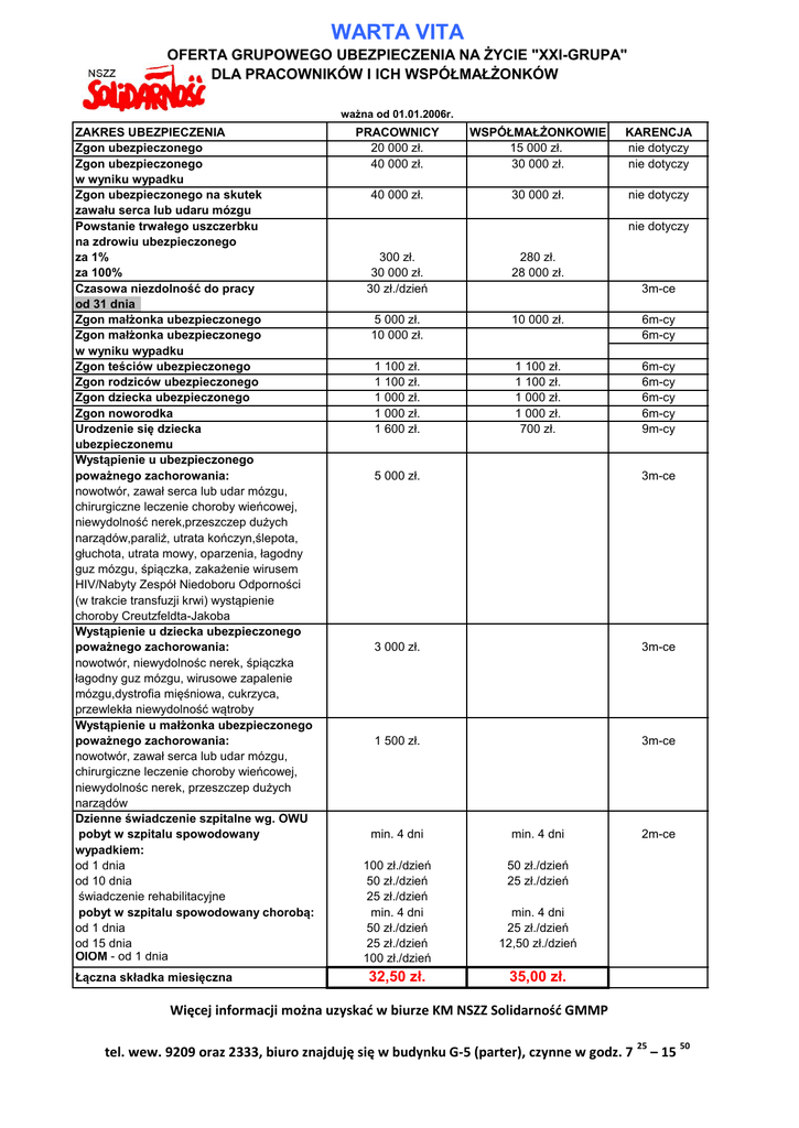 WARTA VITA OFERTA GRUPOWEGO UBEZPIECZENIA NA ŻYCIE "XXI-GRUPA" DLA PRACOWNIKÓW I ICH WSPÓŁMAŁŻONKÓW ważna od 01.01.2006r. ZAKRES UBEZPIECZENIA Zgon ubezpieczonego Zgon ubezpieczonego w wyniku wypadku Zgon ubezpieczonego na skutek zawału serca lub udaru mózgu Powstanie trwałego uszczerbku na zdrowiu ubezpieczonego za 1% za 100% Czasowa niezdolność do pracy od 31 dnia Zgon małżonka ubezpieczonego Zgon małżonka ubezpieczonego w wyniku wypadku Zgon teściów ubezpieczonego Zgon rodziców ubezpieczonego Zgon dziecka ubezpieczonego Zgon noworodka Urodzenie się dziecka ubezpieczonemu Wystąpienie u ubezpieczonego poważnego zachorowania: nowotwór, zawał serca lub udar mózgu, chirurgiczne leczenie choroby wieńcowej, niewydolność nerek,przeszczep dużych narządów,paraliż, utrata kończyn,ślepota, głuchota, utrata mowy, oparzenia, łagodny guz mózgu, śpiączka, zakażenie wirusem HIV/Nabyty Zespół Niedoboru Odporności (w trakcie transfuzji krwi) wystąpienie choroby Creutzfeldta-Jakoba Wystąpienie u dziecka ubezpieczonego poważnego zachorowania: nowotwór, niewydolnośc nerek, śpiączka łagodny guz mózgu, wirusowe zapalenie mózgu,dystrofia mięśniowa, cukrzyca, przewlekła niewydolność wątroby Wystąpienie u małżonka ubezpieczonego poważnego zachorowania: nowotwór, zawał serca lub udar mózgu, chirurgiczne leczenie choroby wieńcowej, niewydolnośc nerek, przeszczep dużych narządów Dzienne świadczenie szpitalne wg. OWU pobyt w szpitalu spowodowany wypadkiem: od 1 dnia od 10 dnia świadczenie rehabilitacyjne pobyt w szpitalu spowodowany chorobą: od 1 dnia od 15 dnia OIOM - od 1 dnia Łączna składka miesięczna PRACOWNICY 20 000 zł. 40 000 zł. WSPÓŁMAŁŻONKOWIE 15 000 zł. 30 000 zł. KARENCJA nie dotyczy nie dotyczy 40 000 zł. 30 000 zł. nie dotyczy nie dotyczy 300 zł. 30 000 zł. 30 zł./dzień 280 zł. 28 000 zł. 5 000 zł. 10 000 zł. 10 000 zł. 6m-cy 6m-cy 1 100 zł. 1 100 zł. 1 000 zł. 1 000 zł. 1 600 zł. 1 100 zł. 1 100 zł. 1 000 zł. 1 000 zł. 700 zł. 6m-cy 6m-cy 6m-cy 6m-cy 9m-cy 3m-ce 5 000 zł. 3m-ce 3 000 zł. 3m-ce 1 500 zł. 3m-ce min. 4 dni min. 4 dni 100 zł./dzień 50 zł./dzień 25 zł./dzień min. 4 dni 50 zł./dzień 25 zł./dzień 100 zł./dzień 50 zł./dzień 25 zł./dzień 32,50 zł. 2m-ce min. 4 dni 25 zł./dzień 12,50 zł./dzień 35,00 zł. Więcej informacji można uzyskad w biurze KM NSZZ Solidarnośd GMMP tel. wew. 9209 oraz 2333, biuro znajduję się w budynku G-5 (parter), czynne w godz. 7 25 – 15 50