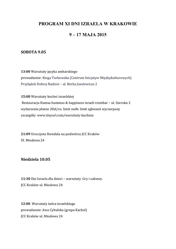 PROGRAM XI DNI IZRAELA W KRAKOWIE 9 – 17 MAJA 2015 SOBOTA 9.05 13:00 Warsztaty języka amharskiego prowadzenie: Kinga Turkowska (Centrum Inicjatyw Międzykulturowych) Przylądek Dobrej Nadziei – ul. Berka Joselewicza 2 15:00 Warsztaty kuchni izraelskiej Restauracja Hamsa hummus & happiness israeli restobar – ul. Szeroka 2 wydarzenie płatne 20zł/os. limit osób: limit zgłoszeń wyczerpany szczegóły: www.tinyurl.com/warsztaty-kuchnia 21:09 Uroczysta Hawdala na podwórzu JCC Kraków Ul. Miodowa 24 Niedziela 10.05 11:30 Dni Izraela dla dzieci – warsztaty. Gry i zabawy. JCC Kraków ul. Miodowa 24 12:00 Warsztaty tańca izraelskiego prowadzenie: Awa Cybulska (grupa Kachol) JCC Kraków ul. Miodowa 24 19:00 Kino izraelskie (podwójny seans) Artefakt Cafe ul. Dajwór 3 Poniedziałek 11.05 18:00 Warsztaty języka arabskiego prowadzenie: dr Karolina Rak (Instytut Bliskiego i Dalekiego Wschodu) Przylądek Dobrej Nadziei ul. Berka Joselewicza 2 18:30 Warsztaty tańca izraelskiego prowadzenie: Awa Cybulska (grupa Kachol) Synagoga Poppera ul. Szeroka 16 Wtorek 12.05 19:00 Kino izraelskie (podwójny seans) Artefakt Cafe ul. Dajwór 3 Środa 13.05 9:30 III Ogólnopolska Studencko - Doktorancka Konferencja „Izrael w Kalejdoskopie” JCC Kraków ul. Miodowa 24 19:00 Panel ekspercki „5 twarzy Izraela” (prof. Liora Hendelman Baavur, prof. dr hab. Przemysław Turek, dr Anna Maria Orla Bukowska, Piotr Niziński, Jagoda – Paździor Saba) Przylądek Dobrej Nadziei ul. Berka Joselewicza 2 Czwartek 14.05 17:00 Warsztaty języka hebrajskiego prowadzenie: dr Ewa Węgrzyn (Instytut Judaistyki UJ) JCC WEST ul. Izaaka 5 19:00 Spotkanie z Ambasador Izraela Anną Azari JCC Kraków ul. Miodowa 24 obowiązują zapisy limit osób: 40 szczegóły: www.tinyurl.com/Ambasador-Izraela Piątek 15.05 17:00 Warsztaty języka hebrajskiego prowadzenie: dr Ewa Węgrzyn (Instytut Judaistyki UJ) JCC WEST Izaaka 5 19:50 Otwarta kolacja szabatowa JCC Kraków ul. Miodowa 24 wydarzenie płatne 10zł/os. limit zgłoszeń wyczerpany szczegóły: www.tinyurl.com/otwarty-szabat Sobota 16.05 11:00 – 15:00 Gra miejska „10 twarzy Izraela” punkt zbiórki: Mały Rynek obowiązują zapisy limit drużyn: 20 szczegóły: www.tinyurl.com/gra-miejska10 16:00 Warsztaty kuchni izraelskiej Restauracja Hamsa hummus & happiness israeli restobar Szeroka 2 wydarzenie płatne 20zł/os. limit zgłoszeń wyczerpany szczegóły: http://tinyurl.com/warsztaty-kuchnia 21:00 After Shabbat Party – Tel Aviv Style ! BAL, ul. Ślusarska 9 Niedziela 17.05 12:00 Spacer po Kazimierzu – „Koszerny Kazimierz” punkt zbiórki: JCC Kraków, ul. Miodowa 24 12:00 Kaligrafia hebrajska „pod chmurką” prowadzenie Grzegorz Barasiński JCC Kraków ul. Miodowa 24 16:00 Wirtualna wycieczka po Jerozolimie prowadzenie Rabin Avi Baumol JCC Kraków ul. Miodowa 24 ORGANIZATORZY: WSPÓŁORGANIZATOR: PATRONAT: Marszałek Województwa Małopolskiego Marek Sowa Rektor Uniwersytetu Jagiellońskiego prof. dr hab. med. Wojciech Nowak Ambasada Państwa Izrael w Polsce Dziekan Wydziału Studiów Międzynarodowych i Politycznych UJ prof. dr hab. Bogdan Szlachta Stowarzyszenie i miesięcznik „Midrasz” PARTNERZY