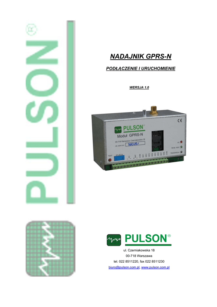 NADAJNIK GPRS-N PODŁĄCZENIE I URUCHOMIENIE WERSJA 1.0 ul. Czerniakowska 18 00-718 Warszawa tel. 022 8511220, fax 022 8511230 [email protected], www.pulson.com.pl Nadajnik GPRS-N – podłączenie i uruchomienie (wersja 1.0) 1. Montaż i podłączenie zasilania. Nadajnik GPRS-N przystosowany jest do montażu w obudowie PULSAR AWO33 z transformatorem. Oferowany jest w zestawie z obudową i anteną GSM (nadajnik zamontowany w obudowie i podłączony) lub bez obudowy (zestaw zawiera nadajnik, antenę GSM, przewody do akumulatora oraz tulejkę dystansową i śrubę mocującą). W przypadku zestawu bez obudowy, montaż polega na zawieszeniu nadajnika na zaczepach znajdujących się na tylnej ścianie obudowy AWO33 i zabezpieczeniu śrubą z tulejką dystansową (patrz zdjęcie). Następnie należy podłączyć wyjście transformatora z wejściem AC nadajnika oraz czujnik sabotażu z zaciskami SAB i COM. Antenę GSM poprzez otwór w obudowie mocujemy w złączu FME nadajnika. Przewody akumulatora powinny być podłączone do zacisków BAT (+ czerwony, - czarny). W celu sprawdzenia poprawności podłączenia zasilania, należy załączyć akumulator – diody TRYB/MOC i TRANSMISJA powinny się zaświecić, a następnie podłączyć zasilanie sieciowe – powinna zapalić się czerwona dioda AC. (Uwaga!!! Jeśli nadajnik nie został zaprogramowany należy dokonywać testu zasilania bez włożonej karty SIM, aby uniknąć zablokowania kodu PIN) 2. Podłączenie wejść alarmowych NO/NC. Nadajnik GPRS-N posiada 8 wejść typu NO/NC. Zmiana stanu następuje w momencie zwarcia wejścia do masy układu (zaciski COM). 3. Podłączenie wyjść nadajnika. Nadajnik GPRS-N ma dwa wyjścia przekaźnikowe. Umożliwiają one zdalne załączanie obwodów zewnętrznych z uprawnionych numerów komórkowych. Obciążalność styków przekaźnika wynosi maksymalnie 1A/125VAC, 30VDC. 2 Nadajnik GPRS-N – podłączenie i uruchomienie (wersja 1.0) 4. Uruchomienie nadajnika Przed włączeniem zasilania należy zainstalować kartę SIM z właściwym, zgodnym z zaprogramowanym w nadajniku kodem PIN oraz sprawdzić podłączenie anteny. Jeśli nadajnik nie został jeszcze zaprogramowany nie należy załączać zasilania bez podłączonego do nadajnika kabla programującego, aby nie zablokować karty SIM niewłaściwym kodem PIN (pozostawienie podłączonego kabla programującego blokuje proces inicjalizacji i logowania do sieci). Po załączeniu akumulatora diody TRYB/MOC oraz TRANSMISJA zaświecą się na około 10 sekund. Po tym czasie rozpoczyna się proces inicjalizacji sygnalizowany zgaszeniem diody TRANSMISJA. Następnie dioda TRYB/MOC świeci stale zaś TRANSMISJA miga nieregularnie, co świadczy o inicjalizacji. W zależności od karty SIM trwa to od 30 do 60 sekund. Jeśli proces inicjalizacji przebiegnie pomyślnie dioda TRYB/MOC przestaje świecić ciągle i miganiem sygnalizuje poziom mocy sygnału (od jednego do czterech mignięć i przerwa 2 sekundy). Od tego momentu nadajnik jest zalogowany do sieci GSM i może przesyłać zdarzenia SMS i CLIP do stacji monitorowania. Jeżeli w nadajniku ustawiono pracę GPRS i w ciągu 30 sekund od zalogowania do sieci GSM nie będzie zdarzeń do wysłania, nadajnik przełączy się w tryb transmisji danych i zestawi logiczne połączenie z zaprogramowanym adresem IP stacji odbiorczej. Będzie to sygnalizowane jednostajnym miganiem diody TRYB/MOC (1 sek. – świeci / 1 sek. – przerwa). Uwaga!!! Jeśli karta SIM zainstalowana w nadajniku nie ma w pamięci zapisanego swojego numeru telefonu, nadajnik przy pierwszym logowaniu po poprawnej inicjalizacji wykona procedurę rejestracji „numeru własnego”. Sygnalizacja i opis procedury patrz punkt: „Rejestracja numeru własnego”. 5. Rejestracja numeru własnego Jeżeli nadajnik zaprogramowano do pracy w GPRS i w trakcie inicjalizacji moduł stwierdzi brak w pamięci karty SIM jej własnego numeru telefonu, zostanie wykonana procedura „rejestracji numeru własnego”. Aby proces przebiegł poprawnie, w nadajniku musi być zaprogramowany „Numer techniczny GPRS” i karta SIM z tym numerem musi być zainstalowana w module GSM stacji odbiorczej SMSCI. Po poprawnej inicjalizacji nadajnik rozpoczyna procedurę rejestracji numeru własnego. Objawia się to naprzemiennym miganiem diod TRANSMISJA i TRYB/MOC. Moduł wysyła do numeru technicznego wiadomość specjalnej treści. Odebranie tej wiadomości sygnalizowane jest na stacji kodem zdarzenia xD (gdzie x- cyfra od 1 do 4, w zależności od tego, w którym module GSM zainstalowano kartę SIM z numerem technicznym) z numerem obiektu zgodnym z telefonem nadajnika. Po odebraniu stacja wysyła do nadajnika jego numer własny zakodowany w odpowiednim formacie. Nadajnik po otrzymaniu wiadomości, zapisuje numer własny do pamięci karty SIM, kasuje SMS i resetuje się. Po restarcie wykonuje normalne logowanie do sieci, zgodnie z opisem w punkcie „Uruchomienie nadajnika”. Uwaga! Procedura rejestracji numeru zwykle trwa około 2 minut. Jeśli jednak w ciągu 5 minut nadajnik nie restartuje się i wiemy, iż wysłane zapytanie dotarło do stacji odbiorczej, należy spróbować powtórzyć proces wyłączając i włączając zasilanie nadajnika. Jeśli to nie pomoże należy skorzystać z procedury awaryjnej opisanej w oddzielnym dokumencie „Opis rejestracji numeru własnego” lub skontaktować się z działem technicznym firmy PULSON. 3 Nadajnik GPRS-N – podłączenie i uruchomienie (wersja 1.0) 5. Test transmisji. Przycisk TEST nadajnika umożliwia wygenerowanie i wysłanie zdarzenia testowego do stacji odbiorczej (należy wcisnąć i przytrzymać przycisk dłużej niż 1 sekundę). W zależności od trybu pracy GSM czy GPRS nadajnik wyśle test w SMS lub w formie pakietu danych GPRS. Wysłany dwuznakowy kod jest identyczny jak zaprogramowany kod testu okresowego GSM/GPRS. Wysyłanie sygnalizowane jest mignięciem diody TRANSMISJA. W trybie GPRS dioda TRANSMISJA sygn
