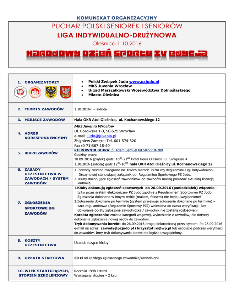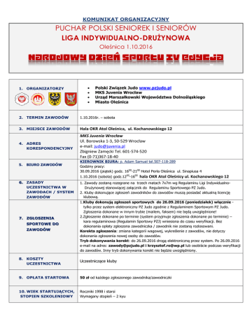 KOMUNIKAT ORGANIZACYJNY PUCHAR POLSKI SENIOREK I SENIORÓW LIGA INDYWIDUALNO-DRUŻYNOWA Oleśnica 1.10.2016 1. ORGANIZATORZY Polski Związek Judo www.pzjudo.pl MKS Juvenia Wrocław Urząd Marszałkowski Województwa Dolnośląskiego Miasto Oleśnica 2. TERMIN ZAWODÓW 1.10.2016r. – sobota 3. MIEJSCE ZAWODÓW Hala OKR Atol Oleśnica, ul. Kochanowskiego 12 4. ADRES KORESPONDENCYJNY MKS Juvenia Wrocław Ul. Borowska 1-3, 50-529 Wrocław e-mail: [email protected] Zbigniew Zamęcki Tel. 601-574-520 Fax (0-71)367-18-40 5. KIEROWNIK BIURA: p. Adam Samuel tel.507-118-289 Godziny pracy: 30.09.2016 (piątek) godz. 1600-2100 Hotel Perła Oleśnica ul. Sinapiusa 4 BIURO ZAWODÓW 1.10.2016 (sobota) godz.1200-1600 6. ZASADY UCZESTNICTWA W ZAWODACH / SYSTEM ZAWODÓW 7. ZGŁOSZENIA SPORTOWE DO ZAWODÓW hala OKR Atol Oleśnicy ul. Kochanowskiego 12 1. Zawody zostaną rozegrane na trzech matach 7x7m wg Regulaminu Ligi IndywidualnoDrużynowej stanowiącej załącznik do Regulaminu Sportowego PZ Judo. 2. Kluby dokonujące zgłoszeń zawodników do zawodów muszą posiadać aktualną licencję klubową. 1.Kluby dokonują zgłoszeń sportowych do 26.09.2016 (poniedziałek) włącznie tylko przez system elektroniczny PZ Judo zgodnie z Regulaminem Sportowym PZ Judo. Zgłoszenia dokonane w innym trybie (mailem, faksem) nie będą uwzględnione! 2.Zgłoszenie dokonane po terminie (system przyjmuje zgłoszenia dokonane po terminie) – kara regulaminowa (Regulamin Sportowy PZJ) wniesiona do czasu weryfikacji. Bez dokonania opłaty zgłoszona zawodniczka / zawodnik nie zostaną rozlosowani. Korekta zgłoszenia: zmiana kategorii wagowej, wykreślenie z zawodów, nie dotyczy dokonania zgłoszenia nowej osoby do zawodów. Tryb dokonywania korekt: do 26.09.2016 drogą elektroniczną przez system. Po 26.09.2016 e-mail na adres: [email protected] i [email protected] lub osobiście podczas weryfikacji do zawodów. Inny tryb dokonywania korekt nie będzie uwzględniony. 8. KOSZTY UCZESTNICTWA Uczestniczące kluby 9. OPŁATA STARTOWA 50 zł od każdego zgłoszonego zawodnika/zawodniczki 10. WIEK STARTUJĄCYCH, STOPIEN SZKOLENIOWY Roczniki 1998 i starsi Wymagany stopień – 2 kyu 11. KATEGORIE WAGOWE 12. MIEJSCE ZAKWATEROWANIA: EKIP, SĘDZIÓW, KOMISARZA ZAWODÓW, DELEGATÓW PZ JUDO 13. PROGRAM ZAWODÓW Kobiety: +78kg, 78kg, 70kg, 63kg, 57kg, 52kg, 48kg; Mężczyźni: +100kg, 100kg, 90kg, 81kg, 73kg, 66kg, 60kg; Hotel Perła Oleśnica ul. Sinapiusa 4 REZERWACJA NOCLEGÓW – WYŁĄCZNIE NA KARTACH STANOWIĄCYCH ZAŁĄCZNIK NINIEJSZEGO KOMUNIKATU KOSZT 95 zł ze śniadaniem w pokoju 2-osobowym 30.09.2016r. – piątek Godz. 1400 – 2200 - Przyjazd, zakwaterowanie ekip. Biuro zawodów - Hotel Perła Oleśnica ul. Sinapiusa 4 Godz. 1930-2030 – Weryfikacja do zawodów - Hotel Perła Oleśnica ul. Sinapiusa 4 Godz. 2100 - Losowanie LID 1.10.2016r. – sobota Godz. 700 - 800 – waga nieoficjalna Godz. 800 - 1000 – waga oficjalna i przegląd lekarski dla kobiet i mężczyzn – Hotel Perła Godz. 1025 - 1040 – weryfikacja ostateczna - hala Godz. 1045 - Rozpoczęcie walk eliminacyjnych Godz. 1500 - 1600 Uroczyste otwarcie zawodów W ramach IV edycji Narodowego Dnia Sportu zostanie przeprowadzony Trening z Mistrzem. Motto wydarzenia: Judo – droga do sprawności 5 min po zakończeniu Treningu z Mistrzem walki o medale brązowe, walki finałowe, dekoracja medalistów. 14. KOMISARZ ZAWODÓW Krzysztof Rogulski, email: [email protected], tel. 534 651 939 15. WERYFIKACJA DO LOSOWANIA Weryfikację do losowania przeprowadza Komisarz Zawodów w terminie: 30.09.2016r. – piątek Hotel Perła godz. 1930-2030 16. KONFERENCJA TECHNICZNA I LOSOWANIE: 30.09.2016r. – piątek Hotel Perła godz. 2100 Na konferencji technicznej i losowaniu obowiązuje DRESS CODE 17. SĘDZIA GŁÓWNY Uczestniczy w konferencji technicznej 18. JUDOGI Kontrola judogi odbywa się zgodnie z zasadami określonymi w przepisach walki. Do dekoracji obowiązują judogi koloru białego. 19. WAŻENIE 20. CZAS WALKI 21. WYRÓŻNIENIA I NAGRODY 22. SPRAWY SĘDZIOWSKIE 23.INNE INFORMACJE Kobiety i Mężczyźni Waga kontrolna: Perła Oleśnica ul. Sinapiusa 4 30.09.2016r. – piątek w godz. 1400 – 2200 Waga nieoficjalna: 1.10.2016r. – sobota w godz. 700 – 800 Waga oficjalna przegląd badań lekarskich: 1.10.2016r. – sobota godz. 800 – 1000 Czas walki – 4 minuty kobiety, 5 minut mężczyźni. W klasyfikacji indywidualnej za miejsca 1-3 puchary i dyplomy. Zgodnie z Przepisami walki 1. Zawodnicy i zawodniczki muszą posiadać ważne ubezpieczenie od następstw nieszczęśliwych wypadków (NNW). Odpowiedzialność za zapewnienie ubezpieczenia dla uczestników zawodów spoczywa na Klubach. 2. Zawodnicy i zawodniczki muszą posiadać aktualne orzeczenie lekarskie. 3. Organizator nie ponosi odpowiedzialności za zaistniałe wydarzenia. 4. Obwiązują zasady Dress Code oraz Code of Conduct for Judo Coeches