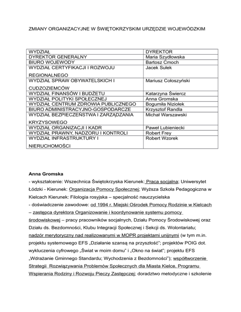 ZMIANY ORGANIZACYJNE W ŚWIĘTOKRZYSKIM URZĘDZIE WOJEWÓDZKIM WYDZIAŁ DYREKTOR GENERALNY BIURO WOJEWODY WYDZIAŁ CERTYFIKACJI I ROZWOJU DYREKTOR Maria Szydłowska Bartosz Cmoch Jacek Sułek REGIONALNEGO WYDZIAŁ SPRAW OBYWATELSKICH I Mariusz Cołoszyński CUDZOZIEMCÓW WYDZIAŁ FINANSÓW I BUDŻETU WYDZIAŁ POLITYKI SPOŁECZNEJ WYDZIAŁ CENTRUM ZDROWIA PUBLICZNEGO BIURO ADMINISTRACYJNO-GOSPODARCZE WYDZIAŁ BEZPIECZEŃSTWA I ZARZĄDZANIA Katarzyna Świercz Anna Gromska Bogumiła Niziołek Krzysztof Randla Michał Warszawski KRYZYSOWEGO WYDZIAŁ ORGANIZACJI I KADR WYDZIAŁ PRAWNY, NADZORU I KONTROLI WYDZIAŁ INFRASTRUKTURY I Paweł Lubieniecki Robert Frey Robert Wzorek NIERUCHOMOŚCI Anna Gromska - wykształcenie: Wszechnica Świętokrzyska Kierunek: Praca socjalna; Uniwersytet Łódzki - Kierunek: Organizacja Pomocy Społecznej; Wyższa Szkoła Pedagogiczna w Kielcach Kierunek: Filologia rosyjska – specjalność nauczycielska - doświadczenie zawodowe: od 1994 r. Miejski Ośrodek Pomocy Rodzinie w Kielcach – zastępca dyrektora Organizowanie i koordynowanie systemu pomocy środowiskowej – pracy pracowników socjalnych, Działu Pomocy Środowiskowej oraz Działu ds. Bezdomności, Klubu Integracji Społecznej i Sekcji ds. Wolontariatu; nadzór merytoryczny nad realizowanymi w MOPR projektami unijnymi (w tym m.in. projektu systemowego EFS „Działanie szansą na przyszłość”; projektów POIG dot. wykluczenia cyfrowego „Świat w moim domu” i „Okno na świat”; projektu EFS „Wdrażanie Gminnego Standardu; Wychodzenia z Bezdomności”); współtworzenie Strategii Rozwiązywania Problemów Społecznych dla Miasta Kielce, Programu Wspierania Rodziny i Rozwoju Pieczy Zastępczej; doradztwo metodyczne i szkolenie pracowników socjalnych; współpraca z organizacjami pozarządowymi działającymi w obszarze pomocy społecznej; - doświadczenie jako wykładowca akademicki na Uniwersytecie im. Jana Kochanowskiego w Kielcach, w Świętokrzyskiej Szkole Wyższej, w Wyższej Szkole Administracji Publicznej w Kielcach Bogumiła Niziołek: - wykształcenie: Akademia Medyczna w Lublinie kierunek: pielęgniarstwo; Uniwersytet Jagielloński Collegium Medicum, studia podyplomowe na kierunku: „Promocja zdrowia”; Uniwersytet Jagielloński Collegium Medicum studia podyplomowe na kierunku: „Zdrowie publiczne, administracja zdrowiem publicznym, zarządzanie szpitalem”, Wyższa Szkoła Nauk Społecznych i Technicznych w Radomiu, studia podyplomowe na kierunku: „Organizacja pomocy społecznej” - doświadczenie zawodowe: Starostwo Powiatowe w Skarżysku-Kamiennej, stanowisko: inspektor/główny specjalista ds. zdrowia; Policealna Szkoła Pracowników Służb Społecznych w Skarżysku-Kamiennej/Centrum Kształcenia Pracowników Służb Społecznych w Skarżysku-Kamiennej – nauczycielka; Medyczne Studium Zawodowe w Skarżysku – Kamiennej, stanowisko: nauczyciel; Oddział Wewnętrzny I Wojewódzkiego Szpitala Zespolonego w Radomiu, stanowisko: pielęgniarka Krzysztof Randla: - wykształcenie: Akademia Wychowania Fizycznego w Katowicach studia wyższe zawodowe trenerskie „Trener II klasy w piłce nożnej”; Akademia Wychowania Fizycznego w Katowicach studia mgr o kierunku „Wychowania fizycznego”; Akademia Ekonomiczna im. Karola Adamieckiego w Katowicach studia podyplomowe „Zarządzanie i przedsiębiorczość w oświacie” - 2002 – 2006 dyrektor Szkoła Podstawowa Nr 9 w Skarżysku-Kamiennej; 2006-2008 dyrektor Gimnazjum Nr 3 w Skarżysku-Kamiennej; 2008-2015 dyrektor Miejskiego Centrum Sportu i Rekreacji w Skarżysku-Kamiennej Michał Warszawski: - wykształcenie: Wyższa Szkoła Ubezpieczeń, Kielce kierunek Finanse i bankowość; Politechnika Radomska im. Kazimierza Pułaskiego, Radom, kierunek Ekonomia; Uniwersytet Jagielloński , Kraków, Zarządzanie Jakością w Organizacjach wg Normy ISO, studia podyplomowe ; Uniwersytet im. Marii Curie Skłodowskiej, Lublin, Rachunkowość, studia podyplomowe - doświadczenie zawodowe: 2003-2006 – pracownik Przedsiębiorstwo Usług Komunalnych sp. z o.o. w Kielcach natomiast od 2006 pracownik ŚUW: Inspektor w Biurze Zarządzania Funduszami Europejskimi; Kierownik Oddziału Systemu; Zastępca Dyrektora Wydziału Certyfikacji i Rozwoju Regionalnego; Kierownik Oddziału ds. Realizacji Programów Rozwojowych Paweł Lubieniecki: - wykształcenie: Wyższa Szkoła Pedagogiczna im. Jana Kochanowskiego kierunek: historia; Politechnika Świętokrzyska w Kielcach: Podyplomowe Studia Informatyki; Wyższa Szkoła Administracji Publicznej w Kielcach: Studia Podyplomowe w zakresie Administracji - doświadczenie zawodowe: od 2004 – 2007 Urząd m.st. Warszawy, Inspektor w Wydział Oświaty i Wychowania dla Dzielnicy Wola; 2007-2011Urząd Marszałkowski Województwa Świętokrzyskiego w Kielcach Główny specjalista w Zespole ds. Informatyzacji Województwa/ następnie Biurze Społeczeństwa Informacyjnego, 2011 – 2015 Urząd Marszałkowski Województwa Świętokrzyskiego w Kielcach, Główny specjalista - Koordynator Wieloosobowego Stanowiska ds. Eksploatacji Systemów Informatycznych dla Województwa Świętokrzyskiego w Biurze Społeczeństwa Informacyjnego, od 2015 r. Urząd Marszałkowski Województwa Świętokrzyskiego w Kielcach, Pełnomocnik ds. Wdrożenia EZD w Urzędzie Marszałkowskim Województwa Świętokrzyskiego, Departament Organizacyjno- Administracyjny i Wyższej Szkole Administracji Publicznej w Kielcach, wykładowca w WSAP w Kielcach Robert Frey - absolwent kierunku prawo na Wydziale Prawa i Administracji Uniwersytetu Jagiellońskiego, gdzie następnie w 2005 r. obronił doktorat; ukończył również studia podyplomowe z zakresu zarządzania na Akademii Ekonomicznej w Krakowie; odbył aplikację radcowską i po zdanym egzaminie został wpisany na listę radców prawnych, a następnie współpracował z jedną z największych warszawskich kancelarii prawnych - W ramach swojej kariery zawodowej zajmował stanowiska prezesa