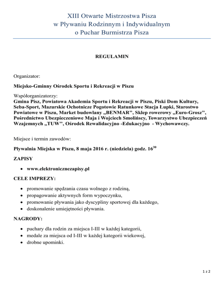 Regulamin 13. Otwartych Mistrzostw Pisza w Pływaniu08.05.2016 1
