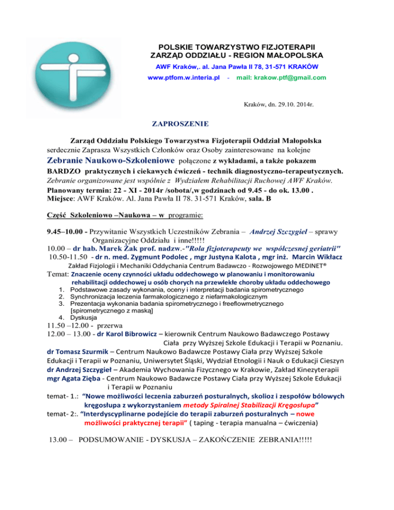 POLSKIE TOWARZYSTWO FIZJOTERAPII ZARZĄD ODDZIAŁU - REGION MAŁOPOLSKA AWF Kraków,. al. Jana Pawła II 78, 31-571 KRAKÓW www.ptfom.w.interia.pl - mail: [email protected] Kraków, dn. 29.10. 2014r. ZAPROSZENIE Zarząd Oddziału Polskiego Towarzystwa Fizjoterapii Oddział Małopolska serdecznie Zaprasza Wszystkich Członków oraz Osoby zainteresowane na kolejne Zebranie Naukowo-Szkoleniowe połączone z wykładami, a także pokazem BARDZO praktycznych i ciekawych ćwiczeń - technik diagnostyczno-terapeutycznych. Zebranie organizowane jest wspólnie z Wydziałem Rehabilitacji Ruchowej AWF Kraków. Planowany termin: 22 - XI - 2014r /sobota/,w godzinach od 9.45 - do ok. 13.00 . Miejsce: AWF Kraków. Al. Jana Pawła II 78. 31-571 Kraków, sala. B Część Szkoleniowo –Naukowa – w programie: 9.45–10.00 - Przywitanie Wszystkich Uczestników Zebrania – Andrzej Szczygieł – sprawy Organizacyjne Oddziału i inne!!!!! 10.00 – dr hab. Marek Żak prof. nadzw.-"Rola fizjoterapeuty we współczesnej geriatrii" 10.50-11.50 - dr n. med. Zygmunt Podolec , mgr Justyna Kalota , mgr inż. Marcin Wikłacz Zakład Fizjologii i Mechaniki Oddychania Centrum Badawczo - Rozwojowego MEDINET® Temat: Znaczenie oceny czynności układu oddechowego w planowaniu i monitorowaniu rehabilitacji oddechowej u osób chorych na przewlekłe choroby układu oddechowego 1. Podstawowe zasady wykonania, oceny i interpretacji badania spirometrycznego 2. Synchronizacja leczenia farmakologicznego z niefarmakologicznym 3. Prezentacja wykonania badania spirometrycznego i freeflowmetrycznego [spirometrycznego z maską] 4. Dyskusja 11.50 –12.00 - przerwa 12.00 – 13.00 - dr Karol Bibrowicz – kierownik Centrum Naukowo Badawczego Postawy Ciała przy Wyższej Szkole Edukacji i Terapii w Poznaniu. dr Tomasz Szurmik – Centrum Naukowo Badawcze Postawy Ciała przy Wyższej Szkole Edukacji i Terapii w Poznaniu, Uniwersytet Śląski, Wydział Etnologii i Nauk o Edukacji Cieszyn dr Andrzej Szczygieł – Akademia Wychowania Fizycznego w Krakowie, Zakład Kinezyterapii mgr Agata Zięba - Centrum Naukowo Badawcze Postawy Ciała przy Wyższej Szkole Edukacji i Terapii w Poznaniu temat- 1.: “Nowe możliwości leczenia zaburzeń posturalnych, skolioz i zespołów bólowych kręgosłupa z wykorzystaniem metody Spiralnej Stabilizacji Kręgosłupa” temat- 2:. “Interdyscyplinarne podejście do terapii zaburzeń posturalnych – nowe możliwości praktycznej terapii” ( taping - terapia manualna – ćwiczenia) 13.00 – PODSUMOWANIE - DYSKUSJA – ZAKOŃCZENIE ZEBRANIA!!!!! Zarząd Oddziału Polskiego Towarzystwa Fizjoterapii Oddział Małopolska prosi Członków o dokonanie opłaty składki członkowskiej w wysokości 70 PLN rocznie /zaległejbieżącej lub już za 2015 rok!!/. Opłatę można również wnieść na Zebraniu lub na konto bankowe Oddziału Małopolskiego Polskiego Towarzystwa Fizjoterapii – Millenium BIG Bank S.A Nr 79 1160 2202 0000 0000 1142 5691 Tylko Osoby, które mają uregulowane składki otrzymają legitymację członkowską oraz Zaświadczenie o uczestnictwie w kolejnym Zebraniu Naukowo-Szkoleniowym Polskiego Towarzystwa Fizjoterapii Oddział Małopolska. Łącząc pozdrowienia, W imieniu Zarządu: Sekretarz PTF OM mgr Joanna Czesak Prezes PTF OM dr Andrzej Szczygieł