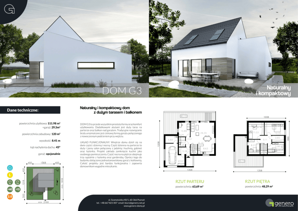 Naturalny i kompaktowy DOM G3 Naturalny i kompaktowy dom z dużym tarasem i balkonem Dane techniczne: powierzchnia użytkowa: 111.98 m2 +garaż: 29,5m2 powierzchnia zabudowy: 120 m2 wysokość: 8.41 m kąt nachylenia dachu: 45° garaż: opcjonalnie DOM G3 to przede wszystkim prostota formy oraz komfort użytkowania. Dodatkowymi atutami jest duży taras na parterze oraz balkon nad garażem. Tradycyjne rozwiązanie bryły urozmaicone jest ciekawą formą garażu połączonego z nowoczesnym podcieniem przy wejściu. UKŁAD FUNKCJONALNY: Wnętrze domu dzieli się na dwie części: dzienną i nocną. Część dzienna na parterze to duży i jasny salon połączony z jadalnią i kuchnią, gabinet oraz łazienka. Projekt zakłada zamknięcie kuchni jako osobnego pomieszczenia. Część nocna na piętrze obejmuje trzy sypialnie z łazienką oraz garderobą. Oprócz tego do budynku dołączono jednostanowiskowy garaż z kotłownią. Całość projektu jest bardzo funkcjonalna i zapewnia domownikom wygodne mieszkanie. L 1 x 2 x <40 <15 2.0 ul. Szamotulska 40/1, 60-366 Poznań tel. +48 667 821 007 email: [email protected] www.genero-domy.pl RZUT PARTERU RZUT PIĘTRA powierzchnia: 63,69 m2 powierzchnia: 48,29 m2