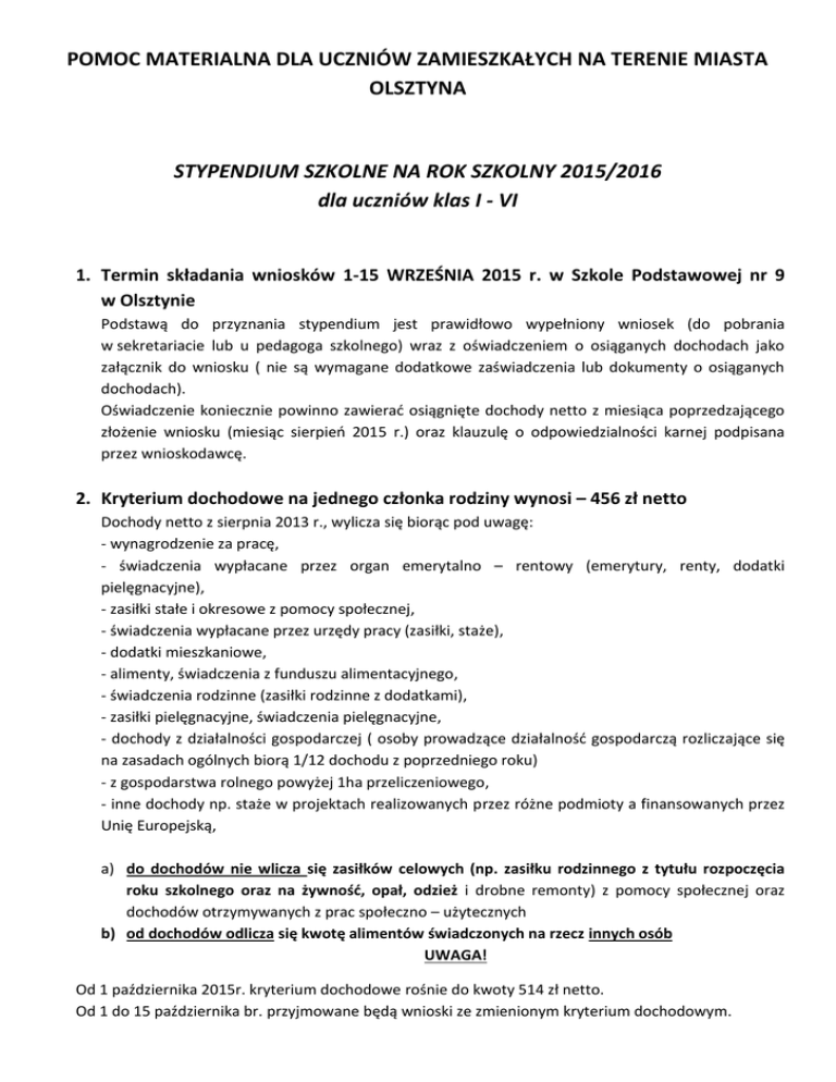 POMOC MATERIALNA DLA UCZNIÓW ZAMIESZKAŁYCH NA TERENIE MIASTA OLSZTYNA STYPENDIUM SZKOLNE NA ROK SZKOLNY 2015/2016 dla uczniów klas I - VI 1. Termin składania wniosków 1-15 WRZEŚNIA 2015 r. w Szkole Podstawowej nr 9 w Olsztynie Podstawą do przyznania stypendium jest prawidłowo wypełniony wniosek (do pobrania w sekretariacie lub u pedagoga szkolnego) wraz z oświadczeniem o osiąganych dochodach jako załącznik do wniosku ( nie są wymagane dodatkowe zaświadczenia lub dokumenty o osiąganych dochodach). Oświadczenie koniecznie powinno zawierać osiągnięte dochody netto z miesiąca poprzedzającego złożenie wniosku (miesiąc sierpień 2015 r.) oraz klauzulę o odpowiedzialności karnej podpisana przez wnioskodawcę. 2. Kryterium dochodowe na jednego członka rodziny wynosi – 456 zł netto Dochody netto z sierpnia 2013 r., wylicza się biorąc pod uwagę: - wynagrodzenie za pracę, - świadczenia wypłacane przez organ emerytalno – rentowy (emerytury, renty, dodatki pielęgnacyjne), - zasiłki stałe i okresowe z pomocy społecznej, - świadczenia wypłacane przez urzędy pracy (zasiłki, staże), - dodatki mieszkaniowe, - alimenty, świadczenia z funduszu alimentacyjnego, - świadczenia rodzinne (zasiłki rodzinne z dodatkami), - zasiłki pielęgnacyjne, świadczenia pielęgnacyjne, - dochody z działalności gospodarczej ( osoby prowadzące działalność gospodarczą rozliczające się na zasadach ogólnych biorą 1/12 dochodu z poprzedniego roku) - z gospodarstwa rolnego powyżej 1ha przeliczeniowego, - inne dochody np. staże w projektach realizowanych przez różne podmioty a finansowanych przez Unię Europejską, a) do dochodów nie wlicza się zasiłków celowych (np. zasiłku rodzinnego z tytułu rozpoczęcia roku szkolnego oraz na żywność, opał, odzież i drobne remonty) z pomocy społecznej oraz dochodów otrzymywanych z prac społeczno – użytecznych b) od dochodów odlicza się kwotę alimentów świadczonych na rzecz innych osób UWAGA! Od 1 października 2015r. kryterium dochodowe rośnie do kwoty 514 zł netto. Od 1 do 15 października br. przyjmowane będą wnioski ze zmienionym kryterium dochodowym. 3. Wykaz zaakceptowanych wydatków na pomoc o charakterze edukacyjnym, które podlegają zwrotowi na podstawie rachunków, faktur VAT i innych imiennych dokumentów potwierdzających poniesione wydatki na: 1) zakup podręczników, lektur szkolnych, encyklopedii, słowników, atlasów, tablic matematycznych, 2) zakup zestawów komputerów, laptopów, tabletów, specjalistycznych edukacyjnych programów komputerowych oraz akcesoriów komputerowych, pamięci USB, płyt CD, papieru do drukarki, tuszy do drukarki, 3) zakup przyborów szkolnych w tym zeszytów, długopisów, piórników, plecaków szkolnych, tornistrów, bloków, flamastrów, temperówek, kredek, ołówków, piór, gumek, kleju, farb, pędzelków, papieru kolorowego, kancelaryjnego, milimetrowego, brystolu, nożyczek, taśmy klejącej, modeliny, plasteliny, korektorów, przyborów geometrycznych, kalkulatorów itp., 4) zakup stroju sportowego za WF (obuwie sportowe, koszulka, spodenki sportowe, dresy, kurtka sportowa), 5) pokrycie kosztów transportu środkami komunikacji zbiorowej do i ze szkoły, w której uczeń pobiera naukę lub zajęcia pozalekcyjne, 6) pokrycie kosztów zakupu sprzętu, akcesoriów, instrumentów, itp., związanych z zainteresowaniami ucznia, 7) pokrycie kosztów dodatkowo płatnych zajęć edukacyjnych (np. wyrównawczych, językowych, tanecznych, artystycznych, kół zainteresowań), 8) pokrycie kosztów abonamentu internetowego, 9) pokrycie wyjazdów na wycieczki szkolne, zielone szkoły, wyjścia klasowe na basen, do teatru, kina, muzeum itp., 10) zakup szkolnego stroju galowego, mundurka szkolnego, 11) zakup biurka szkolnego oraz krzesła do biurka, 4. Termin rozliczenia stypendium szkolnego przyznanego decyzja MOPS na okres: a) Od 01 września do 31 grudnia należy rozliczyć do dnia 15 grudnia 2015 r. w pokoju nr 9 w godzinach 9:00-14:00. b) Od 01 stycznia 2014 r. do 30 czerwca 2016r. należy rozliczyć do dnia 30 czerwca2016 r. Nieterminowe rozliczenie stypendium będzie skutkowało brakiem refundacji poniesionych wydatków. 5. Rozliczenie stypendium Osoby ubiegające się o stypendium szkolne przy każdorazowym zakupie w/w artykułów szkolnych powinny żądać w miejscu zakupu imiennych faktur VAT potwierdzających poniesione wydatki, które są podstawą do rozliczenia stypendium szkolnego. Paragony nie dokumentują poniesionych wydatków i nie będą brane pod uwagę. Faktury VAT świadczeniobiorcy przedłożą w w/w terminach a Miejskim Ośrodku Pomocy Społecznej w Olsztynie w pokoju nr 9, w godzinach 9:00 – 14:00, tel. 89 534 65 25, e-mail: [email protected] 6. W przypadku jakichkolwiek zmian świadczeniobiorcy powinni poinformować organ wydający decyzje w przedmiotowej sprawie o: 1) 2) 3) 4) Zmianie szkoły, umieszczeniu dziecka w ośrodkach lub innych instytucjach, Zmianie adresu zamieszkania, Zmianie numeru konta bankowego, Zmianie osiąganych dochodów. ZASIŁEK SZKOLNY Zasiłek szkolny przyznawany jest dla ucznia, który przejściowo znalazł się w trudnej sytuacji życiowej z powodu zdarzenia losowego, w szczególności gdy umiera jedno z rodziców lub opiekunów, w rodzinie wystąpiła ciężka choroba (rodzica, rodzeństwa, ucznia) lub gospodarstwo domowe dotknęło inne zdarzenia losowe, np. pożar, powódź). Wniosek o zasiłek szkolny wraz z oświadczeniem o dochodach ( w załączeniu) i zaświadczeniu o zaistniałej sytuacji (np. akt zgonu, karta informacyjna ze szpitala itp., zaświadczenie z innej instytucji tj. komenda, straż pożarna…) należy złożyć nie później niż przed upływem dwóch miesięcy od zaistniałego zdarzenia. Zasiłek szkolny może być przyznany w formie świadczenia pieniężnego na pokrycie wydatków związanych z procesem edukacyjnym raz lub kilka razy w roku niezależnie od otrzymywanego stypendium szkol