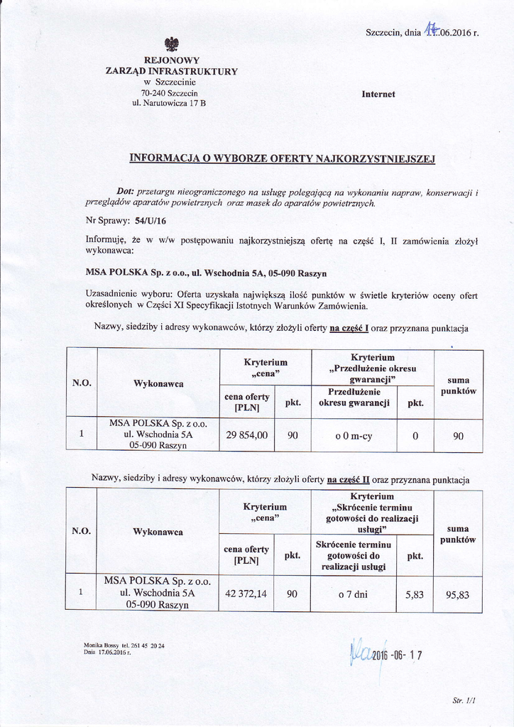 Szczecin, onia4F..oo.zoro r. REJONOWY zARzĄD INFRASTRUKTURY w Szczecinie 70-240 Szczecin ul. Narutowicza17 B Internet Dot: przetargu nieograniczonegona ustugępolegajqcq na wykonaniu napraw, konserwacji i przeglqdów aparatów powietrzrtych oraz masekdo aparatów powietrznych, Nr Sprawy: 54ful16 Informuję,że w w/w postępowaniunajkorzystniejsząofeńę na częśóI, II zamówienia złoĄt wyKonawca: MSA POLSKA Sp. z o.o.,ul. lVschodnia 5A, 0S.090Rasryn Uzasadnieniewyboru: oferta uzyskałanajwiększąilośópunktów w świetlekryteriów oceny ofert określonychw CzęściXI SpecyfikacjiIstotnychWarunkówZamówienia. Nazwy' siedziby i adresywykonawców, którzy złoĘli of€rty na cześćI oraz ptzyznanapunktacja Kryteńum N.O. Wykonawca MSA POLSKA Sp. z o.o. ul. Wschodnia5A 05-090Raszvn ,rcena" Kryteńum ''Przedłużenieokresu gwarancjitt cena oferty [PLNI pkt. Przedłużenie okresu gwarancji pkt. 29 854,00 90 o 0 m-cy 0 suma punktów 90 Nazwy, siedziby i adresywykonawców, którzy złozyli ofeĄ na cześćII oraz przyznanapunktacja Kr}teńum N.O. 1 'Wykonawca MSA POISKA Sp. z o.o. u].Wschodnia5A 05-090Raszyn MonikaBossy rel26145 m24 Dnia 17.06.2016 r. ,rcena" Kryteńum ''Skrócenie terminu gotowoŚcido rea|izacji usługi'' cena oferty IPLN] pkt. Skrócenie terminu gotowości do realizacji usługi pkt 42372,1,4 90 oTdni sRą suma punktów 95,83 I 1.. -06-1 7 _".2016 str.l/1