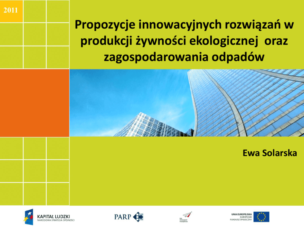 2011 Propozycje innowacyjnych rozwiązao w produkcji żywności ekologicznej oraz zagospodarowania odpadów Ewa Solarska Znaczenie żywności ekologicznej dla zdrowia człowieka • Stosowanie wiedzy wywodzącej się z rolnictwa to nowoczesna medycyna. Niepodważalnym jest bowiem fakt, że zdrowe, o wysokich walorach odżywczych produkty roślinne i zwierzęce są podstawą utrzymania zdrowia i zapobiegania chorobom. Znaczenie żywności ekologicznej dla zdrowia człowieka • Główną przyczyną wielu chorób chronicznych takich jak choroby serca, cukrzyca, rak, osteoporoza i inne jest długotrwały niedobór mikroelementów i innych niezbędnych składników odżywczych. Znaczenie żywności ekologicznej dla zdrowia człowieka Milligramy w 100 g produktu w 1985 w 1996 pomiędzy Zmiana 1985 - 1996 ____________________________________________________________________________________ ______________ Wapo Magnez 14 27 4 18 -70% -33% Kwas Foliowy 23 Witamina B6 330 3 22 -87% -93% Wapo Witamina C 18 13 -14% -80% 21 60 Źródło: J.Am.Coll. Nutr.(2004) 669-682 Znaczenie żywności ekologicznej dla zdrowia człowieka • Przyczyna – intensyfikacja rolnictwa • Nadmierne stosowanie nawozów sztucznych degraduje glebę i zubaża ją w wiele mikroelementów. Znaczenie żywności ekologicznej dla zdrowia człowieka • Pełnowartościowa żywnośd • Stosowanie prawidłowego następstwa roślin i nawożenia organicznego jest warunkiem żyzności gleby i dobrego zaopatrzenia roślin w składniki pokarmowe. Znaczenie żywności ekologicznej dla zdrowia człowieka • Porównanie jakości produktów ekologicznych i konwencjonalnych jeśli zawartośd azotanów w produktach konwencjonalnych przyjmiemy za 100%, to zawartośd tych związków w produktach ekologicznych wynosi średnio 49% poziom pozostałości pestycydów jest istotnie niższy w ekologicznych produktach Zawartośd substancji biologicznie czynnych i składników mineralnych w produktach ekologicznych w porównaniu z konwencjonalnymi Liczba badao Substancje i składniki Różnice w % wit. C + 28,7 21 substancje fenolowe +119,3 15 żelazo + 21,1 16 magnez + 29,3 17 fosfor +13,6 19 Źródło: Rembiałkowsjka E.: Jakość zieniopłodów z rolnictwa ekologicznego, SGGW 2004 Wpływ paszy z uprawy ekologicznej i konwencjonalnej na płodnośd królików System uprawy I pokolenie II pokolenie Procent zapłodnionych samic konwencjonalny 58 59 ekologiczny 58 86 Liczba królików w miocie konwencjonalny 5,6 4,9 ekologiczny 6,2 6,4 Źródło: IFOAM Bulletin, 1988. (4), 9-12. Znaczenie żywności ekologicznej dla zdrowia człowieka • Jedzenie – lekiem • Światowy Fundusz Badao nad Rakiem (WCRF) opublikował wyniki badao dotyczące porównania wpływu różnych rodzajów żywności na nowotwory. Znaczenie żywności ekologicznej dla zdrowia człowieka • Żywnośd ekologiczna lekiem • W wyniku tych badao zalecono chorym na nowotwór jeśd żywnośd ekologiczną, kiedy to tylko możliwe. Wsparcie z Unii Europejskiej dla przedsiębiorców • KE podjęła się wspierad partnerstwo w obszarze wiedzy oraz umacniad powiązania między światem nauki, biznesu, badao i innowacji, pomagając młodym innowacyjnym przedsiębiorstwom. Możliwości tworzenia lub modernizacji firm przetwórczych żywności ekologicznej • Potrzeba przeprowadzenia badao pod kątem wykorzystania w praktyce • Ekologiczne metody przetwórstwa mięsa i wyrobu produktów mięsnych bez stosowania dodatków azotanów i azotynów z uwzględnieniem produktów. wydłużania trwałości przechowalniczej tych Możliwości tworzenia lub modernizacji firm przetwórczych żywności ekologicznej • Potrzeba przeprowadzenia badao pod kątem wykorzystania w praktyce • Ekologiczne metody produkcji pieczywa i produktów zbożowych oraz metody wydłużania trwałości, przechowalniczych tych wyrobów. świeżości i parametrów Możliwości tworzenia lub modernizacji firm przetwórczych żywności ekologicznej • Potrzeba przeprowadzenia badao pod kątem wykorzystania w praktyce • Ekologiczne metody przetwórstwa owoców i warzyw z uwzględnieniem właściwości prozdrowotnych otrzymywanych produktów. Przykłady współpracy nauki z firmami produkującymi żywnośd ekologiczną • Ocena jakości produktów zbożowych Firmy SymBio Polska S.A. oraz opracowanie technologii produkcji i przechowywania ekologicznych zbóż – badania prowadzone przez UP w Lublinie w ramach projektu złożonego do finansowania przez Ministerstwo Rolnictwa i Rozwoju Wsi. Przykłady współpracy nauki z firmami produkującymi żywnośd ekologiczną • Zakłady Mięsne Jasiołka "JK" Sp. z o.o. z Dukli we współpracy z UP w Lublinie w wyprodukowały wysokiej jakości wędliny ekologiczne jagnięce i wieprzowe z grupy dojrzewających o zmniejszonej zawartości związków azotowych również w ramach projektu finansowanego przez MRiRW. Zagospodarowanie odpadów • Śmieci mogą byd wykorzystane jako źródło korzyści energetycznych. • Śmieci mają swoją wymierną wartośd – są źródłem surowców wtórnych, biomasy do produkcji biogazu oraz paliwem, które w spalarni zamienia się w energię, ciepło i parę. Zagospodarowanie odpadów • W bieżącym roku na mocy ustawy polskie gminy stały się właścicielami odpadów. • Jest to krok w dobrym kierunku, lecz sukcesy z funkcjonowania systemu sortowania odpadów będą wynikad nie z samych regulacji prawnych, co bardziej z edukacji i trzymania się zdrowych zasad ekonomii. Zagospodarowanie odpadów • Szwedzki model gospodarowania odpadami wzorem systemu ekologicznego • 35% odpadów ponownie używanych • 12-13% poddawanych obróbce biologicznej (biogaz) • Składowanie odpadów na wysypiskach generuje dużo metanu i innych tzw. gazów cieplarnianych, a w przypadku samozapłonu jest źródłem trujących dioksyn. Zagospodarowanie odpadów • Przetwarzanie odpadów w obiegu zamkniętym nie szkodzi środowisku, a zamiast tego po uszlachetnie