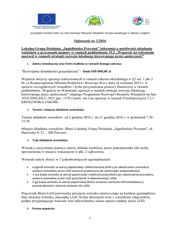 Ogłoszenie nr 2/2016 Lokalna Grupa Działania „Jagiellońska Przystań” informuje o możliwości składania wniosków o przyznanie pomocy w ramach poddziałania 19.2 „Wsparcie na wdrażanie operacji w ramach strategii rozwoju lokalnego kierowanego przez społeczność” 1. Zakres tematyczny oraz limit środków w ramach danego zakresu: ”Rozwijanie działalności gospodarczej” – limit 650 000,00 zł Wsparcie dotyczy operacji realizowanych w ramach zakresu określonego w §2 ust. 1 pkt 2 lit. c) Rozporządzenia Ministra Rolnictwa i Rozwoju Wsi z dnia 24 września 2015 r. w sprawie szczegółowych warunków i trybu przyznawania pomocy finansowej w ramach poddziałania „Wsparcie na Wdrażanie operacji w ramach strategii rozwoju lokalnego kierowanego przez społeczność” objętego Programem Rozwoju Obszarów Wiejskich na lata 2014-2020 (Dz.U.2015 poz. 1570 z późn. zm.) na operacje w ramach Przedsięwzięcia 2.2.1 KRÓLEWSKA JAKOŚĆ. 2. Termin i miejsce składania wniosków: Termin składania wniosków: od 5 grudnia 2016 r. do 21 grudnia 2016 r. w godzinach 7.30 – 15.30. Miejsce składania wniosków: Biuro Lokalnej Grupy Działania „Jagiellońska Przystań”, ul. Harcerska 8, 21 – 200 Parczew. 3. Tryb składania wniosków: Wnioski o przyznanie pomocy należy składać osobiście, przez pełnomocnika lub osobę upoważnioną w miejscu wskazanym w pkt. 2 ogłoszenia. Wniosek należy złożyć w 3 jednobrzmiących egzemplarzach: oryginał wniosku w wersji papierowej i elektronicznej (który po zakończeniu procedury wyboru wniosków przez LGD zostanie przekazany do samorządu województwa), 1-sza kopia wniosku w wersji papierowej i elektronicznej (która po zakończeniu procedury wyboru wniosków przez LGD pozostanie w dokumentacji LGD), 2-ga kopia wniosku w wersji papierowej (która zostanie zwrócona Wnioskodawcy z potwierdzeniem złożenia wniosku do LGD). Pracownik Biura LGD potwierdza przyjęcie wniosku umieszczając na każdym egzemplarzu: datę złożenia wniosku, pieczątkę LGD, liczbę złożonych wraz z wnioskiem załączników, podpis przyjmującego wniosek oraz indywidualny numer sprawy nadany przez LGD. 4. Forma wsparcia: 1 W przypadku wniosków składanych w ramach zakresu określonego w pkt. 1 ogłoszenia pomoc ma formę refundacji poniesionych kosztów kwalifikowalnych: maksymalna wysokość kwoty pomocy wynosi 300 000,00 zł, intensywność pomocy wynosi 70%. 5. Warunki udzielenia wsparcia w ramach naboru Podstawowymi warunkami udzielenia wsparcia są: Złożenie wniosku w miejscu i terminie podanym w ogłoszeniu o naborze. Zgodność operacji z zakresem tematycznym, który został wskazany w ogłoszeniu o naborze. Zgodność operacji z formą wsparcia wskazaną w ogłoszeniu o naborze (refundacja). Zgodność operacji z Lokalną Strategią Rozwoju Lokalnej Grupy Działania „Jagiellońska Przystań” na lata 2016 – 2022. Zgodność operacji z lokalnymi kryteriami wyboru operacji oraz uzyskanie minimalnej liczby punktów. Zgodność operacji z warunkami przyznania pomocy określonymi w PROW na lata 2014 2020. 6. Kryteria wyboru operacji: Kryteria wyboru wraz ze wskazaniem minimalnej liczby punktów, której uzyskanie jest niezbędne do pozytywnej oceny wniosku udostępniono poniżej. Minimalna liczba punktów konieczna do uzyskania pozytywnej oceny operacji wynosi 40 punktów. 7. Informacja o wymaganych dokumentach: Wykaz wymaganych załączników składanych wraz z wnioskiem zawiera wzór formularza wniosku. Ponadto do wniosku należy dołączyć załączniki potwierdzające spełnienie kryteriów wyboru operacji (w odniesieniu do których jest to wymagane). 8. Planowane do osiągnięcia wskaźniki: W przypadku wniosków składanych w ramach zakresu określonego w pkt. 1 ogłoszenia – (zał. nr 1 do Wytycznych nr 2/1/2016) – udostępniono poniżej. 9. Miejsce udostępnienia dokumentów: 2 Formularz wniosku o udzielenie wsparcia, formularz umowy, formularz wniosku o płatność, Lokalna Strategia Rozwoju LGD „Jagiellońska Przystań” wraz z załącznikami, procedura oceny i wyboru operacji, opis kryteriów wyboru operacji oraz planowane do osiągnięcia wskaźniki udostępniono poniżej: 1). Ogłoszenie o naborze wniosków nr 2/2016 – otwórz 2). Formularz wniosku o przyznanie pomocy (wersja 2z) Wniosek o przyznanie pomocy (pdf) – wersja 2z – otwórz Wniosek o przyznanie pomocy (excel) – wersja 2z – otwórz Instrukcja wypełniania wniosku o przyznanie pomocy (pdf) (wersja 2z) – otwórz 3). Biznesplan (wersja 2z) Biznesplan (pdf) – otwórz Biznesplan (docx) – otwórz Informacje pomocnicze przy wypełnianiu biznesplanu (pdf) – otwórz 4). Oświadczenie podmiotu ubiegającego się o przyznanie pomocy o wielkości przedsiębiorstwa Oświadczenie podmiotu ubiegającego się o przyznanie pomocy o wielkości przedsiębiorstwa (pdf) – otwórz Oświadczenie podmiotu ubiegającego się o przyznanie pomocy o wielkości przedsiębiorstwa (exel) – otwórz Zasady wypełniania Oświadczenia podmiotu ubiegającego się o przyznanie pomocy o wielkości przedsiębiorstwa – otwórz 5). Formularz umowy o przyznaniu pomocy (wersja 2z) Umowa o przyznaniu pomocy (pdf) – otwórz Załącznik 1 Zestawienie finansowo-rzeczowe operacji (pdf) - otwórz Załącznik 2 Wykaz działek ewidencyjnych (pdf) - otwórz Załącznik 3 Zasady konkurencyjności wydatków (pdf) - otwórz Załącznik 4 Wskaźniki procentowe do obliczenia wartości kar administracyjnych za naruszenie zasad konkurencyjności wydatków w ramach PROW 2014-2020 (pdf) - otwórz Załącznik 5 Kary administracyjne za naruszenie przepisów zamówień publicznych (pdf) otwórz Załącznik 5 A Kary administracyjne za naruszenie przepisów o zamówieniach publicznych po wejściu w życie ustawy z dnia 22 czerwca 2016 r. o zmianie ustawy – Prawo zamówień publicznych oraz niektórych innych ustaw (Dz. U. poz. 1020) (pdf) - otwórz 6). Formularz wniosku o płatność (wersja 2z) Wnio