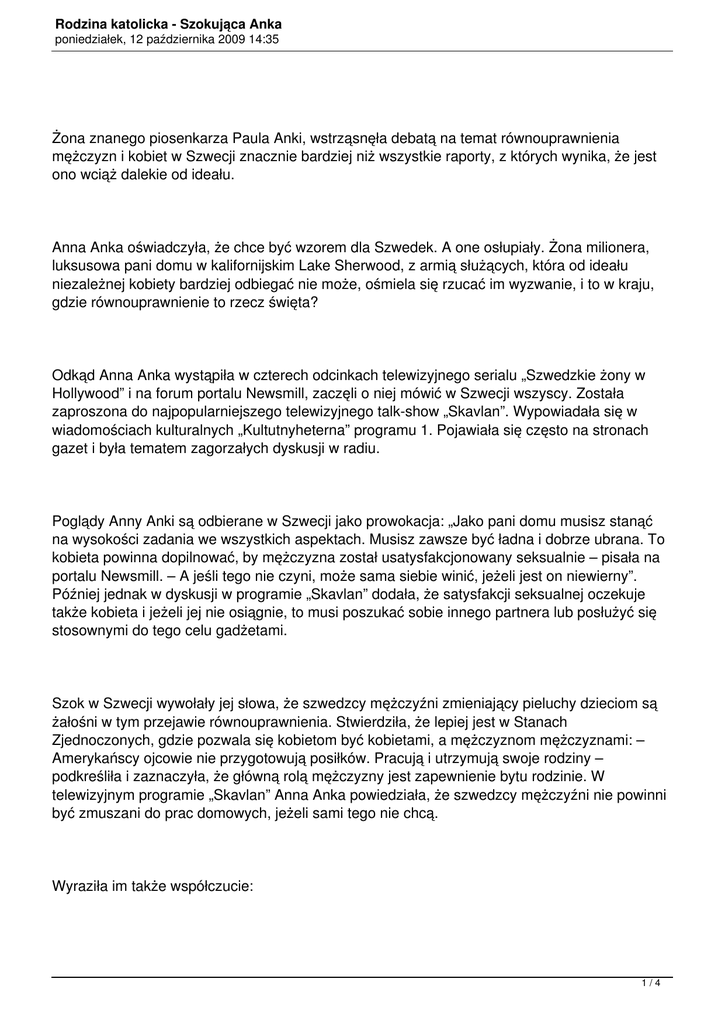 Rodzina katolicka - Szokująca Anka poniedziałek, 12 października 2009 14:35 Żona znanego piosenkarza Paula Anki, wstrząsnęła debatą na temat równouprawnienia mężczyzn i kobiet w Szwecji znacznie bardziej niż wszystkie raporty, z których wynika, że jest ono wciąż dalekie od ideału. Anna Anka oświadczyła, że chce być wzorem dla Szwedek. A one osłupiały. Żona milionera, luksusowa pani domu w kalifornijskim Lake Sherwood, z armią służących, która od ideału niezależnej kobiety bardziej odbiegać nie może, ośmiela się rzucać im wyzwanie, i to w kraju, gdzie równouprawnienie to rzecz święta? Odkąd Anna Anka wystąpiła w czterech odcinkach telewizyjnego serialu „Szwedzkie żony w Hollywood” i na forum portalu Newsmill, zaczęli o niej mówić w Szwecji wszyscy. Została zaproszona do najpopularniejszego telewizyjnego talk-show „Skavlan”. Wypowiadała się w wiadomościach kulturalnych „Kultutnyheterna” programu 1. Pojawiała się często na stronach gazet i była tematem zagorzałych dyskusji w radiu. Poglądy Anny Anki są odbierane w Szwecji jako prowokacja: „Jako pani domu musisz stanąć na wysokości zadania we wszystkich aspektach. Musisz zawsze być ładna i dobrze ubrana. To kobieta powinna dopilnować, by mężczyzna został usatysfakcjonowany seksualnie – pisała na portalu Newsmill. – A jeśli tego nie czyni, może sama siebie winić, jeżeli jest on niewierny”. Później jednak w dyskusji w programie „Skavlan” dodała, że satysfakcji seksualnej oczekuje także kobieta i jeżeli jej nie osiągnie, to musi poszukać sobie innego partnera lub posłużyć się stosownymi do tego celu gadżetami. Szok w Szwecji wywołały jej słowa, że szwedzcy mężczyźni zmieniający pieluchy dzieciom są żałośni w tym przejawie równouprawnienia. Stwierdziła, że lepiej jest w Stanach Zjednoczonych, gdzie pozwala się kobietom być kobietami, a mężczyznom mężczyznami: – Amerykańscy ojcowie nie przygotowują posiłków. Pracują i utrzymują swoje rodziny – podkreśliła i zaznaczyła, że główną rolą mężczyzny jest zapewnienie bytu rodzinie. W telewizyjnym programie „Skavlan” Anna Anka powiedziała, że szwedzcy mężczyźni nie powinni być zmuszani do prac domowych, jeżeli sami tego nie chcą. Wyraziła im także współczucie: 1/4 Rodzina katolicka - Szokująca Anka poniedziałek, 12 października 2009 14:35 – Szkoda mi szwedzkich mężczyzn. Żenią się z ładnymi kobietami, które szybko stają się nieatrakcyjne, zaczynają się niedbale ubierać i nie przejmują się potrzebami mężczyzn. Wielu z nich musi zadawać sobie pytanie, dlaczego się ożenili, i nic dziwnego, że tak wielu się rozwodzi – zawyrokowała. Przeciw prawu Jante Anna Anka urodziła się w Polsce przed niespełna 40 laty. W wieku trzech i pół roku została zabrana z domu dziecka i adoptowana przez szwedzką rodzinę z Bjuv w południowej Szwecji. Nie wspomina jej dobrze. – Mojej mamy nigdy nie było w domu, zawsze gdzieś szła tańczyć lub bawiła się na imprezach ze swoimi przyjaciółkami. Mój tata był alkoholikiem i co tydzień się upijał – opowiadała w programie telewizyjnym „Szwedzkie żony w Hollywood”. Anna zerwała ze swoimi rodzicami, gdy miała 15 lat. Przeprowadziła się do innego miasta i aż do osiągnięcia pełnoletności wychowywała ją inna rodzina. W wieku lat 21 Anna Anka wyjechała do Stanów Zjednoczonych. Zwyciężyła tam w finale międzynarodowego konkursu piękności Hawaiian Tropic. W Hollywood pracowała jako osobisty trener zamożnych ludzi, oferując prowadzenie ćwiczeń poprawiających kondycję fizyczną, i tam właśnie poznała znacznie od niej starszego piosenkarza Paula Ankę. Anna Anka deklaruje, że USA stały się jej ojczyzną od pierwszych chwil pobytu, bo nie obowiązuje tu Jantelagen (prawo Jante), zespół reguł mówiących, że w społeczeństwie nikt nie może wyróżniać się bardziej od innych. Nikt też nie ma prawa uważać się za kogoś lepszego od innych. Zasady te sformułował Axel Sandemose, norweski pisarz, w powieści z 1933 roku „Uciekinier przecina swój ślad” opisującej miasto Jante. Choć przeobrażenia społeczne zrewolucjonizowały myślenie Szwedów, Jantelagen nadal jest żywe w Szwecji. Anna Anka prawo to pogwałciła, krytykując między innymi fakt, że w Szwecji nie wypada odnosić sukcesów i zarabiać dużych pieniędzy. Anna Anka krytykowała też Szwedów za to, że mają inne nastawienie niż Amerykanie do kwestii prac domowych i innych usług. Ona sama wynajmuje ludzi do gotowania, sprzątania i pielęgnacji ogrodu. Zatrudnia też masażystkę, manicurzystkę, fryzjerkę, opiekunkę do dzieci. Gdyby Szwedzi chcieli iść w ten sposób w ślady Amerykanów, to mieliby dla siebie więcej czasu. Tymczasem przychodzą do domu źli, że muszą gotować, sprzątać i prasować, ulegając lewicowej i feministycznej presji. Centroprawicowy rząd wprowadził możliwość odpisywania sum wydanych na pomoc domową od podatku, ale lewica traktuje to jako zachętę do niegodnego wykorzystywania taniej siły roboczej imigrantów, a feministki – jako zamach na równouprawnienie kobiet i mężczyzn. 2/4 Rodzina katolicka - Szokująca Anka poniedziałek, 12 października 2009 14:35 To anachroniczne brednie Poglądy Anny Anki znalazły odzew wśród polityków. Sekretarz generalny Chrześcijańskich Demokratów Lennart Sjögren zaproponował jej, by wstąpiła do partii. – Wszyscy, którzy podzielają nasze poglądy dotyczące znaczenia rodziny w społeczeństwie, są u nas mile widziani – oświadczył. Jednak niedługo po tym został zakrzyczany przez chadeczki, które orzekły, że rola kobiety nie może być zredukowana do bycia maskotką mężczyzny, i wycofał ofertę. – To sztorm w stawie kaczek („Anka” to po szwedzku kaczka) – skomentował lider chadecji i minister spraw socjalnych Göran Hägglund świadomy tego, że poglą