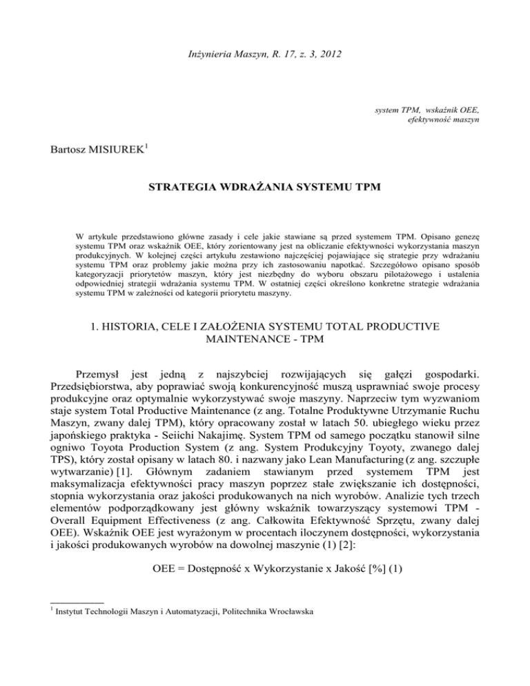 InŜynieria Maszyn, R. 17, z. 3, 2012 system TPM, wskaźnik OEE, efektywność maszyn Bartosz MISIUREK1 STRATEGIA WDRAśANIA SYSTEMU TPM W artykule przedstawiono główne zasady i cele jakie stawiane są przed systemem TPM. Opisano genezę systemu TPM oraz wskaźnik OEE, który zorientowany jest na obliczanie efektywności wykorzystania maszyn produkcyjnych. W kolejnej części artykułu zestawiono najczęściej pojawiające się strategie przy wdraŜaniu systemu TPM oraz problemy jakie moŜna przy ich zastosowaniu napotkać. Szczegółowo opisano sposób kategoryzacji priorytetów maszyn, który jest niezbędny do wyboru obszaru pilotaŜowego i ustalenia odpowiedniej strategii wdraŜania systemu TPM. W ostatniej części określono konkretne strategie wdraŜania systemu TPM w zaleŜności od kategorii priorytetu maszyny. 1. HISTORIA, CELE I ZAŁOśENIA SYSTEMU TOTAL PRODUCTIVE MAINTENANCE - TPM Przemysł jest jedną z najszybciej rozwijających się gałęzi gospodarki. Przedsiębiorstwa, aby poprawiać swoją konkurencyjność muszą usprawniać swoje procesy produkcyjne oraz optymalnie wykorzystywać swoje maszyny. Naprzeciw tym wyzwaniom staje system Total Productive Maintenance (z ang. Totalne Produktywne Utrzymanie Ruchu Maszyn, zwany dalej TPM), który opracowany został w latach 50. ubiegłego wieku przez japońskiego praktyka - Seiichi Nakajimę. System TPM od samego początku stanowił silne ogniwo Toyota Production System (z ang. System Produkcyjny Toyoty, zwanego dalej TPS), który został opisany w latach 80. i nazwany jako Lean Manufacturing (z ang. szczupłe wytwarzanie) [1]. Głównym zadaniem stawianym przed systemem TPM jest maksymalizacja efektywności pracy maszyn poprzez stałe zwiększanie ich dostępności, stopnia wykorzystania oraz jakości produkowanych na nich wyrobów. Analizie tych trzech elementów podporządkowany jest główny wskaźnik towarzyszący systemowi TPM Overall Equipment Effectiveness (z ang. Całkowita Efektywność Sprzętu, zwany dalej OEE). Wskaźnik OEE jest wyraŜonym w procentach iloczynem dostępności, wykorzystania i jakości produkowanych wyrobów na dowolnej maszynie (1) [2]: OEE = Dostępność x Wykorzystanie x Jakość [%] (1) ___________ 1 Instytut Technologii Maszyn i Automatyzacji, Politechnika Wrocławska 120 Bartosz MISIUREK Seiichi Nakajima opracowując wzór OEE przyjął wartość docelową tego wskaźnika na poziomie niemniejszym niŜ 85%. Wartość ta określona została jako iloczyn [2]: • dostępności maszyn na poziomie minimum 90%, • wykorzystania maszyn na poziomie minimum 95%, • jakości wytwarzanych wyrobów na poziomie minimum 99%. Analiza OEE rozpoczyna się od określenia całkowitego czasu produkcji, w którym moŜna produkować (czas brutto), następnie od tego czasu odejmuje się planowane przestoje (śniadanie, czas na sprzątanie linii itp.). Dostępność określa procentowo stopień dostępności maszyn dla operatora w czasie pomniejszonym o planowane przerwy. Najczęściej w przedsiębiorstwach produkcyjnych nad poprawą dostępności pracują działy utrzymania ruchu i inŜynierów procesu. Na pogorszenie dostępności wpływ mają awarie oraz przezbrojenia maszyn. Wykorzystanie określa się jako procentowy stopień wykorzystania dostępnego czasu maszyn przez operatorów. Na wykorzystanie dostępnego czasu mają wpływ wszystkie czynności wykonywane podczas produkcji, np. odpowiednia sekwencja pracy na stanowisku, drobne przestoje, oczekiwanie na materiał. Ostatnim elementem uŜywanym do obliczenia OEE jest jakość, która uwzględnia wszelkie straty z powodu wyprodukowania produktów niespełniających standardów jakości, wliczając w to braki [1]. Wszelkie działania mające na celu poprawę wskaźnika OEE zorientowane są na eliminację sześciu wielkich strat, które zostały wyznaczone przez Nakajimę. W tabeli 1 zestawiono korelację pomiędzy sześcioma głównymi stratami a poszczególnymi elementami składającymi się na wskaźnik OEE [3]. Tabela 1. Korelacja pomiędzy sześcioma wielkimi stratami a wskaźnikiem OEE Table 1. The correlation between six big losses and OEE factor L.P. Sześć wielkich strat Wpływ na element wskaźnika OEE Dostępność 1 Awarie 2 Długi czas przezbrojenia i ustawiania maszyn Dostępność 3 Drobne przestoje Wykorzystanie 4 5 ObniŜona prędkość pracy Odrzuty na rozruchu Wykorzystanie Jakość 6 Braki Jakość Przykłady zdarzeń Awarie osprzętu, nieplanowane konserwacje, awarie maszyn. Zmiana ustawień, rozruch linii, przezbrajanie. Zablokowany przepływ produktów, zablokowany komponent (podajnik). Zła sekwencja pracy, zuŜycie maszyn. Braki podczas rozruchu maszyny, wyroby do poprawy. Wadliwe produkty. Nakajima określając minimalny poziom dostępności pracy maszyny na poziomie 90% uznał, Ŝe największe straty na maszynie generowane są poprzez awarie albo przezbrojenia, z czego awarie uznał za największą ze strat ze względu na mało przewidywalny charakter ich występowania [4]. Głównym celem systemu TPM jest eliminacja awarii na maszynach poprzez prewencyjne konserwacje wykonywane zarówno przez operatorów obsługujących maszynę (tzw. Autonomiczna konserwacja), jak i przez personel utrzymania ruchu (tzw. 121 Strategia wdraŜania systemu TPM Planowa konserwacja). Autonomiczna konserwacja związana jest z codziennym czyszczeniem i konserwacją maszyn przez operatorów, a jej głównym celem jest identyfikacja usterek na maszynie i zgłaszanie ich do słuŜb utrzymania ruchu. Planowa konserwacja to zaplanowane przeglądy na maszynach wykonywane przez pracowników utrzymania ruchu [5]. WdroŜenie systemu TPM wymaga wiele pracy i zaangaŜowania pracowników w przedsiębiorstwie, związanych z przygotowaniem instrukcji autonomicznej konserwacji, opracowania planu konserwacji dla maszyn, czy przeszkolenia operatorów. Z tego teŜ powodu zaleca się, aby system TPM wdraŜać początkowo na wyznaczonym obszarze pilotaŜowym, a następn