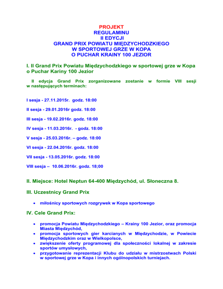 PROJEKT REGULAMINU II EDYCJI GRAND PRIX POWIATU MIĘDZYCHODZKIEGO W SPORTOWEJ GRZE W KOPA O PUCHAR KRAINY 100 JEZIOR I. II Grand Prix Powiatu Międzychodzkiego w sportowej grze w Kopa o Puchar Kariny 100 Jezior II edycja Grand Prix zorganizowane w następujących terminach: zostanie w formie VIII sesji I sesja - 27.11.2015r. godz. 18:00 II sesja - 29.01.2016r godz. 18:00 III sesja - 19.02.2016r. godz. 18:00 IV sesja - 11.03.2016r. - godz. 18:00 V sesja - 25.03.2016r. – godz. 18:00 VI sesja - 22.04.2016r. godz. 18:00 VII sesja - 13.05.2016r. godz. 18:00 VIII sesja – 10.06.2016r. godz. 18;00 II. Miejsce: Hotel Neptun 64-400 Międzychód, ul. Słoneczna 8. III. Uczestnicy Grand Prix miłośnicy sportowych rozgrywek w Kopa sportowego IV. Cele Grand Prix: promocja Powiatu Międzychodzkiego – Krainy 100 Jezior, oraz promocja Miasta Międzychód, promocja sportowych gier karcianych w Międzychodzie, w Powiecie Międzychodzkim oraz w Wielkopolsce, zwiększenie oferty programowej dla społeczności lokalnej w zakresie sportów umysłowych, przygotowanie reprezentacji Klubu do udziału w mistrzostwach Polski w sportowej grze w Kopa i innych ogólnopolskich turniejach. V. Organizator: Międzychodzki Klub Sportowych Gier Karcianych Umysłowych Kontra-Rej Kontakt - adres do korespondencji – 64-400 Międzychód, ul Zaułek 6a - Tel. 095 748 32 78 oraz kom. 510 338 879 - Tel 608 282 676 email: [email protected] Strona internetowa www.kraina100jezior-grykarciane-miedzychod.pl - Email klubowy: gry [email protected] Uwaga strona internetowa i email klubowy trwają przygotowania do uruchomienia VI. Współorganizatorzy: Starostwo Powiatowe w Międzychodzie, ul. 17 Stycznia 143 Urząd Miasta w Międzychodzie, ul. Marszałka Piłsudskiego 2 Hotel Neptun, ul. Słoneczna 8 Drukarnia w Międzychodzie, ul. Chrobrego 6. VII. REGULAMIN ROZGRYWEK 1. Uczestnicy: osoby, które po zaakceptowaniu niniejszego regulaminu zgłoszą się przynajmniej na 15 minut przed rozpoczęciem poszczególnych sesji rozgrywkowych, otrzymanie niniejszego regulaminu stanowi zaproszenie do udziału w rozgrywkach Grand Prix, regulamin można powielić i upowszechnić wśród miłośników gry w Kopa. 2. Kolejność kart od najsłabszej: as – trefl i pik, 10 i as karo, walety(bubki) - karo, kier, pik i trefl, damy – karo, kier, pik i trefl, 10. kier, pik i trefl as kier. 3. Zasady gry. II Międzychodzkie Grand Prix w sportowej grze w Kopa zorganizowane zostanie wg następujących zasad. Rozgrywki składać będą się z ośmiu sesji w terminach jako podano wyżej po rozpoczęciu rozgrywek terminy nie mogą ulec zmianie. W każdej sesji rozegranych zostanie pięć rund po 32 rozdania – do każdej rundy przeprowadzone zostanie losowanie miejsc przy stolikach. Czas gry jednej rundy trwa około 35 min. – ale tylko do zakończenia rozgrywanej przez stolik danej serii rozdań??? Liczba uczestników gry przy stoliku - 4 osoby - rozdający zmienia się zgodnie ze wskazówkami zegara. Licytację wywołuje zawodnik rozdający karty. Pierwszy rozdający jest na dobiciu, czyli, jako ostatni kładzie kartę w pierwszej bitce. Licytować zaczyna zawodnik po lewej stronie rozdającego karty. W licytacji obowiązuje kolejność zgodnie z ruchem wskazówek zegara, licytacja toczy się nawet kilka razy w koło, aż do zakończenia. Licytację definitywnie jest zakończona po czterech kolejnych pasach. Gry: wesele oraz zollo i zollo -du muszą być zgłoszone w ramach swojego głosu w I kolejce licytacji. Zawodnicy, którzy będą mieli wolny los otrzymają po 2,5 pkt. i zero punktów małych. W jednej sesji jeden zawodnik może mieć tylko raz wolny los. 4. Licytacja(rajcowanie) – do trzech poziomów: kontra – rej – bok. Zollo-du tylko kontra, zollo i cicha tylko kontra-rej. pierwszą kartę na stół kładzie na stół zawodnik po lewej stronie zawodnika rozdającego karty, kolejni gracze jeśli mają możliwość muszą przebić najwyższą kartę, lub dodać innego trumfa posiadacz asa trefl lub pik może dołożyć je do lewej, gdy nie ma na ręce żadnego trumfa. Z tych dwóch kart można wyjść gdy się jest na zejściu, przy rozpoczynaniu gry lub po wzięciu lewej. bitkę bierze ten, kto położył najwyższą kartę ze wszystkich czterech graczy i to on wychodzi do następnej bitki. w przypadku nie przebicia karty mimo takiej możliwości zawodnik, który popełni taki błąd otrzymuje punkty minusowe na poziomie gry bez bitki wylicytowanej gry, a w przypadku Zolla – 15, a Zolla-du –30 pkt. położenie karty nie w kolejności do przebiegu danej rozgrywki powoduje przegraną danej pary lub trójki przeciwników(przy wersji jeden na trzech – ciche wesele zolo - du, zolo, ciche wesele) lub grającego samodzielną grę według maksymalnej stawki wylicytowanej gry(czyli jak bez bitki), zawodnik, który popełni ten błąd otrzymuje punkty minusowe na poziomie gry bez bitki wylicytowanej gry, a w przypadku Zolla – 15, a Zolla-du –30 pkt. 5. Rodzaje gier: gra parami czyli – „starzy” na „młodych”. „Starzy” to posiadacze damy trefl i pik. Kto gra z kim okaże się w trakcie lub po grze. Wygrywa ta para która zdobędzie więcej oczek(pkt.) w ramach zdobytych lew – bitek. Jeśli liczba oczek jest równa tzn., że są boki(po 52 pkt.) wtedy przy grze bez kontry przegrywają „starzy’. W innych przypadkach przegrywa ta para, która wyżej licytowała. Tzw. wyjście dla „starych i młodych równe po 26 pkt. wesele – jest to wersja gry parami, gdy jeden z zawodników posiada dwie stare damy. Zgłoszenie wesela musi się odbyć w ramach pierwszej kolejki licytacji. Weselnik nie określa koloru waleta. Zasady wygranej i tzw. wyjścia są takie same jak w pkt. A. W drugiej kolejce licytacji weselnik może dać kontrę!!! Jeśli wcześniej nie była zgłoszona. ciche wesele (cicha) – posiadacz obu starych dam gra sam. Zasady wygranej są takie same jak w dwóch poprzednich przypadkach(jeśli jest bok grający 