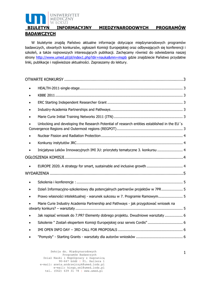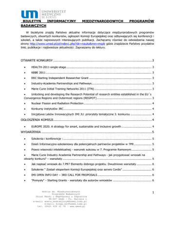 BIULETYN INFORMACYJNY BADAWCZYCH MIĘDZYNARODOWYCH PROGRAMÓW W biuletynie znajdą Państwo aktualne informacje dotyczące międzynarodowych programów badawczych, otwartych konkursów, ogłoszeń Komisji Europejskiej oraz odbywających się konferencji i szkoleń, a także najnowszych interesujących publikacji. Zachęcamy również do odwiedzenia naszej strony http://www.umed.pl/pl/index1.php?dir=nauka&mn=mspb gdzie znajdziecie Państwo przydatne linki, publikacje i najświeższe aktualności. Zapraszamy do lektury. OTWARTE KONKURSY .................................................................................................... 3 HEALTH-2011-single-stage ................................................................................................. 3 KBBE 2011 ........................................................................................................................ 3 ERC Starting Independent Researcher Grant ....................................................................... 3 Industry-Academia Partnerships and Pathways .................................................................... 3 Marie Curie Initial Training Networks 2011 (ITN) ................................................................. 3 Unlocking and developing the Research Potential of research entities established in the EU´s Convergence Regions and Outermost regions (REGPOT) .............................................................. 3 Nuclear Fission and Radiation Protection ............................................................................. 4 Konkursy instytutów JRC .................................................................................................... 4 Inicjatywa Leków Innowacyjnych IMI JU: priorytety tematyczne 3. konkursu ........................ 4 OGŁOSZENIA KOMISJI.................................................................................................... 4 EUROPE 2020. A strategy for smart, sustainable and inclusive growth .................................. 4 WYDARZENIA ................................................................................................................ 5 Szkolenia i konferencje : .................................................................................................... 5 Dzień Informacyjno-szkoleniowy dla potencjalnych partnerów projektów w 7PR .................... 5 Prawo własności intelektualnej - warunek sukcesu w 7. Programie Ramowym ....................... 5 Marie Curie Industry Academia Partnership and Pathways - jak przygotować wniosek na otwarty konkurs? – warsztaty ..................................................................................................... 5 Jak napisać wniosek do 7.PR? Elementy dobrego projektu. Dwudniowe warsztaty ................. 6 Szkolenie " Zostań ekspertem Komisji Europejskiej oraz serwis Cordis" ................................. 6 IMI OPEN INFO DAY – 3RD CALL FOR PROPOSALS ............................................................. 6 "Pomysły" - Starting Grants - warsztaty dla autorów wniosków ............................................ 6 Sekcja ds. Międzynarodowych Programów Badawczych Dział Nauki i Współpracy z Zagranicą 90-647 Łódź | Pl. Hallera 1 e-mail: [email protected] e-mail: [email protected] tel. (042) 639 31 78 | www.umed.pl 1 Dzień Informacyjny "Współpraca Międzynarodowa (INCO) w 7.Programie Ramowym" Program "Możliwości" ................................................................................................................. 7 Warsztaty- Jak przygotować zwycięski wniosek do konkursu Research Potential FP7 ............. 7 Finansowanie projektów w 7PR – warsztaty ........................................................................ 7 Własność intelektualna w projektach 7PR .......................................................................... 8 OFERTY WSPÓŁPRACY ................................................................................................... 8 Oferty współpracy w projektach w ramach 7 Programu Ramowego: .................................... 8 “Iuliu Hatieganu” University of Medicine and Pharmacy - ROMANIA ..................................... 8 National Institute for Chemical-Pharmaceutical Research and Development - ROMANIA ......... 8 MENA Food Safety Associates - Liban ................................................................................. 8 Sapienza University of Rome – ITALY ................................................................................ 9 MDD – ITALY .................................................................................................................... 9 University of Granada – SPAIN ........................................................................................... 9 Aalesund University College – NORWAY .............................................................................. 9 Team Professionists Consultants of Health Management – ITALY ......................................... 9 Frauengesundheitszentrum - Women's Health Center – AUSTRIA ........................................10 Zytoprotec GmbH – AUSTRIA ..........................................................................................10 CARTIF Foundation – SPAIN .............................................................................................10 Institute of Genetics and Biophysics-CNR – ITALY .............................................................10 University of Dublin, Trinity College – IRLAND ....................................................................10 Children's Cancer Hospital - EGYPT ....................................................................................10 Poszukiwanie partnerów do projektów IMI ........................................................................11 Publikacje ............................................................................................................