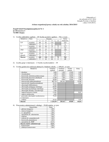 Załącznik nr 1 do uchwały nr 612 /2014 Zarządu Powiatu w Gryfinie z dnia 15.05.2014 r. Arkusz organizacji pracy szkoły na rok szkolny 2014/2015 Zespół Szkół Ponadgimnazjalnych Nr 1 ul. Dworcowa 3 74-500 Chojna 1) Liczba oddziałów ogółem – 29/ liczba uczniów ogółem – 782, w tym: Składowa LO T ZSZ LO dorośli Razem Dane uczniów oddziałów uczniów oddziałów uczniów oddziałów uczniów oddziałów uczniów oddziałów 1 60 2 60 2 60 2 25 1 205 7 Poziom 2 3 81 114 3 4 66 79 2 3 67 62 2 3 18 18 1 1 232 273 8 11 4 72 3 72 3 Suma końcowa 255 9 277 10 189 7 61 3 782 29 2) Liczba grup w internacie – 2/ liczba wychowanków – 39 3) Liczba godzin do realizacji płatnych z budżetu szkoły – 1 496,81, w tym: Składowa - dyrektor - wicedyrektor - kierownik szkolenia praktycznego - kierownik pracowni szkolnych - kierownik internatu - nauczyciele pełnozatrudnieni - nauczyciele niepełnozatrudnieni - obowiązki bibliotekarza - obowiązki pedagoga szkolnego - obowiązki psychologa szkolnego - obowiązki doradcy zawodowego - zajęcia kursowe (vacat) - zajęcia nielekcyjne - pozostałe obowiązki wychowawcy w internacie - wakaty Razem Godziny ogółem 4,00 7,00 9,74 11,00 20,00 887,78 22,16 75,00 60,00 10,00 5,00 11,05 4,00 79,50 Godziny ponadw. 1,00 0,00 0,00 1,00 0,00 201,42 18,16 1 224,39 4) Pracownicy administracji i obsługi – 29,00 etatów, w tym: Stanowisko - główny księgowy - starszy księgowy - st. specjalista - specjalista ds. sekretariatu - referent - referent ds. gospodarczych - kierownik gospodarczy - specjalista ds. BHP Razem etatów administracji - konserwator - elektryk konserwator Etaty 1,00 1,00 1,00 2,00 1,00 1,00 1,00 0,10 8,10 2,00 1,00 Zniżki godzin 15,00 22,00 10,00 12,00 10,00 Etaty 1,00 2,00 1,00 1,00 1,00 55,00 2,02 0,61 203,42 69,00 1,01 64,64 - starszy woźny - woźny - dozorca - dozorca konserwator - sprzątaczka Razem etatów obsługi - magazynier - kucharka - pomoc kuchenna Razem blok żywienia Ogółem etatów 2,00 1,00 3,00 1,00 7,40 17,40 1,00 1,00 1,50 3,50 29,00 Powyższa liczba oddziałów, godzin zajęć dydaktycznych, opiekuńczych i wychowawczych realizowanych tygodniowo w szkole oraz zatrudnienie nauczycieli i pracowników niepedagogicznych obowiązuje od dnia 1 września 2014 roku. Wszelkie zmiany zostaną wprowadzone aneksem do arkusza organizacji pracy zespołu szkół.