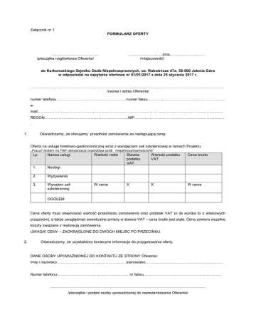 Załącznik nr 1 FORMULARZ OFERTY ………………………………. /pieczątka nagłówkowa Oferenta/ ………………………dnia……………………… /miejscowość/ do Karkonoskiego Sejmiku Osób Niepełnosprawnych, os. Robotnicze 47a, 58-500 Jelenia Góra w odpowiedzi na zapytanie ofertowe nr 01/01/2017 z dnia 25 stycznia 2017 r. …………………………………………………………………………………………………………………………………… /nazwa i adres Oferenta/ numer telefonu………………………………………..……..numer faksu…………………………………………………… email……………………………………………………………………………………………………………………………... REGON………………………………………………………..NIP……………………………………………………………. . Oświadczamy, że oferujemy przedmiot zamówienia za następującą cenę: 1. Oferta na usługę hotelowo-gastronomiczną wraz z wynajęciem sali szkoleniowej w ramach Projektu „Praca? Jestem na TAK! aktywizacja zawodowa osób niepełnosprawnościami” Lp. Nazwa usługi Wartość netto Stawka Wartość podatku Cena brutto podatku VAT VAT 1. Noclegi 2. Wyżywienie 3. Wynajem sali szkoleniowej W cenie X X W cenie OGÓŁEM Cena oferty musi obejmować wartość przedmiotu zamówienia oraz podatek VAT (o ile wynika to z właściwych przepisów), a także uwzględniać ewentualne zmiany w stawce VAT – cena brutto jest stała. Cena zawiera wszelkie koszty związane z realizacją zamówienia. UWAGA! CENY – ZAOKRĄGLONE DO DWÓCH MIEJSC PO PRZECINKU. 2. Oświadczamy, że uzyskaliśmy konieczne informacje do przygotowania oferty. DANE OSOBY UPOWAŻNIONEJ DO KONTAKTU ZE STRONY Oferenta: Imię i nazwisko………………………………………………stanowisko…………………………………………………… Numer telefonu:………………………………………………. nr faksu…………………………………………………… ………………………………………………………………………………………………………….. /pieczątka i podpis osoby upoważnionej do reprezentowania Oferenta/ Załącznik nr 2 OŚWIADCZENIE o braku powiązań kapitałowych i osobowych ………………………………. /pieczątka nagłówkowa Oferenta/ ………………………dnia……………………… /miejscowość/ Przystępując do udziału w postępowaniu o udzielenie zamówienia na: usługę hotelowo-gastronomiczną wraz z wynajęciem sali szkoleniowej w ramach projektu z niepełnosprawnościami” „Praca? Jestem na TAK! aktywizacja zawodowa osób zapytanie ofertowe nr 01/01/2017 oświadczam, że Wykonawca, którego reprezentuję, nie jest podmiotem powiązanym z Zamawiającym osobowo lub kapitałowo, przy przyjęciu, iż przez powiązania kapitałowe lub osobowe rozumie się wzajemnie powiązania pomiędzy Zamawiającym lub osobami upoważnionymi do zaciągania w imieniu Zamawiającego lub osobami wykonującymi w imieniu Zamawiającego czynności związane z przygotowaniem i przeprowadzeniem procedury wyboru Wykonawcy a Zamawiającym polegające w szczególności na: a) Uczestniczeniu w spółce jako wspólnik spółki cywilnej lub spółki osobowej; b) Posiadaniu co najmniej 10 % udziałów lub akcji; c) Pełnieniu funkcji członka organu nadzorczego lub zarządzającego, prokurenta, pełnomocnika; d) Pozostawaniu w związku małżeńskim, w stosunku pokrewieństwa lub powinowactwa w linii prostej, pokrewieństwa lub powinowactwa w linii bocznej do drugiego stopnia lub w stosunku przysposobienia opieki lub kurateli. ………………………………………………………………………………………………………….. /pieczątka i podpis osoby upoważnionej do reprezentowania Oferenta/ Załącznik nr 3 OŚWIADCZENIE o spełnieniu warunków udziału w postępowaniu ………………………………. /pieczątka nagłówkowa Oferenta/ ………………………dnia……………………… /miejscowość/ Przystępując do udziału w postępowaniu o udzielenie zamówienia na: usługę hotelowo-gastronomiczną wraz z wynajęciem sali szkoleniowej w ramach projektu „„Praca? Jestem na TAK! aktywizacja zawodowa osób z niepełnosprawnościami” zapytanie ofertowe nr 01/01/2017 Ja/my niżej podpisany/i …………………………………………………………………………………………………………………………………… …………………………………………………………………………………………………………………………………… …………………………………………………… (imiona i nazwiska osób upoważnionych do reprezentowania Oferenta) działających w imieniu i na rzecz: …………………………………………………………………………………………………………… (nazwa Oferenta) Oświadczam/y, że: a) Posiadam/y uprawnienia do wykonywania zamówienia. b) Dysponuję/emy potencjałem technicznym do wykonania zamówienia. c) Znajduję/emy się w sytuacji ekonomicznej i finansowej zapewniającej wykonanie zamówienia. ………………………………………………………………………………………………………….. /pieczątka i podpis osoby upoważnionej do reprezentowania Oferenta/