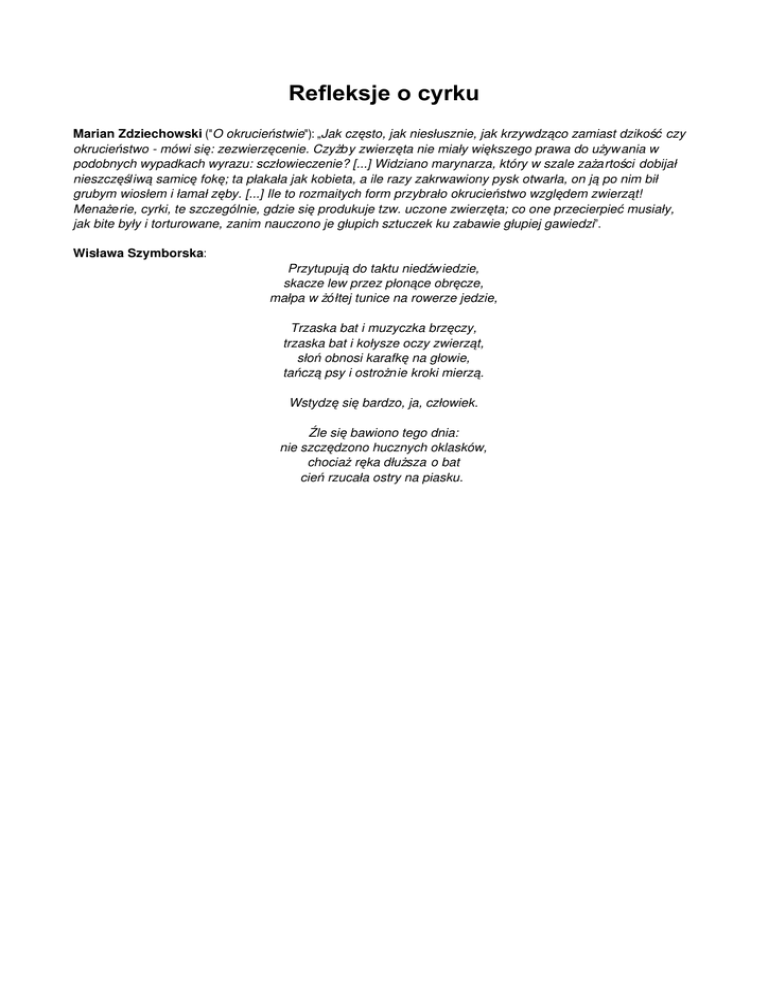 Marian Zdziechowski ("O okrucieństwie"): „Jak często, jak niesłusznie, jak krzywdząco zamiast dzikość czy okrucieństwo mówi się: zezwierzęcenie. Czyżby zwierzęta nie miały większego prawa do używania w podobnych wypadkach wyrazu: sczłowieczenie? [...] Widziano marynarza, który w szale zażartości dobijał nieszczęśliwą samicę fokę; ta płakała jak kobieta, a ile razy zakrwawiony pysk otwarła, on ją po nim bił grubym wiosłem i łamał zęby. [...] Ile to rozmaitych form przybrało okrucieństwo względem zwierząt! Menażerie, cyrki, te szczególnie, gdzie się produkuje tzw. uczone zwierzęta; co one przecierpieć musiały, jak bite były i torturowane, zanim nauczono je głupich sztuczek ku zabawie głupiej gawiedzi”.