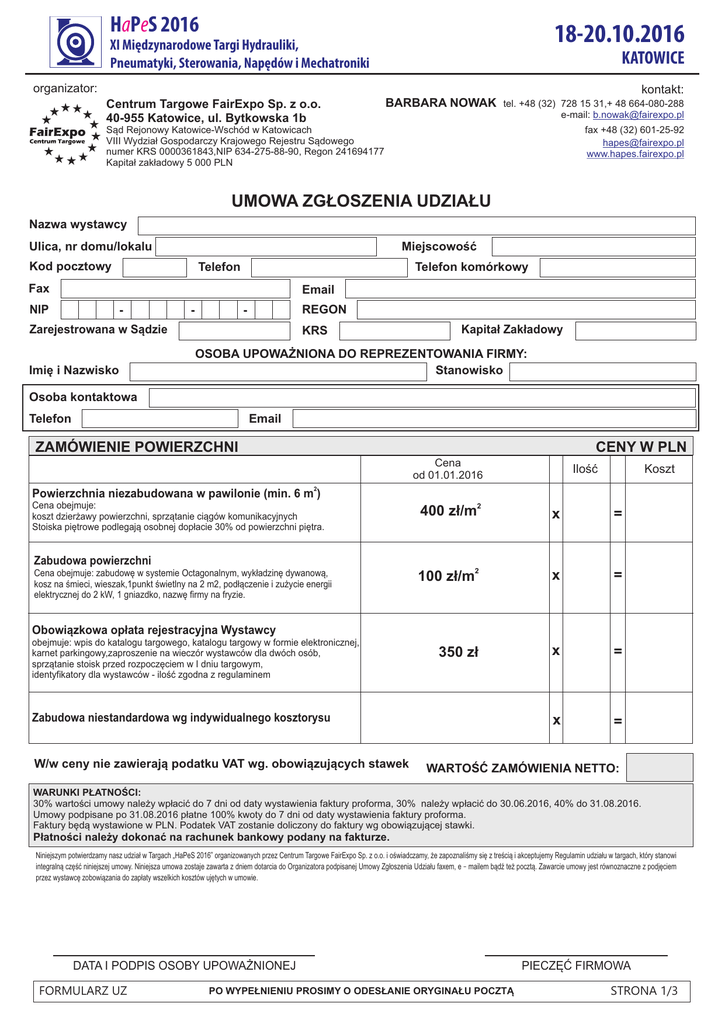 HaPeS 2016 18-20.10.2016 XI Miêdzynarodowe Targi Hydrauliki, Pneumatyki, Sterowania, Napêdów i Mechatroniki KATOWICE organizator: kontakt: Centrum Targowe FairExpo Sp. z o.o. 40-955 Katowice, ul. Bytkowska 1b BARBARA NOWAK tel. +48 (32) 728 15 31,+ 48 664-080-288 e-mail: [email protected] fax +48 (32) 601-25-92 [email protected] www.hapes.fairexpo.pl S¹d Rejonowy Katowice-Wschód w Katowicach VIII Wydzia³ Gospodarczy Krajowego Rejestru S¹dowego numer KRS 0000361843,NIP 634-275-88-90, Regon 241694177 Kapita³ zak³adowy 5 000 PLN UMOWA ZG£OSZENIA UDZIA£U Nazwa wystawcy Ulica, nr domu/lokalu Miejscowoœæ Kod pocztowy Telefon Telefon komórkowy Fax Email NIP - - REGON - Zarejestrowana w S¹dzie Imiê i Nazwisko KRS Kapita³ Zak³adowy OSOBA UPOWA¯NIONA DO REPREZENTOWANIA FIRMY: Stanowisko Osoba kontaktowa Email Telefon ZAMÓWIENIE POWIERZCHNI CENY W PLN Cena od 01.01.2016 Koszt Iloœæ 2 Powierzchnia niezabudowana w pawilonie (min. 6 m ) Cena obejmuje: koszt dzier¿awy powierzchni, sprz¹tanie ci¹gów komunikacyjnych Stoiska piêtrowe podlegaj¹ osobnej dop³acie 30% od powierzchni piêtra. 400 z³/m2 x = 100 z³/m2 x = 350 z³ x = x = Zabudowa powierzchni Cena obejmuje: zabudowê w systemie Octagonalnym, wyk³adzinê dywanow¹, kosz na œmieci, wieszak,1punkt œwietlny na 2 m2, pod³¹czenie i zu¿ycie energii elektrycznej do 2 kW, 1 gniazdko, nazwê firmy na fryzie. Obowi¹zkowa op³ata rejestracyjna Wystawcy obejmuje: wpis do katalogu targowego, katalogu targowy w formie elektronicznej, karnet parkingowy,zaproszenie na wieczór wystawców dla dwóch osób, sprz¹tanie stoisk przed rozpoczêciem w I dniu targowym, identyfikatory dla wystawców - iloœæ zgodna z regulaminem Zabudowa niestandardowa wg indywidualnego kosztorysu W/w ceny nie zawieraj¹ podatku VAT wg. obowi¹zuj¹cych stawek WARTOŒÆ ZAMÓWIENIA NETTO: WARUNKI P£ATNOŒCI: 30% wartoœci umowy nale¿y wp³aciæ do 7 dni od daty wystawienia faktury proforma, 30% nale¿y wp³aciæ do 30.06.2016, 40% do 31.08.2016. Umowy podpisane po 31.08.2016 p³atne 100% kwoty do 7 dni od daty wystawienia faktury proforma. Faktury bêd¹ wystawione w PLN. Podatek VAT zostanie doliczony do faktury wg obowi¹zuj¹cej stawki. P³atnoœci nale¿y dokonaæ na rachunek bankowy podany na fakturze. Niniejszym potwierdzamy nasz udziaù w Targach „HaPeS 2016” organizowanych przez Centrum Targowe FairExpo Sp. z o.o. i oúwiadczamy, ýe zapoznaliúmy siæ z treúcià i akceptujemy Regulamin udziaùu w targach, który stanowi integralnà czæúã niniejszej umowy. Niniejsza umowa zostaje zawarta z dniem dotarcia do Organizatora podpisanej Umowy Zgùoszenia Udziaùu faxem, e – mailem bàdê teý pocztà. Zawarcie umowy jest równoznaczne z podjæciem przez wystawcæ zobowiàzania do zapùaty wszelkich kosztów ujætych w umowie. DATA I PODPIS OSOBY UPOWA¯NIONEJ FORMULARZ UZ PO WYPE£NIENIU PROSIMY O ODES£ANIE ORYGINA£U POCZT¥ PIECZÊÆ FIRMOWA STRONA 1/3 HaPeS 2016 18-20.10.2016 XI Miêdzynarodowe Targi Hydrauliki, Pneumatyki, Sterowania, Napêdów i Mechatroniki KATOWICE organizator: kontakt: BARBARA NOWAK Centrum Targowe FairExpo Sp. z o.o. 40-955 Katowice, ul. Bytkowska 1b tel. +48 (32) 728 15 31,+ 48 664-080-288 e-mail: [email protected] fax +48 (32) 601-25-92 [email protected] www.hapes.fairexpo.pl S¹d Rejonowy Katowice-Wschód w Katowicach VIII Wydzia³ Gospodarczy Krajowego Rejestru S¹dowego numer KRS 0000361843,NIP 634-275-88-90, Regon 241694177 Kapita³ zak³adowy 5 000 PLN KARTA ZG£OSZENIA WSPÓ£WYSTAWCY Nazwa wystawcy Ulica, nr domu/lokalu Miejscowoœæ Kod pocztowy Telefon Telefon komórkowy Fax Email NIP - - REGON - Zarejestrowana w S¹dzie Imiê i Nazwisko Kapita³ Zak³adowy KRS OSOBA UPOWA¯NIONA DO REPREZENTOWANIA FIRMY: Stanowisko Osoba kontaktowa Email Telefon NAZWA FIRMY WSPÓ£WYSTAWCY ADRES DANE TEL./FAX E-MAIL TEL./FAX E-MAIL TEL./FAX E-MAIL TEL./FAX E-MAIL Zamówienie Cena Op³ata wspó³wystawcy (cena obejmuje wpis do elektronicznego katalogu, katalog w formie elektronicznej, nazwê firmy na fryzie, zaproszenie na wieczór wystawców 2szt., identyfikatory - iloœæ zgodna z regulaminem) 700 PLN W/w ceny nie zawieraj¹ podatku VAT wg. obowi¹zuj¹cych stawek Iloœæ x Koszt = WARTOŒÆ ZAMÓWIENIA NETTO: WARUNKI P£ATNOŒCI: P³atnoœæ 100% kwoty 7 dni od daty wystawienia faktury proforma. Faktury bêd¹ wystawione w PLN. Podatek VAT zostanie doliczony do faktury wg obowi¹zuj¹cej stawki. P³atnoœci nale¿y dokonaæ na rachunek bankowy podany na fakturze. DATA I PODPIS OSOBY UPOWA¯NIONEJ FORMULARZ UZ PO WYPE£NIENIU PROSIMY O ODES£ANIE ORYGINA£U POCZT¥ PIECZÊÆ FIRMOWA STRONA 2/3 HaPeS 2016 18-20.10.2016 XI Miêdzynarodowe Targi Hydrauliki, Pneumatyki, Sterowania, Napêdów i Mechatroniki KATOWICE organizator: kontakt: BARBARA NOWAK Centrum Targowe FairExpo Sp. z o.o. 40-955 Katowice, ul. Bytkowska 1b tel. +48 (32) 728 15 31,+ 48 664-080-288 e-mail: [email protected] fax +48 (32) 601-25-92 [email protected] www.hapes.fairexpo.pl S¹d Rejonowy Katowice-Wschód w Katowicach VIII Wydzia³ Gospodarczy Krajowego Rejestru S¹dowego numer KRS 0000361843,NIP 634-275-88-90, Regon 241694177 Kapita³ zak³adowy 5 000 PLN REGULAMIN UDZIA£U W TARGACH A. Postanowienia niniejszego Regulaminu Udzia³u w Targach stanowi¹ integraln¹ czeœæ Umowy Zg³oszenia Udzia³u w targach i obowi¹zuj¹ wszystkich uczestników targów i wystaw (dalej Wystawca) organizowanych przez Centrum Targowe FairExpo Sp. z o.o. z siedzib¹ w Katowicach (40-955), ul. Bytkowska 1 B wpisanej do Rejestru Przedsiêbiorców prowadzonego przez S¹d Rejonowy Katowice Wschód w Katowicach pod numerem KRS 0000361843 (dalej Organizator). Wszelkie zmiany Umowy Zg³oszenia Udzia³u, w tym Regulaminu, musz¹ byæ dokonywane w formie pisemnej i podpisane przez upowa¿nionego przedstawiciela Centrum Targowego FairExpo Sp. z o.o. (zwanego dalej Organizatorem), i osoby umocowane do reprezentowania Wystawcy. B. Warunkiem udzia³u w targach jest zawarcie mi