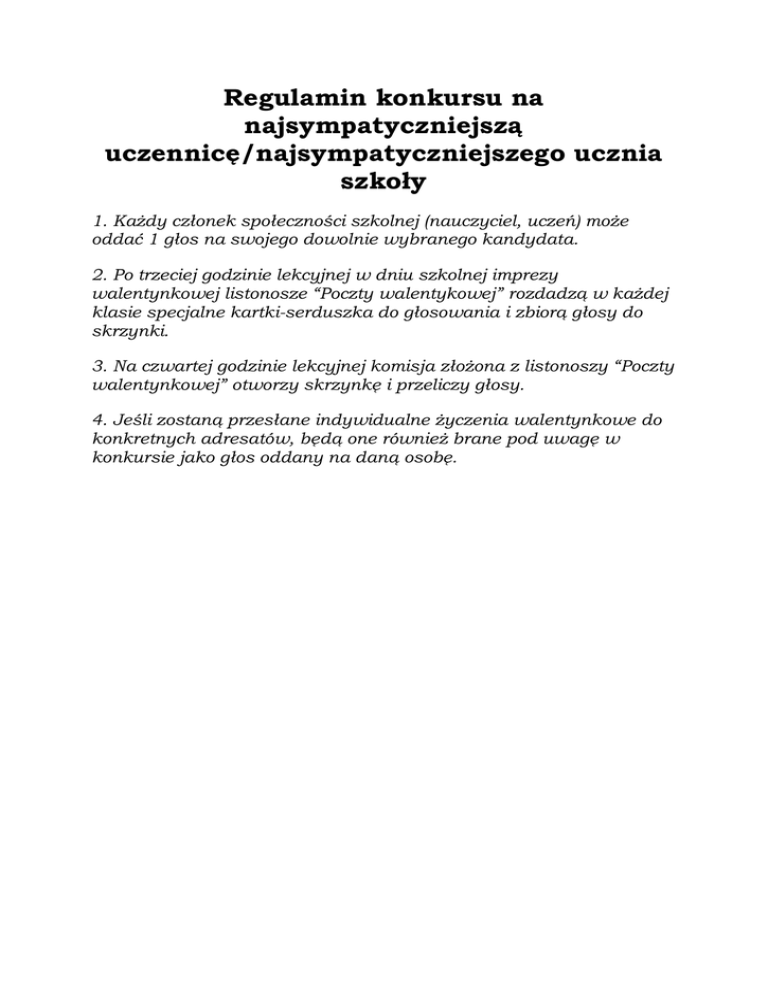 Regulamin konkursu na najsympatyczniejszą uczennicę/najsympatyczniejszego ucznia szkoły 1. Każdy członek społeczności szkolnej (nauczyciel, uczeń) może oddać 1 głos na swojego dowolnie wybranego kandydata. 2. Po trzeciej godzinie lekcyjnej w dniu szkolnej imprezy walentynkowej listonosze “Poczty walentykowej” rozdadzą w każdej klasie specjalne kartki-serduszka do głosowania i zbiorą głosy do skrzynki. 3. Na czwartej godzinie lekcyjnej komisja złożona z listonoszy “Poczty walentynkowej” otworzy skrzynkę i przeliczy głosy. 4. Jeśli zostaną przesłane indywidualne życzenia walentynkowe do konkretnych adresatów, będą one również brane pod uwagę w konkursie jako głos oddany na daną osobę.
