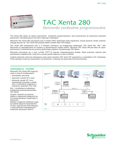 TAC Vista TAC Xenta 280 Sterowniki swobodnie programowalne TAC Xenta 280 należy do rodziny sterowników swobodnie programowalnych i jest przeznaczona do sterowania systemów grzewczych i klimatyzacyjnych lub stref w tego typu instalacjach. Sterownik TAC Xenta 280 wyposażony jest w funkcje HVAC obejmujące pętle regulacyjne, krzywe grzwcze, kanały czasowe, obsługę alarmów itp. TAC Xenta 283 posiada obiekt LonMark Real Time Keeper. TAC Xenta 280 produkowany jest w 3 wersjach różniących się konfiguracją wejść/wyjść: TAC Xenta 281, 282 i 283. Sterowniki są zaprojektowane do montażu w standardowych szafach AKPiA. Sterownik TAC Xenta 280 jest łatwy do zaprogramowania i uruchomienia przy pomocy graficznego programu narzędziowego TAC Menta. Sterownik komunikuje się w sieci LonTalk TP/FT-10 poprzez niespolaryzowaną skrętkę. Może pracować zarówno jako samodzielne urządzenie jak i może być w prosty sposób włączony w sieć LonWorks. Lokalnie sterownik może być obsługiwany przez panel operatora TAC Xenta OP wyposażony w wyświetlacz LCD i klawiaturę. Panel operatora może być zamocowany na sterowniku, w elewacji lub służyć jako terminal przenośny. konfiguracja systemu Sterowniki TAC Xenta 280 mogą być użyte w różnych konfiguracjach: • samodzielny sterownik; TAC Vista Management Level TAC Vista IP Network k • sterowniki i panele OP w sieci; • sterowniki, panele OP i inne wyposażenie pracujące w pełnej sieci z możliwością połączenia z centralnym systemem TAC Vista. Rys. 1 przedstawia przykładową konfigurację sieciową sterowników TAC Xenta. Czujniki i siłowniki na poziomie obiektu w większości podłączone są do konwencjonalnych wejść/wyjść w sterowniku. Niektóre urządzenia obiektowe mogą być jednak włączone bezpośrednio do sieci, poprzez port komunikacyjny z wykorzystaniem standardowych zmiennych sieciowych (SNVT). 03-00009-03-pl PCLTA Card or TAC Xenta 511 TAC Xenta 901 Automation Level TP/FT-10 TAC Xenta OP TAC Xenta OP TAC Xenta 281 Field Level Rys. 1 TAC Xenta 282 + - Web Browser BUDOWA Sterownik TAC Xenta 280 został zaprojektowany jako całkowicie samodzielna jednostka mogąca pracować w bezpośredniej bliskości obiektu regulowanego. Pozwala to na zminimalizowanie wymaganego w układach sterowniczych okablowania. TAC Xenta 280 bazuje na technologii mikroprocesorowej. Składa się z dwóch elementów: części elektronicznej i podstawy z zaciskami (rys. 2). TAC Xenta 280 może współpracować z różnego rodzaju czujnikami, przetwornikami i elementami wykonawczymi. Wszystkie połączenia elektryczne wykonuje się poprzez zaciski w podstawie sterownika. Część elektroniczna może być łatwo zdejmowana do serwisu bez demontażu połączeń elektrycznych na listwach. Lokalny terminal operatora TAC Xenta OP jest podręcznym panelem operatora, który można podłączyć do gniazda w obudowie sterownika. Przy jego pomocy operator może odczytywać wartości mierzone, przyjmować komunikaty o alarmach, forsować pracę urządzeń, ustawiać parametry sterowania itp. Wyboru funkcji dokonuje się z menu na ekranie panelu. Dostęp do poszczególnych funkcji może być zabezpieczony kodami. Istnieje możliwość połączenia się z innymi sterownikami włączonymi do wspólnej sieci. Zegar czasu rzeczywistego Zegar ten dostarcza aktualne dane o roku, miesiącu, dniu, godzinie, minucie i sekundzie. Kondensator zapewnia pracę zegara przez minimum 72 godziny w przypadku zaniku napięcia zasilania. komunikacja Możliwości komunikacyjne TAC Xenta 280 ma kilka możliwości komunikacji: wewnątrz sieci, z centralnym systemem nadzoru i z panelem operatora. Port LonWorks Sterowniki TAC Xenta komunikują się między sobą wykorzystując wspólną sieć, LonWorks TP/FT-10, 78 kbps. Protokół LonTalk stwarza możliwość wykorzystania zmiennych sieciowych, zdefiniowanych w urządzeniach innych producentów. Aplikacje bloków funkcyjnych są modelowane jako rzeczywiste obiekty sterownika LonMark. Interfejs zmiennych sieciowych (zawierający SNVTs) może być dostarczony na zamówienie a pliki XIF (External Interface Files) mogą być generowane przez narzędzia programu TAC Menta. 2 TAC Xenta 283 może być wykorzystywana jako Real Time Keeper. Zegar sterownika jest wysyłany jako zmienna SNVT_time_stamp, i może być powiązany z innym urządzeniem LonWorks. Czas letni Przełączenie między czasem letnim i zimowym odbywa się automatycznie. Czas przełączenia i wielkość przesunięcia są ustawialne. Funkcja ta może być wyłączona. Wejścia cyfrowe Wejścia cyfrowe mogą być wykorzystane do przyjmowania stanów alarmowych, statusów pracy, zliczania impulsów itp. Każde wejście cyfrowe może być użyte jako licznik impulsów. Innym zastosowaniem jest monitorowanie alarmów. Obwody wejść cyfrowych posiadają zasilanie wewnętrzne. Rys. 2 Wyjścia analogowe Wyjścia analogowe mogą być wykorzystane do sterowania urządzeniami wymagającymi ciągłych sygnałów sterujących. Wejścia uniwersalne Wejścia uniwersalne mogą być indywidualnie konfigurowane (w programie LonWorks® SNVT aplikacyjnym) jako wejścia analogowe Zmienne SNVT zgodne ze standardem lub cyfrowe.Dla każdego wejścia może Echelon® umożliwiają komunikację z być ustawiony dolny i górny limit. urządzeniami innych producentów. Wejścia termistorowe Zabezpieczenie przed zanikiem naTAC Xenta 282 i 283 posiadają wejścia, pięcia 1,8 kW przy 25 °C. Dzięki specjalnemu rodzajowi pamięci W TAC Xenta 283, można dodatkowo (flash) sterownik rozpoczyna normalną wybrać wejścia 10 kW przy 25 °C. pracę z nastawami użytkownika po poWyjścia cyfrowe wrocie napięcia zasilania. Wyjścia cyfrowe mogą być wykorzystane do sterowania urządzeń takich jak wentylatory, pompy, siłowniki itp. Sygnał wyjściowy może być sygnałem impulsowym o modulowanej szerokości. TAC Xenta 283, posiada wyjścia cyfrowe z triakami. System prezentacji TAC Vista Gdy 