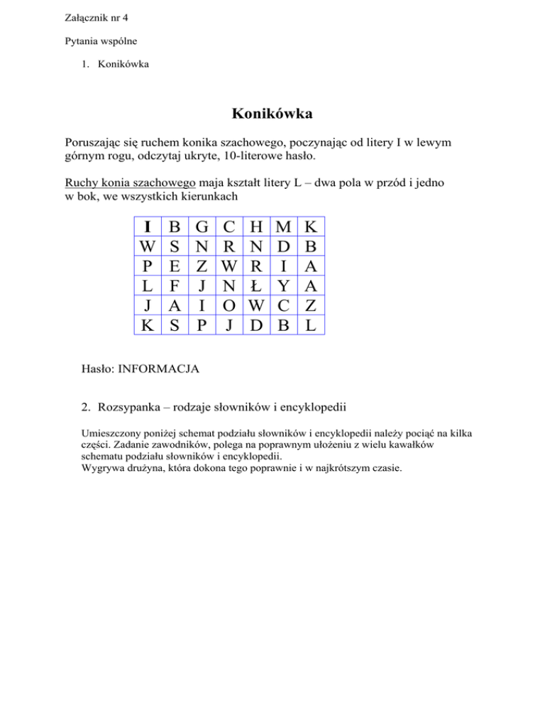 Załącznik nr 4 Pytania wspólne 1. Konikówka Konikówka Poruszając się ruchem konika szachowego, poczynając od litery I w lewym górnym rogu, odczytaj ukryte, 10-literowe hasło. Ruchy konia szachowego maja kształt litery L – dwa pola w przód i jedno w bok, we wszystkich kierunkach I W P L J K B S E F A S G N Z J I P C R W N O J H N R Ł W D M D I Y C B K B A A Z L Hasło: INFORMACJA 2. Rozsypanka – rodzaje słowników i encyklopedii Umieszczony poniżej schemat podziału słowników i encyklopedii należy pociąć na kilka części. Zadanie zawodników, polega na poprawnym ułożeniu z wielu kawałków schematu podziału słowników i encyklopedii. Wygrywa drużyna, która dokona tego poprawnie i w najkrótszym czasie. ENCYKLOPEDIE SPECJALNE OGÓLNE Encyklopedia Wiedzy o Książce Wielka encyklopedia powszechna SŁOWNIKI RZECZOWE Flis J.: Szkolny słownik geograficzny JĘZYKOWE OGÓLNE PRZEKŁADOWE Słownik języka polskiego Słownik polsko-angielski SPECJALNE Słownik wyrazów obcych 3. Rodzaje opraw Konkurencja ta, polegała na rozpoznaniu przez uczniów rodzajów opraw przedstawionych na poniższych zdjęciach: W naszej szkole oprawy przedstawione zostały za pomocą prezentacji PowerPoint 1. Oprawa kopertowa 2. Oprawa sakwowa 3. Oprawa ołtarzowa (złotnicza)