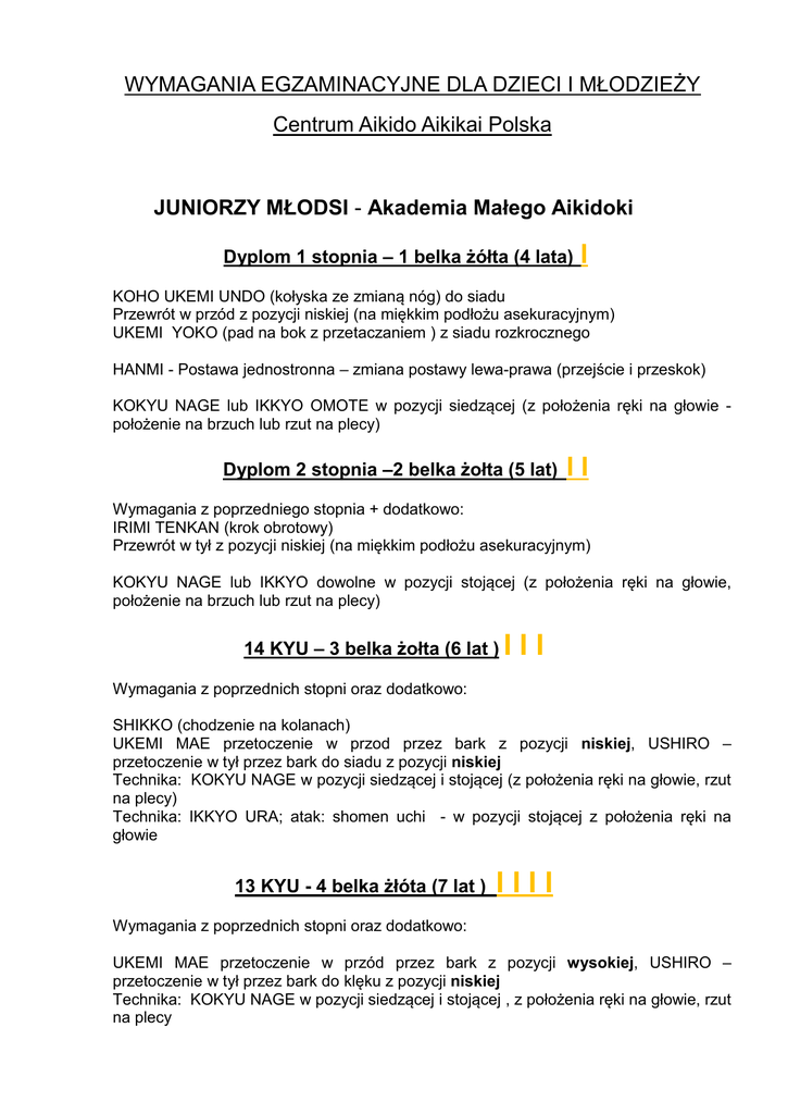 WYMAGANIA EGZAMINACYJNE DLA DZIECI I MŁODZIEŻY Centrum Aikido Aikikai Polska JUNIORZY MŁODSI - Akademia Małego Aikidoki Dyplom 1 stopnia – 1 belka żółta (4 lata) I KOHO UKEMI UNDO (kołyska ze zmianą nóg) do siadu Przewrót w przód z pozycji niskiej (na miękkim podłożu asekuracyjnym) UKEMI YOKO (pad na bok z przetaczaniem ) z siadu rozkrocznego HANMI - Postawa jednostronna – zmiana postawy lewa-prawa (przejście i przeskok) KOKYU NAGE lub IKKYO OMOTE w pozycji siedzącej (z położenia ręki na głowie położenie na brzuch lub rzut na plecy) Dyplom 2 stopnia –2 belka żołta (5 lat) II Wymagania z poprzedniego stopnia + dodatkowo: IRIMI TENKAN (krok obrotowy) Przewrót w tył z pozycji niskiej (na miękkim podłożu asekuracyjnym) KOKYU NAGE lub IKKYO dowolne w pozycji stojącej (z położenia ręki na głowie, położenie na brzuch lub rzut na plecy) 14 KYU – 3 belka żołta (6 lat ) I II Wymagania z poprzednich stopni oraz dodatkowo: SHIKKO (chodzenie na kolanach) UKEMI MAE przetoczenie w przod przez bark z pozycji niskiej, USHIRO – przetoczenie w tył przez bark do siadu z pozycji niskiej Technika: KOKYU NAGE w pozycji siedzącej i stojącej (z położenia ręki na głowie, rzut na plecy) Technika: IKKYO URA; atak: shomen uchi - w pozycji stojącej z położenia ręki na głowie 13 KYU - 4 belka żłóta (7 lat ) IIII Wymagania z poprzednich stopni oraz dodatkowo: UKEMI MAE przetoczenie w przód przez bark z pozycji wysokiej, USHIRO – przetoczenie w tył przez bark do klęku z pozycji niskiej Technika: KOKYU NAGE w pozycji siedzącej i stojącej , z położenia ręki na głowie, rzut na plecy Technika: IKKYO OMOTE/ URA; atak: shomen uchi - w pozycji stojącej z położenia ręki na głowie 12 KYU - 5 belka żołta - (8 lat) IIIII Wymagania z poprzednich stopni oraz dodatkowo: USHIRO – przetoczenie w przód przez bark do pozycji wysokiej dowolnej) Technika: IKKYO OMOTE/ URA; atak: shomen uchi - w pozycji stojącej z położenia ręki na głowie – unieruchomienie na brzuchu. Technika: SUMI OTOSHI; atak: katatetori - w pozycji stojącej (lustrzanej) chwyt za rękę – rzut na plecy JUNIORZY ŚREDNI 11 KYU (9 lat) – pas ŻÓŁTY Wymagania z poprzednich stopni oraz dodatkowo: Technika: IKKYO OMOTE/ URA; atak: shomen uchi - w pozycji stojącej z położenia ręki na głowie – unieruchomienie na brzuchu. Technika: SUMI OTOSHI; atak: katatetori - w pozycji stojącej (lustrzanej) chwyt za rękę – rzut na plecy Technika: KOKYU NAGE 2; atak: ushiro ryote dori – chwyt z tyłu za ręce, zejście z linii ataku, przerzucenie partnera w prżód Technika: TENCHI NAGE; atak: katadori – w pozycji stojącej chwyt za rękaw na wysokości ramienia 10 KYU (10 lat) – pas POMARAŃCZOWY Wymagania z poprzednich stopni oraz dodatkowo: USHIRO – przetoczenie przez bark do pozycji stojącej z pozycji wysokiej - hanmi) Technika: IKKYO OMOTE/ URA; atak: shomen uchi - w pozycji stojącej z położenia ręki na głowie – unieruchomienie na brzuchu. Technika: SUMI OTOSHI; atak: katatetori - w pozycji stojącej (lustrzanej) chwyt za rękę – rzut na plecy Technika: KOKYU NAGE 2; atak: ushiro ryote dori – chwyt z tyłu za ręce, zejście z linii ataku, przerzucenie partnera w przód Technika: TENCHI NAGE; atak: katadori – w pozycji stojącej, chwyt za rękaw na wysokości ramienia Technika: UCHI KAITEN NAGE; atak: katate dori – z chwytu za nadgarstek 9 KYU (11 lat) – pas ZIELONY Wymagania z poprzednich stopni oraz dodatkowo: Technika: IKKYO OMOTE/ URA; atak: shomen uchi - w pozycji stojącej z położenia ręki na głowie – unieruchomienie na brzuchu. Technika: SUMI OTOSHI; atak: katatetori - w pozycji stojącej (lustrzanej) chwyt za rękę – rzut na plecy Technika: KOKYU NAGE 2; atak: ushiro ryote dori – chwyt z tyłu za ręce, zejście z linii ataku, przerzucenie partnera w przód Technika: TENCHI NAGE; atak: katadori – w pozycji stojącej, chwyt za rękaw na wysokości ramienia Technika: UCHI KAITEN NAGE; atak: katate dori – z chwytu za nadgarstek Technika: KOTE GAESHI; atak: chudan tsuki – z uderzenia pięścią w brzuch Technika: KOKYU NAGE; atak: ryokata dori – suwari waza (chwyt z przodu oburącz za ramiona) JUNIORZY STARSI 8 KYU (12 lat) – pas NIEBIESKI Technika: IKKYO OMOTE/ URA; atak: shomen uchi - w pozycji stojącej z położenia ręki na głowie – unieruchomienie na brzuchu. Technika: SUMI OTOSHI; atak: katatetori - w pozycji stojącej (lustrzanej) chwyt za rękę – rzut na plecy Technika: KOKYU NAGE 2; atak: ushiro ryote dori – chwyt z tyłu za ręce, zejście z linii ataku, przerzucenie partnera w przód Technika: TENCHI NAGE; atak: katadori – w pozycji stojącej, chwyt za rękaw na wysokości ramienia Technika: UCHI KAITEN NAGE; atak: katate dori – z chwytu za nadgarstek Technika KOTE GAESHI; atak: - chudan tsuki – z uderzenia pięścią w brzuch Technika: KOKYU NAGE; atak: ryokata dori – suwari waza (chwyt z przodu oburącz za ramiona) Technika: IRIMI NAGE; atak: shomen uchi– z uderzenia w głowę 7 KYU (13 lat) – pas BRĄZOWY Technika: IKKYO OMOTE/ URA shomen uchi - w pozycji stojącej z położenia ręki na głowie – unieruchomienie na brzuchu. Technika: SUMI OTOSHI katatetori - w pozycji stojącej (lustrzanej) chwyt za rękę – rzut na plecy Technika: KOKYU NAGE 2 ushiro ryote dori – chwyt z tyłu za ręce, zejście z linii ataku, przerzucenie partnera w przód Technika: TENCHI NAGE katadori – w pozycji stojącej, chwyt za rękaw na wysokości ramienia Technika: UCHI KAITEN NAGE katate dori – z chwytu za nadgarstek Technika KOTE GAESHI chudan tsuki – z uderzenia pięścią w brzuch Technika: KOKYU NAGE ryokata dori – suwari waza (chwyt z przodu oburącz za ramiona) Technika: IRIMI NAGE shomen uchi – z uderzenia w głowę Technika: SHIHO NAGE OMOTE / URA yokomen uchi – uderzenie boczne w głowę, wejście do techniki w wersji skróconej) 6 KYU (14-15 lat) - pas BIAŁY + czarna belka Materiał eg