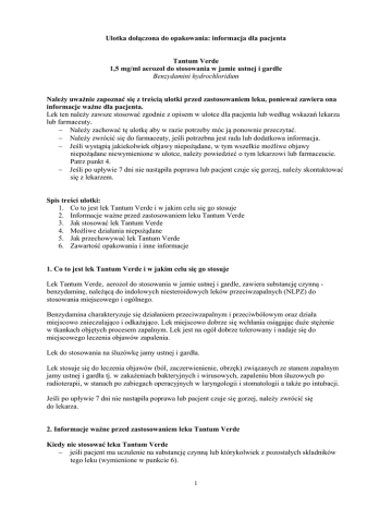 Ulotka dołączona do opakowania: informacja dla pacjenta Tantum Verde 1,5 mg/ml aerozol do stosowania w jamie ustnej i gardle Benzydamini hydrochloridum Należy uważnie zapoznać się z treścią ulotki przed zastosowaniem leku, ponieważ zawiera ona informacje ważne dla pacjenta. Lek ten należy zawsze stosować zgodnie z opisem w ulotce dla pacjenta lub według wskazań lekarza lub farmaceuty. − Należy zachować tę ulotkę aby w razie potrzeby móc ją ponownie przeczytać. − Należy zwrócić się do farmaceuty, jeśli potrzebna jest rada lub dodatkowa informacja. − Jeśli wystąpią jakiekolwiek objawy niepożądane, w tym wszelkie możliwe objawy niepożądane niewymienione w ulotce, należy powiedzieć o tym lekarzowi lub farmaceucie. Patrz punkt 4. − Jeśli po upływie 7 dni nie nastąpiła poprawa lub pacjent czuje się gorzej, należy skontaktować się z lekarzem. Spis treści ulotki: 1. Co to jest lek Tantum Verde i w jakim celu się go stosuje 2. Informacje ważne przed zastosowaniem leku Tantum Verde 3. Jak stosować lek Tantum Verde 4. Możliwe działania niepożądane 5. Jak przechowywać lek Tantum Verde 6. Zawartość opakowania i inne informacje 1. Co to jest lek Tantum Verde i w jakim celu się go stosuje Lek Tantum Verde, aerozol do stosowania w jamie ustnej i gardle, zawiera substancję czynną benzydaminę, należącą do indolowych niesteroidowych leków przeciwzapalnych (NLPZ) do stosowania miejscowego i ogólnego. Benzydamina charakteryzuje się działaniem przeciwzapalnym i przeciwbólowym oraz działa miejscowo znieczulająco i odkażająco. Lek miejscowo dobrze się wchłania osiągając duże stężenie w tkankach objętych procesem zapalnym. Lek jest na ogół dobrze tolerowany i nadaje się do miejscowego leczenia objawów zapalenia. Lek do stosowania na śluzówkę jamy ustnej i gardła. Lek stosuje się do leczenia objawów (ból, zaczerwienienie, obrzęk) związanych ze stanem zapalnym jamy ustnej i gardła tj. w zakażeniach bakteryjnych i wirusowych, zapaleniu błon śluzowych po radioterapii, w stanach po zabiegach operacyjnych w laryngologii i stomatologii a także po intubacji. Jeśli po upływie 7 dni nie nastąpiła poprawa lub pacjent czuje się gorzej, należy zwrócić się do lekarza. 2. Informacje ważne przed zastosowaniem leku Tantum Verde Kiedy nie stosować leku Tantum Verde − jeśli pacjent ma uczulenie na substancję czynną lub którykolwiek z pozostałych składników tego leku (wymienione w punkcie 6). 1 Ostrzeżenia i środki ostrożności Przed rozpoczęciem stosowania Tantum Verde należy zwrócić się do lekarza lub farmaceuty. Stosowanie, zwłaszcza długotrwałe, leków o działaniu miejscowym, może spowodować reakcję uczuleniową. W takim przypadku lek należy odstawić i zgłosić się do lekarza, który zaleci odpowiednie postępowanie. Inne leki i Tantum Verde Należy powiedzieć lekarzowi lub farmaceucie o wszystkich lekach stosowanych obecnie lub ostatnio, a także o lekach, które pacjent planuje stosować. Nie są znane oddziaływania leku Tantum Verde z innymi lekami. Ciąża i karmienie piersią W ciąży i w okresie karmienia piersią lub gdy istnieje podejrzenie, że kobieta jest w ciąży, lub gdy planuje ciążę, przed zastosowaniem tego leku należy poradzić się lekarza lub farmaceuty. Lekarz zadecyduje o możliwości stosowania leku u kobiet w ciąży i u kobiet karmiących piersią. Prowadzenie pojazdów i obsługiwanie maszyn Lek nie wpływa na zdolność prowadzenia pojazdów i obsługiwania maszyn. Lek Tantum Verde zawiera metylu parahydroksybenzoesan. Lek może powodować reakcje alergiczne (możliwe są reakcje typu późnego). 3. Jak stosować lek Tantum Verde Ten lek należy zawsze stosować zgodnie z opisem w ulotce dla pacjenta lub według wskazań lekarza lub farmaceuty. W razie wątpliwości należy zwrócić się do lekarza lub farmaceuty. Lek Tantum Verde należy rozpylać na błonę śluzową jamy ustnej i gardła. Zalecana dawka to: Dzieci i młodzież Dzieci poniżej 6 lat: 1 dawka leku ( rozpylenie) na 4 kg masy ciała, od 2 do 6 razy na dobę. Bez względu na masę ciała, jednorazowo nie należy przekraczać 4 dawek. Dzieci od 6 do 12 lat: 4 dawki leku, od 2 do 6 razy na dobę. Dzieci powyżej 12 lat: od 4 do 8 dawek leku od 2 do 6 razy na dobę. Dorośli Od 4 do 8 dawek (rozpyleń) leku od 2 do 6 razy na dobę. Każda dawka leku zawiera 0,17 ml roztworu. Nie stosować dawki większej niż zalecana. Leczenie ciągłe nie powinno być dłuższe niż 7 dni, a o jego ewentualnym przedłużeniu powinien zadecydować lekarz. 2 Instrukcja użycia: 1. Podnieść kaniulę. 2. Umieścić kaniulę w ustach i skierować jej wylot na obszar zmian zapalnych w jamie ustnej lub w gardle. 3. Mocno nacisnąć palcem karbowaną powierzchnię pompki do momentu uwolnienia dawki leku. Czynność tą powtórzyć odpowiednią ilość razy. Uwaga: Przy pierwszym użyciu leku, przycisk pompki należy nacisnąć kilka razy w celu napełnienia pompki i uzyskania prawidłowego rozpylenia. W przypadku wrażenia, że działanie leku jest za mocne lub za słabe należy zwrócić się do lekarza. Zastosowanie większej niż zalecana dawki leku Tantum Verde Przedawkowanie leku jest mało prawdopodobne w związku z małym stężeniem substancji czynnej w leku i miejscową drogą podania. Dotychczas nie obserwowano przypadków przedawkowania. W przypadku zastosowania większej dawki leku niż zalecana należy niezwłocznie skontaktować się z lekarzem lub farmaceutą. Pominięcie zastosowania leku Tantum Verde Nie należy stosować dawki podwójnej w celu uzupełnienia pominiętej dawki. W razie jakichkolwiek dalszych wątpliwości związanych ze stosowaniem tego leku należy zwrócić się do lekarza lub farmaceuty. 4. Możliwe działania niepożądane Jak każdy lek, lek ten może powodować działania niepożądane, chociaż nie u każdego one wystąpią. Bardzo rzadko (rzadziej niż u 1 na 10 000 os