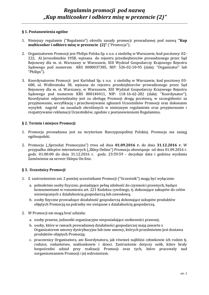 2. Organizatorem Promocji jest Philips Polska Sp. z o.o. z siedzibą w Warszawie, kod pocztowy: 02222, Al. Jerozolimskie 195B, wpisana do rejestru przedsiębiorców prowadzonego przez Sąd