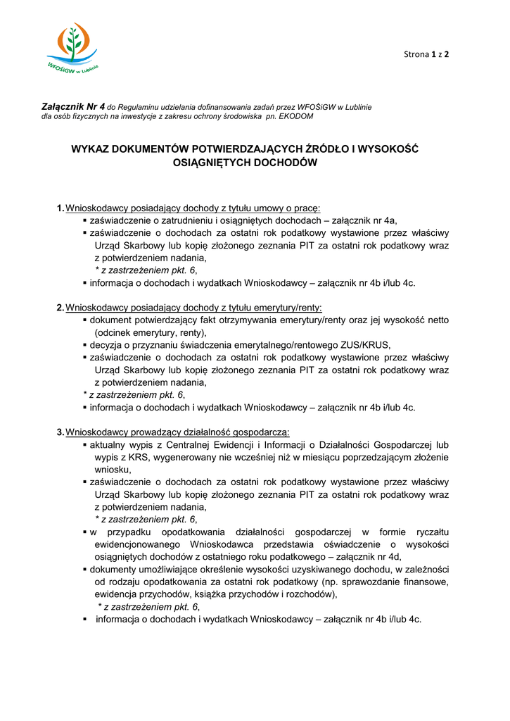 Strona 1 z 2 Załącznik Nr 4 do Regulaminu udzielania dofinansowania zadań przez WFOŚiGW w Lublinie dla osób fizycznych na inwestycje z zakresu ochrony środowiska pn. EKODOM WYKAZ DOKUMENTÓW POTWIERDZAJĄCYCH ŹRÓDŁO I WYSOKOŚĆ OSIĄGNIĘTYCH DOCHODÓW 1. Wnioskodawcy posiadający dochody z tytułu umowy o pracę: zaświadczenie o zatrudnieniu i osiągniętych dochodach – załącznik nr 4a, zaświadczenie o dochodach za ostatni rok podatkowy wystawione przez właściwy Urząd Skarbowy lub kopię złożonego zeznania PIT za ostatni rok podatkowy wraz z potwierdzeniem nadania, * z zastrzeżeniem pkt. 6, informacja o dochodach i wydatkach Wnioskodawcy – załącznik nr 4b i/lub 4c. 2. Wnioskodawcy posiadający dochody z tytułu emerytury/renty: dokument potwierdzający fakt otrzymywania emerytury/renty oraz jej wysokość netto (odcinek emerytury, renty), decyzja o przyznaniu świadczenia emerytalnego/rentowego ZUS/KRUS, zaświadczenie o dochodach za ostatni rok podatkowy wystawione przez właściwy Urząd Skarbowy lub kopię złożonego zeznania PIT za ostatni rok podatkowy wraz z potwierdzeniem nadania, * z zastrzeżeniem pkt. 6, informacja o dochodach i wydatkach Wnioskodawcy – załącznik nr 4b i/lub 4c. 3. Wnioskodawcy prowadzący działalność gospodarczą: aktualny wypis z Centralnej Ewidencji i Informacji o Działalności Gospodarczej lub wypis z KRS, wygenerowany nie wcześniej niż w miesiącu poprzedzającym złożenie wniosku, zaświadczenie o dochodach za ostatni rok podatkowy wystawione przez właściwy Urząd Skarbowy lub kopię złożonego zeznania PIT za ostatni rok podatkowy wraz z potwierdzeniem nadania, * z zastrzeżeniem pkt. 6, w przypadku opodatkowania działalności gospodarczej w formie ryczałtu ewidencjonowanego Wnioskodawca przedstawia oświadczenie o wysokości osiągniętych dochodów z ostatniego roku podatkowego – załącznik nr 4d, dokumenty umożliwiające określenie wysokości uzyskiwanego dochodu, w zależności od rodzaju opodatkowania za ostatni rok podatkowy (np. sprawozdanie finansowe, ewidencja przychodów, książka przychodów i rozchodów), * z zastrzeżeniem pkt. 6, informacja o dochodach i wydatkach Wnioskodawcy – załącznik nr 4b i/lub 4c. Strona 2 z 2 4. Wnioskodawcy wykonujący wolne zawody: dokumenty potwierdzające rejestrację działalności, posiadanie licencji, koncesji itp., zaświadczenie o dochodach za ostatni rok podatkowy wystawione przez właściwy Urząd Skarbowy lub kopię złożonego zeznania PIT za ostatni rok podatkowy wraz z potwierdzeniem nadania, * z zastrzeżeniem pkt. 6, w przypadku opodatkowania działalności gospodarczej w formie ryczałtu ewidencjonowanego Wnioskodawca przedstawia oświadczenie o wysokości osiągniętych dochodów z ostatniego roku podatkowego – załącznik nr 4d, * z zastrzeżeniem pkt. 6, informacja o dochodach i wydatkach Wnioskodawcy – załącznik nr 4b i/lub 4c. 5. Wnioskodawcy prowadzący indywidualne gospodarstwo rolne: decyzja wymiarowa dotycząca podatku rolnego (nakaz płatniczy podatku rolnego) z wyszczególnioną informacją o wielkości gospodarstwa rolnego wyrażonej w hektarach przeliczeniowych/zaświadczenie z UG o wielkości gospodarstwa rolnego wyrażonej w hektarach przeliczeniowych i hektarach fizycznych, w przypadku, gdy Wnioskodawca jest podatnikiem VAT, należy przedłożyć deklaracje od podatków i usług (VAT-7 lub VAT-7K), * z zastrzeżeniem pkt. 6 inne dokumenty potwierdzające osiągnięcie dochodu (np. decyzje z ARiMR), * z zastrzeżeniem pkt. 6 informacja o dochodach i wydatkach Wnioskodawcy – załącznik nr 4b i/lub 4c. 6. W przypadku wnioskowanej kwoty pożyczki powyżej 10 tys. zł wymagane będzie zaświadczenie/zeznanie podatkowe lub też inne dokumenty poświadczające wysokość osiągniętych dochodów za 2 ostatnie lata podatkowe. Uwaga: 1. Analogicznie jak dla Wnioskodawcy w przypadku wystąpienia Poręczyciela konieczne będzie przeprowadzenie oceny zdolności kredytowej. 2. WFOŚiGW w Lublinie zastrzega sobie prawo do wezwania Wnioskodawcy do przedłożenia dodatkowych dokumentów.