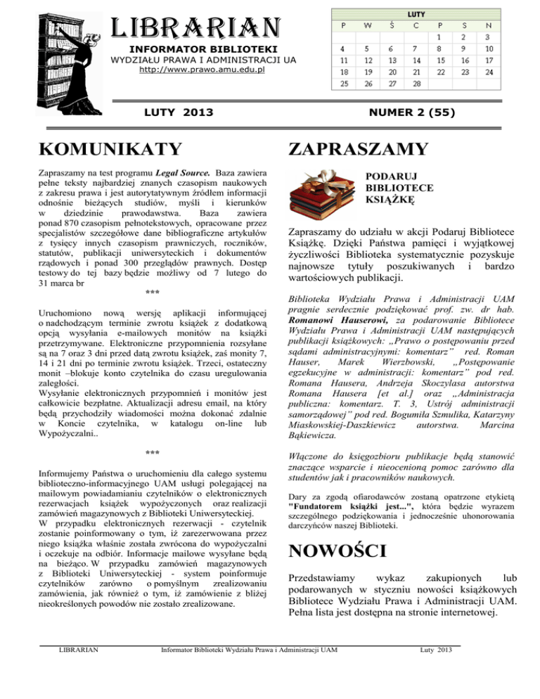 LIBRARIAN INFORMATOR BIBLIOTEKI WYDZIAŁU PRAWA I ADMINISTRACJI UA http://www.prawo.amu.edu.pl LUTY 2013 KOMUNIKATY Zapraszamy na test programu Legal Source. Baza zawiera pełne teksty najbardziej znanych czasopism naukowych z zakresu prawa i jest autorytatywnym źródłem informacji odnośnie bieżących studiów, myśli i kierunków w dziedzinie prawodawstwa. Baza zawiera ponad 870 czasopism pełnotekstowych, opracowane przez specjalistów szczegółowe dane bibliograficzne artykułów z tysięcy innych czasopism prawniczych, roczników, statutów, publikacji uniwersyteckich i dokumentów rządowych i ponad 300 przeglądów prawnych. Dostęp testowy do tej bazy będzie możliwy od 7 lutego do 31 marca br *** Uruchomiono nową wersję aplikacji informującej o nadchodzącym terminie zwrotu książek z dodatkową opcją wysyłania e-mailowych monitów na książki przetrzymywane. Elektroniczne przypomnienia rozsyłane są na 7 oraz 3 dni przed datą zwrotu książek, zaś monity 7, 14 i 21 dni po terminie zwrotu książek. Trzeci, ostateczny monit –blokuje konto czytelnika do czasu uregulowania zaległości. Wysyłanie elektronicznych przypomnień i monitów jest całkowicie bezpłatne. Aktualizacji adresu email, na który będą przychodziły wiadomości można dokonać zdalnie w Koncie czytelnika, w katalogu on-line lub Wypożyczalni.. *** Informujemy Państwa o uruchomieniu dla całego systemu biblioteczno-informacyjnego UAM usługi polegającej na mailowym powiadamianiu czytelników o elektronicznych rezerwacjach książek wypożyczonych oraz realizacji zamówień magazynowych z Biblioteki Uniwersyteckiej. W przypadku elektronicznych rezerwacji - czytelnik zostanie poinformowany o tym, iż zarezerwowana przez niego książka właśnie została zwrócona do wypożyczalni i oczekuje na odbiór. Informacje mailowe wysyłane będą na bieżąco. W przypadku zamówień magazynowych z Biblioteki Uniwersyteckiej - system poinformuje czytelników zarówno o pomyślnym zrealizowaniu zamówienia, jak również o tym, iż zamówienie z bliżej nieokreślonych powodów nie zostało zrealizowane. LIBRARIAN NUMER 2 (55) ZAPRASZAMY PODARUJ BIBLIOTECE KSIĄŻKĘ Zapraszamy do udziału w akcji Podaruj Bibliotece Książkę. Dzięki Państwa pamięci i wyjątkowej życzliwości Biblioteka systematycznie pozyskuje najnowsze tytuły poszukiwanych i bardzo wartościowych publikacji. Biblioteka Wydziału Prawa i Administracji UAM pragnie serdecznie podziękować prof. zw. dr hab. Romanowi Hauserowi, za podarowanie Bibliotece Wydziału Prawa i Administracji UAM następujących publikacji książkowych: „Prawo o postępowaniu przed sądami administracyjnymi: komentarz” red. Roman Hauser, Marek Wierzbowski, „Postępowanie egzekucyjne w administracji: komentarz” pod red. Romana Hausera, Andrzeja Skoczylasa autorstwa Romana Hausera [et al.] oraz „Administracja publiczna: komentarz. T. 3, Ustrój administracji samorządowej” pod red. Bogumiła Szmulika, Katarzyny Miaskowskiej-Daszkiewicz autorstwa. Marcina Bąkiewicza. Włączone do księgozbioru publikacje będą stanowić znaczące wsparcie i nieocenioną pomoc zarówno dla studentów jak i pracowników naukowych. Dary za zgodą ofiarodawców zostaną opatrzone etykietą "Fundatorem książki jest...", która będzie wyrazem szczególnego podziękowania i jednocześnie uhonorowania darczyńców naszej Biblioteki. NOWOŚCI Przedstawiamy wykaz zakupionych lub podarowanych w styczniu nowości książkowych Bibliotece Wydziału Prawa i Administracji UAM. Pełna lista jest dostępna na stronie internetowej. Informator Biblioteki Wydziału Prawa i Administracji UAM Luty 2013 pod adresem http://prawo.amu.edu.pl/, zakładka Nowe książki w Bibliotece. KSIĄŻKI RA 123920 RA 123921 Nadzór wspólników w spółce z ograniczoną odpowiedzialnością / Piotr Pinior ; Uniwersytet Śląski w Katowicach. Warszawa : 2013 A 123922 RA 123923 RA 123924 Apelacja w postępowaniu cywilnym : komentarz, orzecznictwo / Małgorzata Manowska. Warszawa : 2013 RA 123925 RA 123926 RA 123927 RA 123928 Prawo pracy / red. Jakub Stelina ; aut. Artur Rycak [et al.]. Warszawa : 2013 - [Stan prawny na dzień 1 grudnia 2012 r.] RA 123929 RA 123930 Zakres swobody umów w spółkach handlowych / Monika Tarska. Warszawa : 2012 RA 123931 RA 123932 Utwór : przedmiot prawa autorskiego / Wojciech Machała. Warszawa : 2013 RA 123933 RA 123934 Sporządzanie środków zaskarżenia w postępowaniu administracyjnym i sądowoadministracyjnym wraz z wzorami pism i kazusem / Piotr Gołaszewski. Warszawa : 2013 RA 123935 RA 123936 RA 123937 Ustawa o księgach wieczystych i hipotece oraz przepisy związane : komentarz / aut. Izabela Heropolitańska [et al.]. Warszawa : 2013 - [Stan prawny na dzień 10.11.2012 r.] RA 123938 RA 123939 Zobowiązania / Adam Doliwa. Warszawa : 2012 - 3. wyd. RA 123940 RA 123941 Zasady udzielania pomocy publicznej przez gminy / Robert Zenc. Warszawa : 2012 - Stan prawny na dzień 1 października 2012 r. RA 123942 Manuale del processo civile / Nicola Picardi. Milano : cop. 2013 - 3 ed. RA 123943 RA 123944 Finanse : praca zbiorowa / pod red. nauk. Janusza Ostaszewskiego ; [aut.: Zdzisław Fedorowicz et al.]. Warszawa : 2010 - Wyd. 5 zm. i rozszerz RA 123945 RA 123946 Rachunkowość budżetu, jednostek budżetowych i samorządowych zakładów budżetowych / Anna Zysnarska. Gdańsk : 2012 - Wyd. 2, stan prawny na dzień 1 czerwca 2012. RA 123947 Die Eventualmaxime in der Schweizerischen Zivilprozessordnung / Rafael Klingler. Basel : cop. 2010 RA 123951 Projekt Kodeksu Etyki Adwokackiej z dnia 6 maja 2010 r. / [Okręgowa Rada Adwokacka w Warszawie, Okręgowa Izba Radców Prawnych w Warszawie]. Warszawa : 2010 RA 123952 Kryminologia - zarys wykładu : podręcznik dla studentów kierunku bezpieczeństwo wewnętrzne / Dariusz Jagiełło. Skierniewice : 2012 RA 123953 Technicznokryminalistyczne badania autentyczności dokumentów publicznych : materiały 8. konferencji, Poznań
