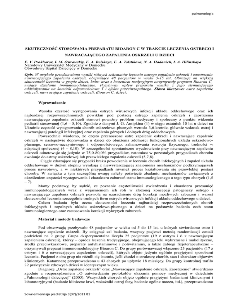 pulmonologia SKUTECZNOŚĆ STOSOWANIA PREPARATU BIOARON C W TRAKCIE LECZENIA OSTREGO I NAWRACAJĄCEGO ZAPALENIA OSKRZELI U DZIECI E. V. Prokhorov, I. M. Ostrowskiy, E. A. Belskaya, E. A. Tolstikova, N. A. Hodanich, I. A. Hilinskaya Narodowy Uniwersytet Medyczny w Doniecku Obwodowy Szpital Dziecięcy w Doniecku Opis. W artykule przedstawiono wyniki różnych schematów leczenia ostrego zapalenia oskrzeli i zaostrzenia nawracającego zapalenia oskrzeli, obejmujące 48 pacjentów w wieku 5-15 lat. Obrazuje on większą skuteczność leczenia w grupie dzieci, które wraz z leczeniem tradycyjnym otrzymywały preparat Bioaron C, mający działanie immunomodulacyjne. Pozytywny wpływ preparatu wynika z jego stymulującego oddziaływania na komórki odpornościowe T i efektu przeciwzapalnego. Słowa kluczowe: ostre zapalenie oskrzeli, nawracające zapalenie oskrzeli, Bioaron C, dzieci. Wprowadzenie Wysoka częstość występowania ostrych wirusowych infekcji układu oddechowego oraz ich najbardziej rozpowszechnionych powikłań pod postacią ostrego zapalenia oskrzeli i zaostrzenia nawracającego zapalenia oskrzeli stanowi poważny problem medyczny i społeczny z punktu widzenia pediatrii stosowanej (1,6 – 8,10). Zgodnie z danymi J. G. Antipkina (1) w ciągu ostatnich 10 lat u dzieci na Ukrainie częstość występowania chorób oskrzelowo-płucnych wzrosła 3,6-krotnie, głównie wskutek ostrej i nawracającej patologii infekcyjnej oraz zapalenia górnych i dolnych dróg oddechowych. Powszechnie wiadomo, że często przenoszone ostre zapalenie oskrzeli i nawracające zapalenie oskrzeli w następstwie doprowadza u dzieci do obniżenia zdolności funkcjonalnych układu oskrzelowopłucnego, sercowo-naczyniowego i odpornościowego, zahamowania rozwoju fizycznego, trudności w adaptacji społecznej (4 – 8,10). W szczególności spontaniczne wyzdrowienie przy nawracającym zapaleniu oskrzeli odnotowuje się jedynie w 75,0-80,0% przypadków, natomiast w pozostałych przypadkach choroba ewoluuje do astmy oskrzelowej lub przewlekłego zapalenia oskrzeli (5,7,8). Ciągle zdarzające się przypadki braku powodzenia w leczeniu chorób infekcyjnych i zapaleń układu oddechowego w dużym stopniu wynikają z niewystarczającej znajomości mechanizmów podtrzymujących proces nawrotowy, a w niektórych przypadkach również proces kształtowania się przewlekłej postaci choroby. W związku z tym szczególną uwagę należy poświęcić zbadaniu mechanizmów związanych z określeniem częstości występowania i charakteru zaburzeń stanu immunologicznego u tego typu chorych (1,5 – 7). Mamy podstawy, by sądzić, że poznanie częstotliwości stwierdzenia i charakteru przesunięć immunopatologicznych wraz z wyjaśnieniem ich roli w złożonej koncepcji patogenezy ostrego i nawracającego zapalenia oskrzeli pozwolą na uzasadnienie dróg korekcji możliwych zaburzeń i wzrost skuteczności leczenia szczególnie trudnych form ostrych wirusowych infekcji układu oddechowego u dzieci. Celem badania była ocena skuteczności leczenia najbardziej rozpowszechnionych chorób infekcyjnych i zapalnych układu oskrzelowo-płucnego u dzieci na podstawie badania cech stanu immunologicznego oraz zastosowania korekcji wykrytych zaburzeń. Materiał i metody badawcze Pod obserwacją przebywało 48 pacjentów w wieku od 5 do 15 lat, u których stwierdzono ostre i nawracające zapalenie oskrzeli. By osiągnąć cel badania, wszyscy pacjenci metodą randomizacji zostali podzieleni na 2 grupy. Grupa eksperymentalna liczyła 25 pacjentów (19 z ostrym i 6 z nawracającym zapaleniem oskrzeli), którzy – oprócz leczenia tradycyjnego, obejmującego leki wykrztuśne i mukolityczne, środki przeciwkaszlowe, preparaty antyhistaminowe i poliwitaminy, a także zabiegi fizjoterapeutyczne – otrzymywali preparat immunomodulacyjny Bioaron C. Do grupy porównawczej włączono 23 pacjentów (17 z ostrym i 6 z nawracającym zapaleniem oskrzeli), których objęto jedynie ogólnie przyjętymi sposobami leczenia. Pacjenci z obu grup nie różnili się istotnie, jeśli chodzi o strukturę chorób, stan i charakter objawów klinicznych. Katamnezę przeprowadzono u 43 chorych po upływie 18 miesięcy. Do grupy kontrolnej trafiło 22 praktycznie zdrowych dzieci w identycznym wieku. Diagnozę „Ostre zapalenie oskrzeli” oraz „Nawracające zapalenie oskrzeli. Zaostrzenie” stwierdzano zgodnie z rozporządzeniem „O zatwierdzaniu protokołów okazania pomocy medycznej w dziedzinie „Pulmonologii dziecięcej” (2005). Wszystkich chorych objęto ogólnie przyjętymi badaniami klinicznymi i laboratoryjnymi (badanie kliniczne krwi, wskaźniki ostrej fazy, badanie ogólne moczu, itd.), przeprowadzono Sowriemiennaja piediatrija 3(37)/2011 81 pulmonologia również badanie radiologiczne organów klatki piersiowej. Uwzględniając cel badania, sprawdzano również kondycję komórek odpornościowych przez określenie subpopulacji limfocytów CD3+, CD4+, CD8+, CD20+ oraz komórek zerowych (odpowiednie testy z użyciem przeciwciał monoklonalnych i jednoczesnym wykorzystaniem zjawiska luminescencji). Zawartość cytokin określano na podstawie wskaźników aktywności interleukin prozapalnych: IL-1, IL-6, IL8 oraz czynnika martwicy guza (TNF-α) za pomocą immunoenzymatycznego testu fazy stałej ELISA z wykorzystaniem zestawów przeciwciał monoklonalnych i odczynników produkcji TOW Proteinowyj kontur (St. Petersburg, Rosja). Badanie immunologiczne przeprowadzono dwukrotnie: przy przyjęciu i w 8-10 dni po rozpoczęciu leczenia. Statystyczne opracowanie wyników badania wykonano za pomocą komputera klasy IBM PC Pentium IV z wykorzystaniem ogólnie przyjętych metod statystycznych obliczania wariancji, przeprowadzania testu t-Studenta oraz wyznaczania przedziału ufności. Wyniki badania oraz ich omówienie W większości przypadków u dzieci z ostrym i nawracającym zapaleniem oskrzeli, wraz z umiarkowanie wyrażonymi ogólnymi objawami into