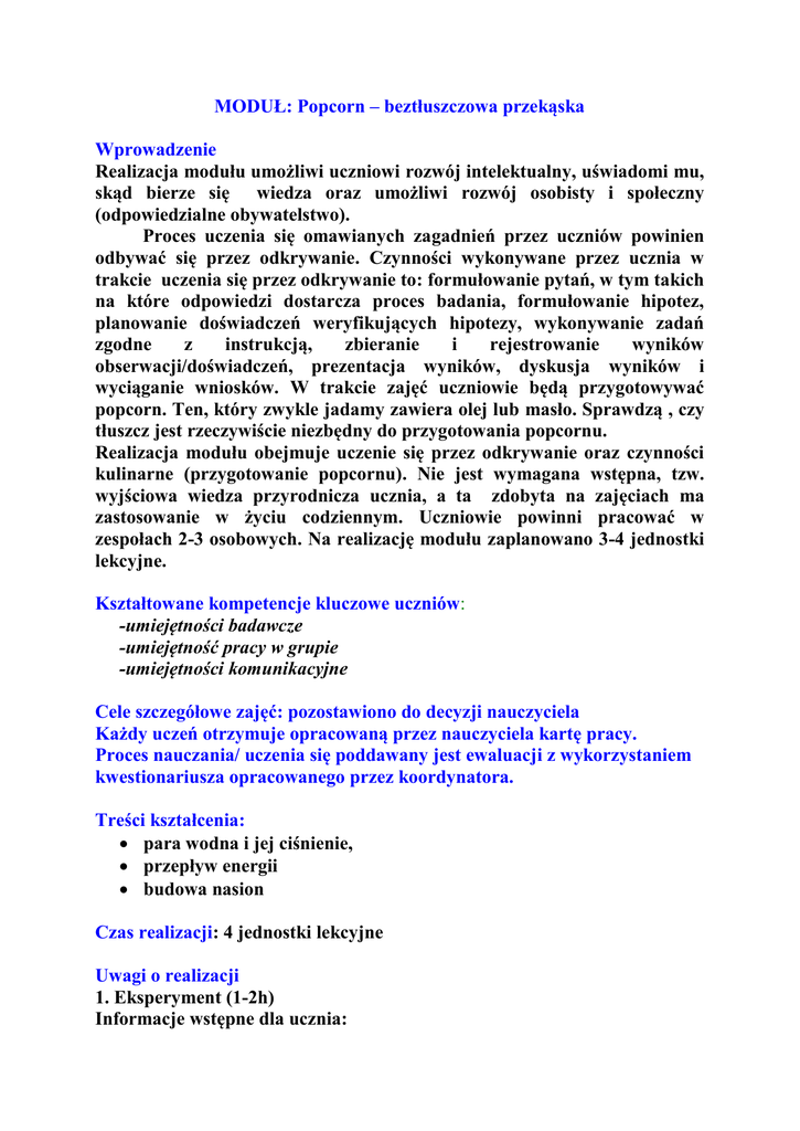 MODUŁ: Popcorn – beztłuszczowa przekąska Wprowadzenie Realizacja modułu umożliwi uczniowi rozwój intelektualny, uświadomi mu, skąd bierze się wiedza oraz umożliwi rozwój osobisty i społeczny (odpowiedzialne obywatelstwo). Proces uczenia się omawianych zagadnień przez uczniów powinien odbywać się przez odkrywanie. Czynności wykonywane przez ucznia w trakcie uczenia się przez odkrywanie to: formułowanie pytań, w tym takich na które odpowiedzi dostarcza proces badania, formułowanie hipotez, planowanie doświadczeń weryfikujących hipotezy, wykonywanie zadań zgodne z instrukcją, zbieranie i rejestrowanie wyników obserwacji/doświadczeń, prezentacja wyników, dyskusja wyników i wyciąganie wniosków. W trakcie zajęć uczniowie będą przygotowywać popcorn. Ten, który zwykle jadamy zawiera olej lub masło. Sprawdzą , czy tłuszcz jest rzeczywiście niezbędny do przygotowania popcornu. Realizacja modułu obejmuje uczenie się przez odkrywanie oraz czynności kulinarne (przygotowanie popcornu). Nie jest wymagana wstępna, tzw. wyjściowa wiedza przyrodnicza ucznia, a ta zdobyta na zajęciach ma zastosowanie w życiu codziennym. Uczniowie powinni pracować w zespołach 2-3 osobowych. Na realizację modułu zaplanowano 3-4 jednostki lekcyjne. Kształtowane kompetencje kluczowe uczniów: -umiejętności badawcze -umiejętność pracy w grupie -umiejętności komunikacyjne Cele szczegółowe zajęć: pozostawiono do decyzji nauczyciela Każdy uczeń otrzymuje opracowaną przez nauczyciela kartę pracy. Proces nauczania/ uczenia się poddawany jest ewaluacji z wykorzystaniem kwestionariusza opracowanego przez koordynatora. Treści kształcenia: para wodna i jej ciśnienie, przepływ energii budowa nasion Czas realizacji: 4 jednostki lekcyjne Uwagi o realizacji 1. Eksperyment (1-2h) Informacje wstępne dla ucznia: Zapoznaj się dokładnie z instrukcją przed wykonaniem eksperymentu. Sprawdź, czy dysponujesz wszystkimi przyrządami i materiałami niezbędnymi do wykonania eksperymentu. Wykonuj po kolei wszystkie czynności zgodnie z instrukcją. Obserwuj przebieg eksperymentu. Dokonaj wszystkich możliwych obserwacji (na jakie oczywiście pozwala przebieg tego eksperymentu). Zaproponuj sposób odnotowywania wyników obserwacji, a następnie kolejno je zapisuj. Używaj poprawnej terminologii (biologicznej, chemicznej itd.) opisując swoje spostrzeżenia i dokonując wyjaśniania obserwowanego procesu. Wszyscy członkowie grupy powinni być zaangażowani w wykonanie zadania Przyrządy i materiały dla jednej grupy: maszynka elektryczna lub palnik, łyżka oleju, garść popcornu, garnek, pokrywka szklana Przepis na pocorn- instrukcja dla ucznia Do garnka wlej olej, wsyp popcorn i przykryj pokrywką. Postaw garnek na ogniu. Obserwuj i odnotowuj swoje wszystkie spostrzeżenia. 2. Uczenie się przez rozwiązywanie problemów (1-2h) Zadania dla ucznia I. Problem badawczy i hipoteza 1. Sformułuj 5 najbardziej istotnych, ważnych pytań, które pojawiają się (nasuwają się) w związku z przeprowadzoną obserwacją podczas wykonywania eksperymentu. 2. Wybierz jedno pytanie, na które chciałbyś znaleźć odpowiedź za pośrednictwem eksperymentu. 3. Sformułuj to pytanie tak, aby miało charakter “odkrywczy” a jego zakres dotyczył relacji (zależności) między dwiema zmiennymi 4. Sformułuj hipotezę dotyczącą problemu, który zawarty jest w pytaniu i który chcesz zbadać 5. Uzasadnij hipotezę opierając się na wiedzy naukowej. II. Planowanie eksperymentu sprawdzającego słuszność (poprawność) hipotezy -Zaproponuj poszczególne etapy eksperymentu z uwzględnieniem fazy kontrolnej -Wypisz niezbędny sprzęt i materiały do wykonania eksperymentu -Skonsultuj się z nauczycielem w celu sprawdzenia swoich propozycji i naniesienia ewentualnych poprawek - Uzyskaj zgodę nauczyciela a wykonanie eksperymentu i przeprowadź go -Zaprezentuj wyniki eksperymentu w odpowiedniej formie (tabela, diagram, graf, itp.) -Przeanalizuj wyniki i zinterpretuj je -Sprawdź relacje między postawionym przez ciebie pytaniem badawczym, a uzyskanymi wynikami III. W podsumowującej dyskusji grupowej -Wyraź swoją opinię na temat etapów przeprowadzonego przez Ciebie eksperymentu -Zaproponuj zmiany w przebiegu eksperymentu (wyłącznie w stopniu, w jakim jest to konieczne) -Zapisz pytania i wątpliwości, które pojawiły się w trakcie wykonywanego zadania -Opracuj razem z członkami Twojej grupy podsumowanie eksperymentu i zaprezentuj na forum klasy IV.W podsumowującej dyskusji klasowej -Ustosunkuj się do wykonanego zadania biorąc pod uwagę informacje zwrotne uzyskane od innych grup V. Postaraj się, aby raport miał właściwą strukturę, był estetyczny i czytelny. VI. Powiązanie zagadnienia z programem Zagadnienia modułu nie są powiązane z żadnym działem programu i mogą zostać zrealizowane przy okazji omawiania zagadnienia wiązań chemicznych, węglowodanów, kinetyki i termodynamiki. VII. Wykaz „dobrych rad” i pytań dla nauczyciela (do wykorzystania na zajęciach) Dlaczego popcorn “strzela”? Przygotuj swój popcorn w domu, w mikrofalówce. Po wyjęciu go z urządzenia możesz dodać trochę masła i posolić. Odnotuj wszystkie obserwacje rozpoczynając od obserwacji ziarna kukurydzy do momentu, kiedy popcorn jest gotowy do spożycia. Możesz zabrać popcorn do szkoły i poczęstować kolegów. Wszystkie obserwacje zapisuj w kolejności chronologicznej Czy to, kto kupił i gdzie ziarna kukurydzy ma jakieś znaczenie? Sformułuj i zapisz hipotezę wyjaśniającą dlaczego popcorn strzela Na jakiej wiedzy oparłeś swoje przypuszczenia? Czy postawiona przez ciebie hipoteza jest zgodna z twoją wiedzą? Jakie dodatkowe informacje były ci potrzebne, aby swoje przypuszczenie (hipotezę) sformułować? Zaproponuj eksperyment weryfikujący twoje przypuszczenie Obserwacje powinny być prowadzone przed podgrzewaniem nasion, w trakcie podgrzewania i po zakończen