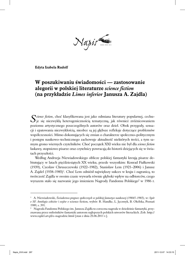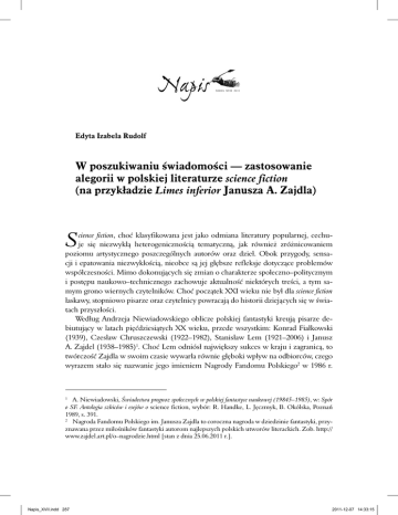 SERIA XVII 2011 Edyta Izabela Rudolf W poszukiwaniu świadomości — zastosowanie alegorii w polskiej literaturze science fiction (na przykładzie Limes inferior Janusza A. Zajdla) S cience fiction, choć klasyfikowana jest jako odmiana literatury popularnej, cechuje się niezwykłą heterogenicznością tematyczną, jak również zróżnicowaniem poziomu artystycznego poszczególnych autorów oraz dzieł. Obok przygody, sensacji i epatowania niezwykłością, nieobce są jej głębsze refleksje dotyczące problemów współczesności. Mimo dokonujących się zmian o charakterze społeczno–politycznym i postępu naukowo–technicznego zachowuje aktualność niektórych treści, a tym samym grono wiernych czytelników. Choć początek XXI wieku nie był dla science fiction łaskawy, stopniowo pisarze oraz czytelnicy powracają do historii dziejących się w światach przyszłości. Według Andrzeja Niewiadowskiego oblicze polskiej fantastyki kreują pisarze debiutujący w latach pięćdziesiątych XX wieku, przede wszystkim: Konrad Fiałkowski (1939), Czesław Chruszczewski (1922–1982), Stanisław Lem (1921–2006) i Janusz A. Zajdel (1938–1985)1. Choć Lem odniósł największy sukces w kraju i zagranicą, to twórczość Zajdla w swoim czasie wywarła równie głęboki wpływ na odbiorców, czego wyrazem stało się nazwanie jego imieniem Nagrody Fandomu Polskiego2 w 1986 r. A. Niewiadowski, Świadectwa prognoz społecznych w polskiej fantastyce naukowej (19845–1985), w: Spór o SF. Antologia szkiców i esejów o science fiction, wybór: R. Handke, L. Jęczmyk, B. Okólska, Poznań 1989, s. 391. 2 Nagroda Fandomu Polskiego im. Janusza Zajdla to coroczna nagroda w dziedzinie fantastyki, przyznawana przez miłośników fantastyki autorom najlepszych polskich utworów literackich. Zob. http:// www.zajdel.art.pl/o–nagrodzie.html [stan z dnia 25.06.2011 r.]. 1 Napis_XVII.indd 287 2011-12-07 14:33:15 288 Edyta Izabela Rudolf W pamięci czytelników oraz w większości opracowań krytycznych postrzegany jest jako pisarz literatury społecznie zaangażowanej, za przykłady takiej uznaje się szczególnie jego powieści: Cylinder van Troffa (1980), Limes inferior (1982) oraz Paradyzję (1984)3. Przedmiotem dalszych rozważań będzie Limes inferior napisana w szczególnie trudnym dla Polski okresie, bo w latach stanu wojennego, trudno się więc dziwić, że odczytuje się ją jako alegorię czasów, w których powstała. Choć nie była tekstem wyjątkowym pod względem tematyki na polskim rynku wydawniczym lat osiemdziesiątych XX wieku, to według autorki jej aktualność i możliwość odczytań na różnych poziomach wynika m. in. z zastosowania techniki alegorii. Utopia — antyutopia — dystonia Społeczeństwo, które jest przedmiotem analizy w Limes inferior, to przykład wizji przyszłości nazwanej przez Lema „komputerokracją”, czyli obraz społeczności rządzonej przez maszyny bądź urządzenia będące instrumentem dyktatorskiej władzy ludzi lub innych istot4. Powieść Zajdla „przedstawia świat uporządkowany, w którym zrealizowano ideał «doskonałego» społeczeństwa w myśl zasady, że skoro nie można zorganizować zupełnie idealnego państwa, trzeba wychować idealnego obywatela i to w taki sposób, by był przekonany o doskonałości stworzonego systemu”5. Zakres tematyczny, jak też konstrukcja świata przedstawionego, umieszcza Limes inferior w grupie tekstów antyutopijnych, będących wersjami negatywnymi utopii — gatunku o bogatej tradycji sięgającej starożytności i Państwa Platona. Utwory takie jak Utopia Thomasa More’a (1516), Miasto słońca Tommasa Campanelli (1602) czy L’An 2440 Louisa–Sébastiena Merciera (1771) stały się podstawą określenia wyznaczników gatunkowych6. W uto- Por. z pozycji najnowszych: L. Będkowski, Ponure raje Janusza A. Zajdla: wizje społeczeństw totalitarnych, czyli o prozie fantastycznonaukowej Janusza A. Zajdla, Gdańsk 2000; R. Klementowski, Modelowe boksowanie ze światem. Polska literatura fantastyczna na przełomie lat 70. i 80., Toruń 2003; P. Ćwikła, Boksowanie świata. Wizje ładu społecznego na podstawie twórczości Janusza A. Zajdla, Katowice 2006. 4 S. Lem, Fantastyka i futurologia, t. 2, Kraków 1989, s. 447. 5 D. Wojtczak, Samobójstwo przez cywilizację. O antyutopii w prozie polskiej XX wieku, w: Wizje końca świata w literaturze, red. M. Lalak, Szczecin 1992, s. 211. 6 Wyznaczniki gatunkowe, przywoływane niemal we wszystkich późniejszych pracach polskich badaczy, opracował Witold Ostrowski, hasło: Utopia, „Zagadnienia Rodzajów Literackich” 1958, nr 1, s. 222. Kategorią utopii zajmowali się m. in.: A. Świętochowski, Utopie w rozwoju historycznym (Warszawa 1910), A. Goreniowa, Funkcje ideologiczne narracyjnej formy utopii (w: Literatura i metodologia, red. J. Trzynadlowski, Wrocław–Warszawa–Kraków 1970), S. Graciotti, Utopia w literaturze polskiego Oświecenia („Wiek Oświecenia. Wokół problemów literatury i filozofii”, Warszawa 1978, z. 3), A. Zgorzelski, Fantastyka. Utopia. Science fiction (Warszawa 1980), A. Kowalska, Od utopii do antyutopii (Warszawa 1987), D. Markiewicz, Wątki i motywy w utopiach polskiego oświecenia („Prace Naukowe Uniwersytetu Śląskiego” 1997, nr 1600, s. 36–49), R. Klementowski, Mimetyczność utopii. Elementy myślenia utopijnego w cywilizacji europejskiej („Litteraria” 1998, t. 29, s. 195–216), A. Dróżdż, Od liber mundi do hipertekstu. 3 Napis_XVII.indd 288 2011-12-07 14:33:15 W poszukiwaniu świadomości — zastosowanie alegorii w polskiej literaturze science fiction… 289 piach literackich utrwalone są odwieczne potrzeby i marzenia ludzi o doskonałym świecie, artystyczne obrazy wyobrażające odwieczne tęsknoty: „Pochodną myślenia utopijnego jest utopizm rozumiany jako «marzenie społeczne» i stanowiący istotę tendencji utopijnych w dziejach ludzkości”7. Władysław Tatarkiewicz w rozp
