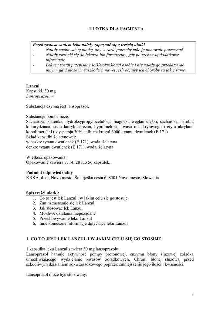 ULOTKA DLA PACJENTA Przed zastosowaniem leku należy zapoznać się z treścią ulotki. Należy zachować tę ulotkę, aby w razie potrzeby móc ją ponownie przeczytać. Należy zwrócić się do lekarza lub farmaceuty, gdy potrzebne są dodatkowe informacje Lek ten został przepisany ściśle określonej osobie i nie należy go przekazywać innym, gdyż może im zaszkodzić, nawet jeśli objawy ich choroby są takie same. Lanzul Kapsułki, 30 mg Lansoprazolum Substancją czynną jest lansoprazol. Substancje pomocnicze: Sacharoza, ziarenka, hydroksypropyloceluloza, magnezu węglan ciężki, sacharoza, skrobia kukurydziana, sodu laurylosiarczan, hypromeloza, kwasu metakrylowego i etylu akrylanu kopolimer (1:1), dyspersja 30%, talk, makrogol 6000, tytanu dwutlenek (E 171) Skład kapsułki żelatynowej: wieczko: tytanu dwutlenek (E 171), woda, żelatyna denko: tytanu dwutlenek (E 171), woda, żelatyna Wielkość opakowania: Opakowanie zawiera 7, 14, 28 lub 56 kapsułek. Podmiot odpowiedzialny KRKA, d. d., Novo mesto, Šmarješka cesta 6, 8501 Novo mesto, Słowenia Spis treści ulotki: 1. Co to jest lek Lanzul i w jakim celu się go stosuje 2. Zanim zastosuje się lek Lanzul 3. Jak stosować lek Lanzul 4. Możliwe działania niepożądane 5. Przechowywanie leku Lanzul 6. Inne konieczne informacje dotyczące leku Lanzul 1. CO TO JEST LEK LANZUL I W JAKIM CELU SIĘ GO STOSUJE 1 kapsułka leku Lanzul zawiera 30 mg lansoprazolu. Lansoprazol hamuje aktywność pompy protonowej, enzymu błony śluzowej żołądka umożliwiającego wydzielanie kwasów żołądkowych. Chroni błonę śluzową przed szkodliwym działaniem soku żołądkowego poprzez zmniejszenie jego ilości i kwaśności. Lansoprazol może być stosowany: 1 - - w leczeniu choroby wrzodowej dwunastnicy i żołądka potwierdzonej za pomocą endoskopii lub badania radiologicznego, w leczeniu refluksowego zapalenia przełyku, w długotrwałym zapobieganiu nawrotom refluksowego zapalenia przełyku, w leczeniu zespołu Zollingera-Ellisona, w leczeniu łagodnych owrzodzeń żołądka i dwunastnicy powstałych w trakcie terapii NLPZ (niesteroidowe leki przeciwzapalne) u pacjentów wymagających stałego leczenia NLPZ, w zapobieganiu nawrotom wrzodów żołądka i dwunastnicy w trakcie terapii NLPZ u pacjentów z ryzykiem choroby wrzodowej wymagających stałego leczenia NLPZ, w eradykacji Helicobacter pylori w skojarzeniu z odpowiednią terapią antybiotykami i w zapobieganiu nawrotom owrzodzeń związanych z zakażeniem H. pylori. 2. ZANIM ZASTOSUJE SIĘ LANZUL Nie należy stosować leku Lanzul w przypadku nadwrażliwości (uczulenia) na lansoprazol lub którąkolwiek substancję pomocniczą leku. Zachować szczególną ostrożność stosując Lanzul W celu rozpoznania choroby wrzodowej żołądka i dwunastnicy oraz refluksowego zapalenia przełyku lekarz zaleci wykonanie badania endoskopowego lub innych odpowiednich badań. Przed rozpoczęciem leczenia lansoprazolem choroby wrzodowej żołądka lekarz powinien wykluczyć obecność złośliwego nowotworu żołądka, ponieważ lek ten może maskować objawy choroby, co opóźni właściwe rozpoznanie. Należy zachować ostrożność przy stosowaniu lansoprazolu u pacjentów z ciężkimi zaburzeniami czynności wątroby. Leczenie lansoprazolem może powodować niewielki wzrost ryzyka zakażeń żołądkowojelitowych spowodowanych przez takie bakterie, jak: Salmonella i Campylobacter. U pacjentów z chorobą wrzodową żołądka i dwunastnicy należy brać pod uwagę możliwość zakażenia H. pylori jako czynnika przyczynowego choroby. W przypadku stosowania lansoprazolu w skojarzeniu z antybiotykami w ramach eradykacji H. pylori lekarz ustali schemat stosowania tych antybiotyków (patrz punkt: Jak stosować lek Lanzul). W przypadku pacjentów, u których leczenie lansoprazolem trwa dłużej niż rok, lekarz oceni wynikające z tego możliwe korzyści i ryzyko dla pacjenta. W przypadku wystąpienia zaburzeń wzroku podczas długotrwałej terapii (ponad 1 rok), należy zasięgnąć porady okulisty. Stosowanie leku Lanzul z jedzeniem i piciem: Lek należy przyjmować rano, przed śniadaniem. Jeśli zachodzi konieczność przyjmowania leku dwa razy na dobę, należy jedną dawkę zażyć przed śniadaniem, a drugą przed kolacją. 2 Przyjmowanie leku równocześnie z pokarmem powoduje spowolnienie i pogorszenie wchłaniania lansoprazolu. Stosowanie leku Lanzul u dzieci Nie zaleca się stosowania lansoprazolu u dzieci, ponieważ bezpieczeństwo i skuteczność stosowania leku nie zostały potwierdzone w tej grupie wiekowej. Stosowanie leku Lanzul u pacjentów z zaburzeniami czynności nerek i (lub) wątroby Nie ma konieczności zmiany dawki leku u pacjentów z zaburzeniami czynności nerek. Nie należy jednak stosować dawki większej niż zwykle stosowana 30 mg na dobę. Należy zachować ostrożność w przypadku leczenia lansoprazolem pacjentów z łagodnymi zaburzeniami czynności wątroby. Pacjenci z łagodnymi zaburzeniami czynności wątroby nie powinni otrzymywać leku w dawce większej niż 30 mg, u osób z umiarkowanymi zaburzeniami czynności wątroby dawka nie powinna być większa niż 15 mg na dobę. Z powodu braku danych dotyczących pacjentów z ciężkimi zaburzeniami czynności wątroby nie należy stosować lansoprazolu u tych pacjentów. Stosowanie leku Lanzul u pacjentów w wieku podeszłym Leczenie lansoprazolem pacjentów w tej grupie wiekowej prowadzi się indywidualnie dobraną dawką z zakresu 15-30 mg. Nie należy stosować dawki większej niż 30 mg na dobę. Ciąża Przed zastosowaniem leku należy poradzić się lekarza lub farmaceuty Nie są dostępne dane kliniczne dotyczące przyjmowania leku w ciąży. Z powodu braku danych nie zaleca się stosowania lansoprazolu w ciąży. Karmienie piersią Przed zastosowaniem leku należy poradzić się lekarza lub farmaceuty Lekarz podejmie decyzję o kontynuacji lub przerwaniu karmienia piersią lub o kontynuacji lub prze