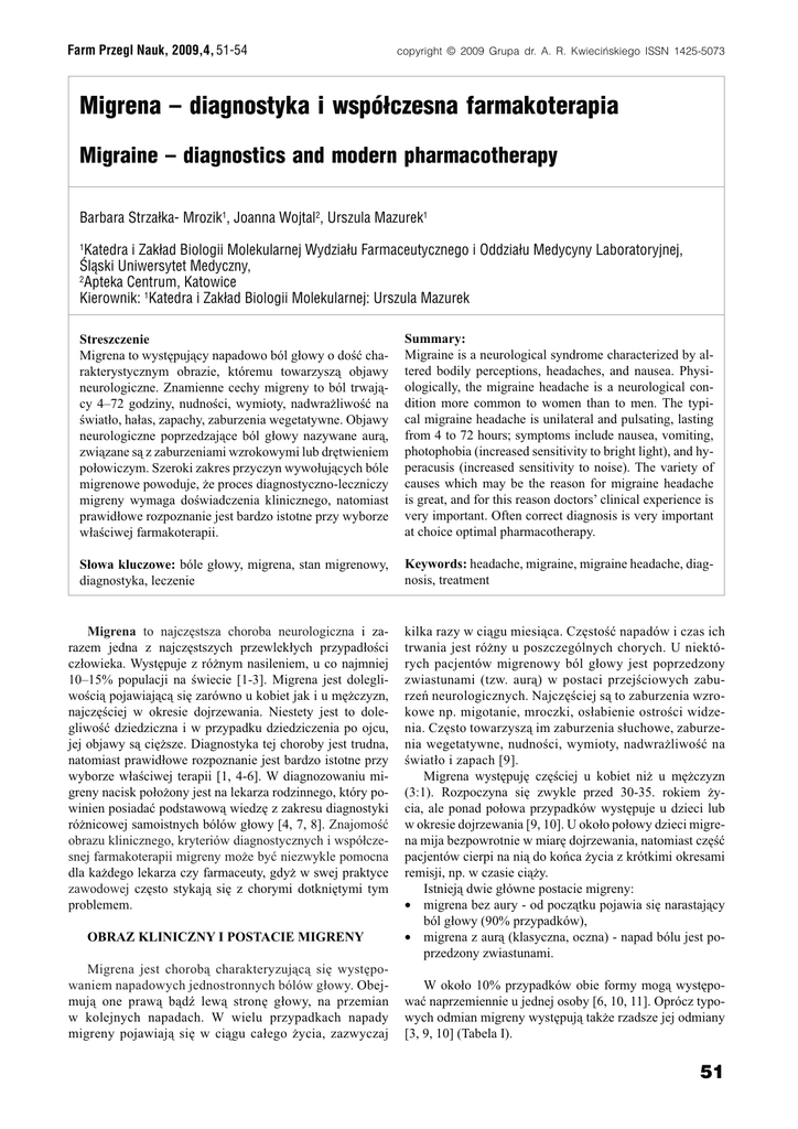 &ARM0RZEGL.AUK COPYRIGHT'RUPADR!2+WIECIÊSKIEGO)33. -IGRENApDIAGNOSTYKAIWSPÌCZESNAFARMAKOTERAPIA -IGRAINEpDIAGNOSTICSANDMODERNPHARMACOTHERAPY "ARBARA3TRZAKA-ROZIK*OANNA7OJTAL5RSZULA-AZUREK +ATEDRAI:AKAD"IOLOGII-OLEKULARNEJ7YDZIAU&ARMACEUTYCZNEGOI/DDZIAU-EDYCYNY,ABORATORYJNEJ gLSKI5NIWERSYTET-EDYCZNY !PTEKA#ENTRUM+ATOWICE +IEROWNIK+ATEDRAI:AKAD"IOLOGII-OLEKULARNEJ5RSZULA-AZUREK Streszczenie Migrena to występujący napadowo ból głowy o dość charakterystycznym obrazie, któremu towarzyszą objawy neurologiczne. Znamienne cechy migreny to ból trwający 4–72 godziny, nudności, wymioty, nadwrażliwość na światło, hałas, zapachy, zaburzenia wegetatywne. Objawy neurologiczne poprzedzające ból głowy nazywane aurą, związane są z zaburzeniami wzrokowymi lub drętwieniem połowiczym. Szeroki zakres przyczyn wywołujących bóle migrenowe powoduje, że proces diagnostyczno-leczniczy migreny wymaga doświadczenia klinicznego, natomiast prawidłowe rozpoznanie jest bardzo istotne przy wyborze właściwej farmakoterapii. Summary: Migraine is a neurological syndrome characterized by altered bodily perceptions, headaches, and nausea. Physiologically, the migraine headache is a neurological condition more common to women than to men. The typical migraine headache is unilateral and pulsating, lasting from 4 to 72 hours; symptoms include nausea, vomiting, photophobia (increased sensitivity to bright light), and hyperacusis (increased sensitivity to noise). The variety of causes which may be the reason for migraine headache is great, and for this reason doctors’ clinical experience is very important. Often correct diagnosis is very important at choice optimal pharmacotherapy. Słowa kluczowe: bóle głowy, migrena, stan migrenowy, diagnostyka, leczenie Keywords: headache, migraine, migraine headache, diagnosis, treatment Migrena to najczęstsza choroba neurologiczna i zarazem jedna z najczęstszych przewlekłych przypadłości człowieka. Występuje z różnym nasileniem, u co najmniej 10–15% populacji na świecie [1-3]. Migrena jest dolegliwością pojawiającą się zarówno u kobiet jak i u mężczyzn, najczęściej w okresie dojrzewania. Niestety jest to dolegliwość dziedziczna i w przypadku dziedziczenia po ojcu, jej objawy są cięższe. Diagnostyka tej choroby jest trudna, natomiast prawidłowe rozpoznanie jest bardzo istotne przy wyborze właściwej terapii [1, 4-6]. W diagnozowaniu migreny nacisk położony jest na lekarza rodzinnego, który powinien posiadać podstawową wiedzę z zakresu diagnostyki różnicowej samoistnych bólów głowy [4, 7, 8]. Znajomość obrazu klinicznego, kryteriów diagnostycznych i współczesnej farmakoterapii migreny może być niezwykle pomocna dla każdego lekarza czy farmaceuty, gdyż w swej praktyce zawodowej często stykają się z chorymi dotkniętymi tym problemem. OBRAZ KLINICZNY I POSTACIE MIGRENY Migrena jest chorobą charakteryzującą się występowaniem napadowych jednostronnych bólów głowy. Obejmują one prawą bądź lewą stronę głowy, na przemian w kolejnych napadach. W wielu przypadkach napady migreny pojawiają się w ciągu całego życia, zazwyczaj kilka razy w ciągu miesiąca. Częstość napadów i czas ich trwania jest różny u poszczególnych chorych. U niektórych pacjentów migrenowy ból głowy jest poprzedzony zwiastunami (tzw. aurą) w postaci przejściowych zaburzeń neurologicznych. Najczęściej są to zaburzenia wzrokowe np. migotanie, mroczki, osłabienie ostrości widzenia. Często towarzyszą im zaburzenia słuchowe, zaburzenia wegetatywne, nudności, wymioty, nadwrażliwość na światło i zapach [9]. Migrena występuję częściej u kobiet niż u mężczyzn (3:1). Rozpoczyna się zwykle przed 30-35. rokiem życia, ale ponad połowa przypadków występuje u dzieci lub w okresie dojrzewania [9, 10]. U około połowy dzieci migrena mija bezpowrotnie w miarę dojrzewania, natomiast część pacjentów cierpi na nią do końca życia z krótkimi okresami remisji, np. w czasie ciąży. Istnieją dwie główne postacie migreny: u migrena bez aury - od początku pojawia się narastający ból głowy (90% przypadków), u migrena z aurą (klasyczna, oczna) - napad bólu jest poprzedzony zwiastunami. W około 10% przypadków obie formy mogą występować naprzemiennie u jednej osoby [6, 10, 11]. Oprócz typowych odmian migreny występują także rzadsze jej odmiany [3, 9, 10] (Tabela I). &ARM0RZEGL.AUK Rodzaj migreny Migrena mieszana Migrena okoporaźna Migrena podstawna Migrena miesiączkowa Migrena psychiczna Migrena brzuszna Migrena siatkówkowa Migrena transformowana Charakterystyczne objawy Napad bólu migrenowego poprzedzony jest innym typem bólu (napięciowy ból głowy), z reguły ból jest mniej nasilony i jest przez pacjentów opisany jako „obręcz zaciskająca się na głowie”; ból taki trwa od kilku minut poprzedzających właściwy atak migreny, do kilku dni; w rzadkich przypadkach występuje nawet codziennie Po ciężkim napadzie występuje jednostronne porażenie wszystkich lub tylko niektórych nerwów i mięśni gałki ocznej Występują zawroty głowy, szum w uszach, upośledzenie słuchu, ataksja, obustronne parestezje, dwojenie, ubytki w polu widzenia oraz zaburzenia świadomości. Objawy utrzymują się od kilku minut do godziny a następnie pojawia się ból głowy typu migrenowego Napady występują wyłącznie w cyklu miesiączkowym Bólowi towarzyszą różne zaburzenia psychiczne (pobudzenie, lęk, omamy, dezorientacja); trwają one do kilkunastu godzin i mijają bez śladu Obok napadów bólu głowy występują napadowe bóle brzucha, połączone z nudnościami, wymiotami, zblednięciem, zwolnieniem tętna Cechują ją napady jednoocznego, przejściowego zaniewidzenia, połączonego z bólem głowy lub częściej bez tego bólu; u części chorych występują także typowe napady migrenowe U części pacjentów cierpiących na typową migrenę, po wielu latach, następuje pr