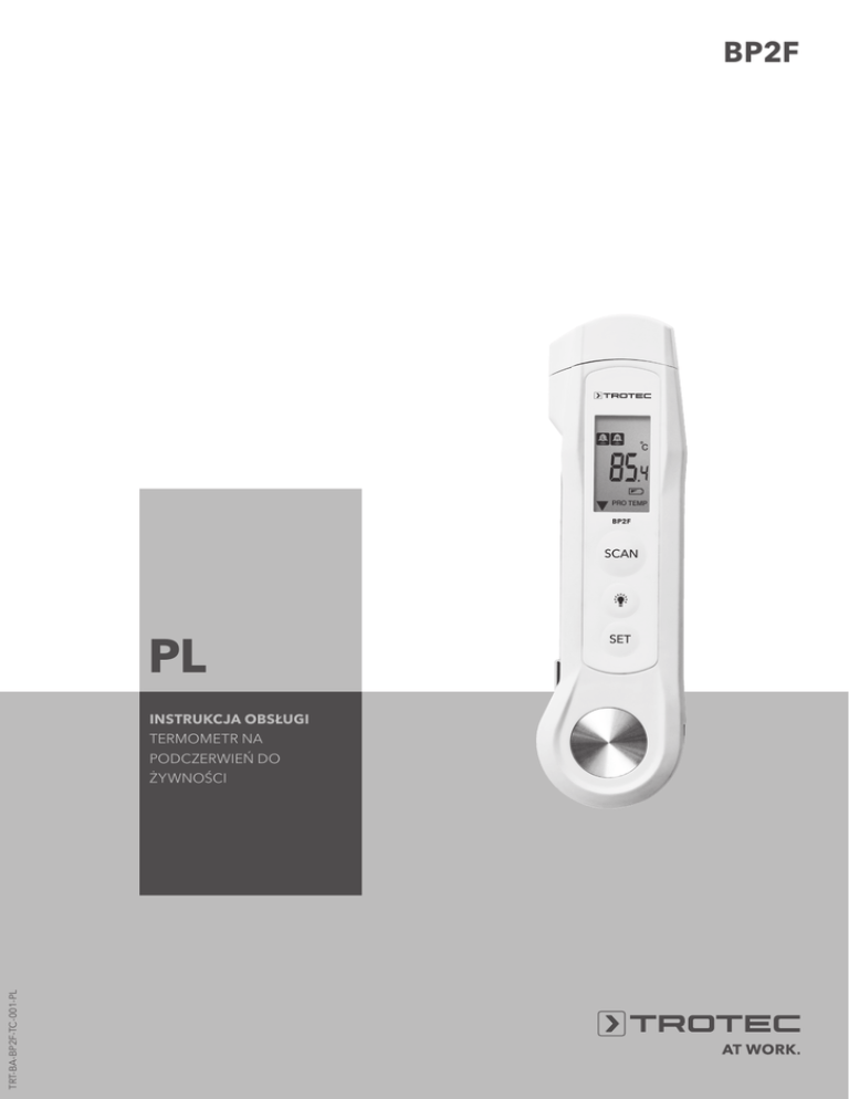 BP2F PL TRT-BA-BP2F-TC-001-PL INSTRUKCJA OBSŁUGI TERMOMETR NA PODCZERWIEŃ DO ŻYWNOŚCI Wskazówka dotycząca odpowiedzialności prawnej Spis treści Wskazówki dotyczące instrukcji obsługi ................................ Bezpieczeństwo .................................................................... Informacje dotyczące urządzenia .......................................... Dane techniczne ................................................................... Transport i składowanie ........................................................ Obsługa ................................................................................ Konserwacja i naprawa......................................................... Utylizacja .............................................................................. Deklaracja zgodności ............................................................ 01 02 02 03 03 03 05 06 06 Wskazówki dotyczące instrukcji obsługi Symbole Niebezpieczeństwo! Wskazuje na zagrożenie odniesienia obrażeń ciała. Ostrożnie! Wskazuje na zagrożenie wystąpienia szkód materialnych. Aktualna wersja tej instrukcji obsługi znajduje się na stronie internetowej Ta publikacja zastępuje wszystkie wcześniejsze wydania. Żadna część niniejszej publikacji nie może być w jakiejkolwiek formie obrabiana, powielana lub rozpowszechniana albo obrabiana elektronicznie, bez uprzedniego uzyskania pisemnej zgody firmy Trotec. Zmiany techniczne zastrzeżone. Wszelkie prawa zastrzeżone. Nazwy handlowe zostały wykorzystane w treści bez gwarancji prawa do dowolnego wykorzystania oraz zgodnie z pisownią stosowaną przez producenta. Wszystkie znaki towarowe są zastrzeżone. Zastrzega się prawo do wprowadzania zmian konstrukcyjnych oraz zmian kształtu/kolorów w ramach procesu ulepszeń produktu. Zakres dostawy może różnić się od zawartości ilustracji. Poniższy dokument został opracowany z zachowaniem należytej staranności. Firma Trotec nie ponosi odpowiedzialności za błędy w treści instrukcji obsługi lub jej niekompletność. Uzyskanie danych pomiarowych, wnioski i wynikające z nich czynności należą do zakresu odpowiedzialności tylko i wyłącznie użytkownika urządzenia. Firma Trotec nie udziela żadnej gwarancji dotyczącej prawidłowości uzyskanych danych lub wyników pomiarowych. Firma Trotec nie ponosi także żadnej odpowiedzialności za błędy lub szkody wynikające z wykorzystania uzyskanych danych pomiarowych. © Trotec BP2F http://download.trotec.com/?sku=3510003017&id=1 1 Instrukcja obsługi – termometr na podczerwień BP2F do żywności PL Bezpieczeństwo Informacje dotyczące urządzenia Dokładnie zapoznaj się z treścią instrukcji obsługi przed rozpoczęciem eksploatacji urządzenia. Przechowuj instrukcję obsługi tak, aby mogła być ona w dowolnej chwili wykorzystana! Opis urządzenia • Nie eksploatuj urządzenia w atmosferze zanieczyszczonej olejem, siarką, chlorem lub solą. • Nie eksploatuj urządzenia w pomieszczeniach, w których panuje zagrożenie wybuchem. • Chroń anemometr przed bezpośrednim, długotrwałym nasłonecznieniem. • Nie zdejmuj znaków bezpieczeństwa, naklejek lub etykiet. Utrzymuj wszystkie znaki bezpieczeństwa, naklejki oraz etykiety w dobrym stanie. • Nie otwieraj urządzenia za pomocą narzędzi. • Zastosuj się do zaleceń dotyczących warunków składowania i zastosowania (patrz rozdział Dane techniczne). Termometr spożywczy na podczerwień BP2F ustala temperaturę powierzchni żywności za pomocą czujnika podczerwieni. Temperatura wnętrza produktu mierzona jest za pomocą czujnika temperatury. Zgodnie z dyrektywą HACCP dla żywności, utrzymanie zakresu temperatury w zakresie poniżej 4 °C i powyżej 60 °C jest ważnym narzędziem zapobiegania powstawania i rozmnażania się szkodliwych dla zdrowia mikroorganizmów. Temperatury pomiędzy 4 °C a 60 °C mogą sprzyjać powstawaniu zarazków. Łatwe monitorowanie zadanego zakresu temperatury możliwe jest dzięki wyposażeniu urządzenia w funkcję alarmu przekroczenia minimalnej lub maksymalnej wartości alarmowej. Widok urządzenia Zastosowanie zgodne z przeznaczeniem 8 Urządzenie służy wyłącznie do pomiarów temperatury z użyciem czujnika podczerwieni lub czujnika temperatury w zakresach pomiarowych zgodnych z danymi technicznymi. W celu zapewnienia prawidłowej eksploatacji urządzenia, stosuj wyłącznie dodatkowe elementy wyposażenia dostarczane przez firmę Trotec lub części zamienne atestowane przez firmę Trotec. 7 1 3 4 5 6 2 Zastosowanie niezgodne z przeznaczeniem Urządzenie nie jest przeznaczone do pomiaru temperatury ciała ludzi lub zwierząt. Firma Trotec nie ponosi odpowiedzialności za szkody powstałe w wyniku zastosowania urządzenia niezgodnie z jego przeznaczeniem. W takim przypadku gwarancja traci ważność. Samodzielne przeróbki urządzenia są zabronione. Kwalifikacje użytkownika Użytkownicy korzystający z urządzenia muszą • gruntownie zaznajomić się z treścią instrukcji obsługi, w szczególności z rozdziałem Bezpieczeństwo. . Inne zagrożenia Niebezpieczeństwo! Zachowaj wystarczającą odległość od źródeł ciepła. Nr Oznaczenie 1 2 3 4 5 6 7 8 Czujnik podczerwieni Kieszeń baterii Wyświetlacz Przycisk Scan (Skanowanie) Przycisk LED Przycisk SET (Ustaw) Czujnik temperatury, rozkładany LED (oświetlenie) Niebezpieczeństwo! Nie pozostawiaj materiału opakowaniowego leżącego w bezładzie. Może stać on się niebezpieczną zabawką dla dzieci. Niebezpieczeństwo! Urządzenia nie są zabawkami i nie mogą być przekazywane dzieciom. PL Instrukcja obsługi – termometr na podczerwień BP2F do żywności 2 Wyświetlacz Transport i składowanie 10 9 Magazynowanie 17 IR TEMP HOLD H °F °C L 11 12 16 13 14 PRO TEMP 15 Nr Oznaczenie 9 10 11 12 13 14 15 16 17 Wskaźnik pomiaru podczerwieni Wskaźnik temperatury podczerwieni Wstrzymanie wskazania wartości pomiarowej Pole jednostki t