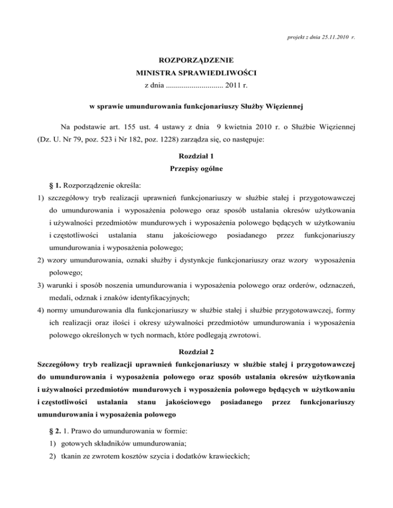 projekt z dnia 25.11.2010 r. ROZPORZĄDZENIE MINISTRA SPRAWIEDLIWOŚCI z dnia ............................. 2011 r. w sprawie umundurowania funkcjonariuszy Służby Więziennej Na podstawie art. 155 ust. 4 ustawy z dnia 9 kwietnia 2010 r. o Służbie Więziennej (Dz. U. Nr 79, poz. 523 i Nr 182, poz. 1228) zarządza się, co następuje: Rozdział 1 Przepisy ogólne § 1. Rozporządzenie określa: 1) szczegółowy tryb realizacji uprawnień funkcjonariuszy w służbie stałej i przygotowawczej do umundurowania i wyposażenia polowego oraz sposób ustalania okresów użytkowania i używalności przedmiotów mundurowych i wyposażenia polowego będących w użytkowaniu i częstotliwości ustalania stanu jakościowego posiadanego przez funkcjonariuszy umundurowania i wyposażenia polowego; 2) wzory umundurowania, oznaki służby i dystynkcje funkcjonariuszy oraz wzory wyposażenia polowego; 3) warunki i sposób noszenia umundurowania i wyposażenia polowego oraz orderów, odznaczeń, medali, odznak i znaków identyfikacyjnych; 4) normy umundurowania dla funkcjonariuszy w służbie stałej i służbie przygotowawczej, formy ich realizacji oraz ilości i okresy używalności przedmiotów umundurowania i wyposażenia polowego określonych w tych normach, które podlegają zwrotowi. Rozdział 2 Szczegółowy tryb realizacji uprawnień funkcjonariuszy w służbie stałej i przygotowawczej do umundurowania i wyposażenia polowego oraz sposób ustalania okresów użytkowania i używalności przedmiotów mundurowych i wyposażenia polowego będących w użytkowaniu i częstotliwości ustalania stanu jakościowego posiadanego umundurowania i wyposażenia polowego § 2. 1. Prawo do umundurowania w formie: 1) gotowych składników umundurowania; 2) tkanin ze zwrotem kosztów szycia i dodatków krawieckich; przez funkcjonariuszy 3) równowartości pieniężnej funkcjonariusz nabywa z dniem pierwszego mianowania na stanowisko służbowe w służbie przygotowawczej, mianowania do służby stałej, nadania wyższego stopnia Służby Więziennej, zwanego dalej „stopniem”, przy zmianie korpusu oraz nadania stopnia majora Służby Więziennej lub generała Służby Więziennej. 2. Funkcjonariusz, któremu nadano wyższy stopień przy zmianie korpusu oraz funkcjonariusz, któremu nadano stopień generała Służby Więziennej, otrzymuje z zaliczeniem okresu używalności od dnia nadania tego stopnia sznur galowy odpowiedni dla danego stopnia, zgodnie z § 16. 3. Funkcjonariusz, któremu nadano wyższy stopień przy zmianie korpusu na oficerski oraz funkcjonariusz, któremu nadano stopień majora Służby Więziennej, otrzymuje z zaliczeniem okresu używalności od dnia nadania tego stopnia czapkę służbową zimową, letnią i wyjściową. 4. Funkcjonariusz, któremu nadano wyższy stopień przy zmianie korpusu na oficerski, otrzymuje z zaliczeniem okresu używalności od dnia nadania tego stopnia pas główny skórzany odpowiedni dla korpusu oficerskiego Służby Więziennej. 5. Funkcjonariusz, z chwilą skierowania do odbycia szkolenia zawodowego, otrzymuje przedmioty umundurowania wynikające ze zmiany korpusu, zgodnie z ust. 2 – 4. 6. Funkcjonariusz, który ze względu na budowę ciała nie może dopasować gotowych składników umundurowania, otrzymuje na odpowiedni składnik umundurowania tkaninę, oznaki służby odpowiednie dla danego przedmiotu mundurowego oraz zwrot kosztów szycia wraz z dodatkami krawieckimi. Normy materiałów na szycie umundurowania określa załącznik nr 1 do rozporządzenia. 7. Zamiast przydziału składników umundurowania, w przypadku, o którym mowa w ust. 1, funkcjonariuszowi można wypłacić, na jego pisemny wniosek, ich równowartość pieniężną liczoną według cen obowiązujących w dniu powstania uprawnienia do umundurowania. § 3. 1. Wyposażenie polowe otrzymuje funkcjonariusz: 1) pełniący służbę w działach ochrony jednostek organizacyjnych Służby Więziennej; 2) wchodzący w skład grupy interwencyjnej; 3) będący uczestnikiem szkolenia wstępnego i zawodowego; 4) wyznaczony do drużyny strzeleckiej lub drużyny przeciwpożarowej oraz przewodnik psa. 2. Funkcjonariusz, inny niż wymieniony w ust. 1, może otrzymać do użytkowania wyposażenie polowe, jeżeli jest to uzasadnione warunkami wykonywania zadań służbowych lub rodzajem szkolenia specjalistycznego. 3. Rodzaje zadań i stanowisk, na których dopuszcza się występowanie w wyposażeniu polowym, określa kierownik jednostki organizacyjnej Służby Więziennej, zwany dalej „kierownikiem jednostki organizacyjnej”. 4. Uprawnienie do wyposażenia polowego realizuje się w formie przydziału gotowych składników. § 4. 1. Funkcjonariusz w służbie przygotowawczej, w przypadku zwolnienia ze służby na podstawie art. 96 ustawy z dnia 9 kwietnia 2010 r. o Służbie Więziennej, zwanej dalej „ustawą”, lub wygaśnięcia stosunku służbowego na podstawie art. 97 ustawy, jest obowiązany zdać podlegające zwrotowi składniki umundurowania, których okres używalności nie upłynął. 2. Składniki umundurowania, które nie posiadają wartości użytkowej nie podlegają zwrotowi. 3. Za składniki umundurowania, które nie zostały zwrócone, a ich okres używalności nie upłynął, funkcjonariusz, o którym mowa w ust. 1, jest obowiązany uiścić ich równowartość pieniężną za czas, jaki pozostał do końca okresu ich używalności, obliczoną według cen obowiązujących w dniu zwolnienia ze służby lub ustania stosunku służbowego. 4. W przypadku realizacji należności mundurowych w formie, o której mowa w § 2 ust. 1 pkt 2, funkcjonariusz, o którym mowa w ust. 1, jest obowiązany uiścić ich równowartość pieniężną za czas, jaki pozostał do końca okresu ich używalności, obliczoną według pełnych kosztów poniesionych na ich wykonanie. § 5. Do oceny wartości użytkowej zwracanych przedmiotów umundurowania i wyposażenia polowego, którym nie minął okres 
