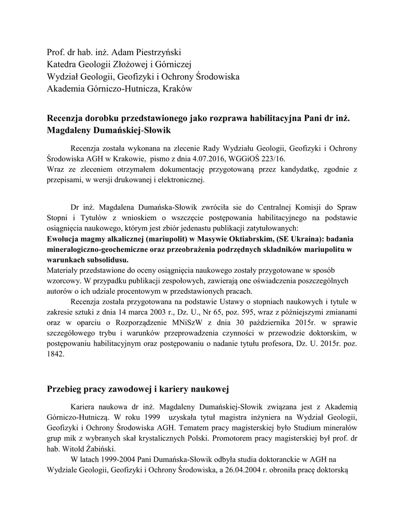 Prof. dr hab. inż. Adam Piestrzyński Katedra Geologii Złożowej i Górniczej Wydział Geologii, Geofizyki i Ochrony Środowiska Akademia Górniczo-Hutnicza, Kraków Recenzja dorobku przedstawionego jako rozprawa habilitacyjna Pani dr inż. Magdaleny Dumańskiej-Słowik Recenzja została wykonana na zlecenie Rady Wydziału Geologii, Geofizyki i Ochrony Środowiska AGH w Krakowie, pismo z dnia 4.07.2016, WGGiOŚ 223/16. Wraz ze zleceniem otrzymałem dokumentację przygotowaną przez kandydatkę, zgodnie z przepisami, w wersji drukowanej i elektronicznej. Dr inż. Magdalena Dumańska-Słowik zwróciła sie do Centralnej Komisji do Spraw Stopni i Tytułów z wnioskiem o wszczęcie postępowania habilitacyjnego na podstawie osiągnięcia naukowego, którym jest zbiór jedenastu publikacji zatytułowanych: Ewolucja magmy alkalicznej (mariupolit) w Masywie Oktiabrskim, (SE Ukraina): badania mineralogiczno-geochemiczne oraz przeobrażenia podrzędnych składników mariupolitu w warunkach subsolidusu. Materiały przedstawione do oceny osiągnięcia naukowego zostały przygotowane w sposób wzorcowy. W przypadku publikacji zespołowych, zawierają one oświadczenia poszczególnych autorów o ich udziale procentowym w przedstawionych pracach. Recenzja została przygotowana na podstawie Ustawy o stopniach naukowych i tytule w zakresie sztuki z dnia 14 marca 2003 r., Dz. U., Nr 65, poz. 595, wraz z późniejszymi zmianami oraz w oparciu o Rozporządzenie MNiSzW z dnia 30 października 2015r. w sprawie szczegółowego trybu i warunków przeprowadzenia czynności w przewodzie doktorskim, w postępowaniu habilitacyjnym oraz postępowaniu o nadanie tytułu profesora, Dz. U. 2015r. poz. 1842. Przebieg pracy zawodowej i kariery naukowej Kariera naukowa dr inż. Magdaleny Dumańskiej-Słowik związana jest z Akademią Górniczo-Hutniczą. W roku 1999 uzyskała tytuł magistra inżyniera na Wydział Geologii, Geofizyki i Ochrony Środowiska AGH. Tematem pracy magisterskiej było Studium minerałów grup mik z wybranych skał krystalicznych Polski. Promotorem pracy magisterskiej był prof. dr hab. Witold Żabiński. W latach 1999-2004 Pani Dumańska-Słowik odbyła studia doktoranckie w AGH na Wydziale Geologii, Geofizyki i Ochrony Środowiska, a 26.04.2004 r. obroniła pracę doktorską na Wydziale Geologii, Geofizyki i Ochrony Środowiska AGH uzyskując tytuł doktora nauk o Ziemi. Tytuł rozprawy brzmiał: "Studium porównawcze mik z pegmatytów Dolnego Śląska". Promotorem rozprawy był prof. dr hab. Witold Żabiński. Od roku 2005 Pani Dumańska-Słowik pracuje jako adiunkt w Akademia GórniczoHutniczej, na Wydziale Geologii, Geofizyki i Ochrony Środowiska, w Katedrze Mineralogii, Petrografii i Geochemii. Ponadto: w roku 2000 Pani Doktor ukończyła Studium Przygotowania Pedagogicznego, w roku 2001 uzyskała Certificate of Advanced English, University of Cambridge, Local Examination Syndicate oraz brała udział w następujących szkoleniach i warsztatach: 27.08 - 12.09.2007 r. - „Badanie, identyfikacja i wycena diamentów oraz kamieni szlachetnych w oparciu o nowe zasady obowiązujące w krajach UE” projekt ZPORR Z/2.14/II/2.1/15/288/06, warsztaty organizowane przez Centralny Ośrodek Kształcenia Gemmologów PTGem w Warszawie - kwalifikacje do badania oceny jakości diamentów jubilerskich, 0.2.09 - 06.09.2013 r.- Corundum. Occurrences, properties, identification, synthetics and imitations as well as treatment of ruby and sapphire. Miejsce warsztatów - German Gemmological Training Centre in Idar Oberstein, Germany, 14-15.11.2014 r. - "Wiedza o bursztynie i innych żywicach kopalnych". Miejsce warsztatów - Muzeum Ziemi PAN oraz PTGem, Warszawa. Dodatkowe szkolenia wskazują na ukierunkowanie się Habilitantki na badania faz minerałów szlachetnych i ozdobnych. Ocena dorobku dydaktycznego Pani Magdalena Dumańska-Słowik jest promotorem 7 prac magisterskich i 15 prac inżynierskich. W przypadku promotorstwa prac magisterskich, nie jest to imponująca liczba. Na uwagę zasługuje jednak fakt, że fragmenty z 5 prac magisterskich i projektów inżynierskich zostały opublikowane w znaczących czasopismach. Działalność zawodowa Habilitantki skupiała się głównie na prowadzeniu licznych zajęć dydaktycznych w postaci ćwiczeń laboratoryjnych i audytoryjnych oraz zajęć terenowych z następujących przedmiotów: Mineralogia, Petrografia, Mineralogia z Petrografią, Gemmologia i Jubilerstwo, Gemmologia, Introduction to Gemmology (jedyny wykład w jęz. angielskim), Gemmologia i zbieractwo minerałów i skał, Kolekcjonerstwo minerałów i skał, Praktyka gemmologiczna - zajęcia terenowe na Dolnym Śląsku oraz wytwarzanie biżuterii z wybranymi kamieniami jubilerskimi na ASP w Łodzi w ramach współpracy dydaktycznej. Pani Doktor brała również udział w przygotowywaniu programów dydaktycznych dla przedmiotów z zakresu mineralogii i gemmologii dla studentów Wydziału Geologii, Geofizyki i Ochrony Środowiska AGH oraz Wydziału Metali Nieżelaznych AGH, samodzielnie i we współautorstwo (z dr hab. Lucyną Natkaniec-Nowak). Ocena dorobku naukowego Ocena dorobku naukowego przed doktoratem Będąc na studiach doktoranckich Pani Doktor opublikowała dwie prace w czasopiśmie Mineralogia Polonica (jedną z udziałem własnym 70% zaś drugą z udziałem 100%) oraz 4 abstrakty w materiałach konferencyjnych zagranicznych (3) i polskich (1). Był to minimalny i zarazem niezbędny dorobek wymagany w postępowaniu związanym z obroną doktoratu. Ocena dorobku naukowego po doktoracie Całkowita liczba publikacji Pani Doktor wynosi 57 pozycji; ich sumaryczny impact factor według listy Journal Citation Reports (JCR), zgodnie z rokiem opublikowania, wynosi 21.74; sumaryczna liczba punktów MNiSW, zgodnie z rokiem opublikowania, to 372, zaś liczba cytowań publikacji według bazy Web of Science wynosi 37. Indeks Hirscha według bazy Web of Science = 3. Wszystkie publikowane prace są pisane we w