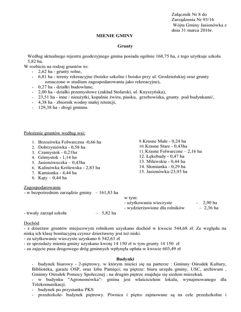 Załącznik Nr 8 do Zarządzenia Nr 93/16 Wójta Gminy Jasionówka z dnia 31 marca 2016r. MIENIE GMINY Grunty Według aktualnego rejestru geodezyjnego gmina posiada ogólnie 168,75 ha, z tego użytkuje szkoła 5,82 ha. W rozbiciu na rodzaj gruntów to: - 2,62 ha - grunty rolne, - 6,81 ha - tereny rekreacyjne (boisko szkolne i boisko przy ul. Grodzieńskiej oraz grunty oznaczone w studium zagospodarowania jako rekreacyjne), - 0,27 ha - działki budowlane, - 2,00 ha - działki przemysłowe (zakład Stolarski, ul. Knyszyńska), - 23,51 ha - inne / nieużytki, kopalnie żwiru, piasku, grzebowiska, grunty pod budynkami/, - 4,38 ha - zbiornik wodny małej retencji, - 129,38 ha - drogi gminne. Położenie gruntów według wsi: 1. 2. 3. 4. 5. 6. 7. 8. Brzozówka Folwarczna -0,66 ha Dobrzyniówka - 0,58 ha Czamystok - 0,21ha Gómystok - 1,14 ha Jasionóweczka – 0,43ha Kalinówka Królewska - 2,83 ha Kamionka - 4,44 ha Kąty – 0,44 ha 9. Krasne Małe - 0,24 ha 10. Krasne Stare - 0,43ha 11. Krasne Folwarczne – 2,16 ha 12. Łękobudy - 0,47 ha 13. Milewskie - 0,44 ha 14. Słomianka - 0,29 ha 15. Jasionówka-23,93 ha Zagospodarowanie - w bezpośrednim zarządzie gminy – 161,83 ha w tym: - użytkowania wieczyste - wydzierżawione dla rolników - trwały zarząd szkoła - 2,90 ha – 2,36 ha – 5,82 ha Dochód - z dzierżaw gruntów miejscowym rolnikom uzyskano dochód w kwocie 544,68 zł. Ze względu na niską ich klasę bonitacyjną czynsz dzierżawny jest też niski. - za użytkowanie wieczyste uzyskano 6 542,63 zł - ze sprzedaży mienia gminy uzyskano kwotę 14 150 zł w tym grunty 14 150 zł - za zajęcie pasa drogowego dróg gminnych wpłynęła opłata w kwocie 603,49 zł Budynki - budynek biurowy - 2-piętrowy, w którym mieści się na parterze : Gminny Ośrodek Kultury, Biblioteka, garaże OSP, oraz Izba Pamięci; na piętrze: biura urzędu gminy, USC, archiwum , Gminny Ośrodek Pomocy Społecznej ; na drugim piętrze znajduje się siedem mieszkań. - w budynku "Agronomówka"- gmina jest właścicielem lokalu, wynajmowanego dla Telekomunikacji. - budynek po przystanku PKS - przedszkole- budynek piętrowy. Piwnica i piętro zajmowane są na cele przedszkolne i edukacyjne; na piętrze znajdują się cztery mieszkania. - budynki szkoły: dwa w Jasionówce oraz w Krasnem Folwarcznem w stanie surowym. W budynku starej szkoły w Jasionówce znajduje się sześć mieszkań; - budynki gospodarcze: jeden przy szkole w Jasionówce - budynek "Harcówka" w Jasionówce, w którym mieszczą się pamiątki z bitwy pod Monte Cassino, ponieważ Szkoła Podstawowa w Jasionówce nosi nazwę" Bohaterów Monte Cassino, - budynek Wiejskiego Domu Kultury w Kalinówce, w którym znajdują się: świetlica wiejska i pomieszczenie na działalność handlową, - budynek świetlicy wiejskiej w Milewskich - częściowo udostępniony dla młodzieży, jeden lokal wynajęty jest na sklep; - budynek świetlicy w Słomiance (nieczynny) Powyższe budynki wymagają ponoszenia kosztów na ich utrzymanie jak: opłaty za energię wodę, ubezpieczenia oraz drobne naprawy. - hydrofornie - jedna w Słomiance, trzy w Jasionówce i jedna w Krasnem Folwarcznem Użytkowana jest tylko hydrofornia w Słomiance i Krasnem Folwarcznem. Dochód Roczny dochód z wynajmu mieszkań i lokali w 2015r. wyniósł 73 380,46zł. Budowle - wodociągi o łącznej długości 86,69 km /bez przyłączy/, które znajdują się we wsiach: l. Słomianka obejmujący wsie; Jasionówka, kol. Jasionówki, Czarnystok, Górnystok, szkołę ,przedszkole, budynki byłego PGR oraz wieś Jasionóweczkę, Słomianka, wieś Kamionka, Kalinówka Królewska Koziniec, Krzywa oraz kol: Kamionki i Słomianki, kol. Kalinówka Królewska, Kąty, kol. Jasionówka 2.Krasne Folwarczne - Krasne Folwarczne, Krasne Stare, Brzozówka Folwarczna, Dobrzyniówka, Kujbiedy, Milewskie, kol Milewskie, Łękobudy i kol.Jasionówki "Pawelce", Krasne Małe - oczyszczalnia ścieków i kanalizacja w Jasionówce o łącznej długości sieci 8,8 km Hydrofonia w Słomiance, wodociągi w całej gminie oraz oczyszczalnia ścieków w Jasionówce są przekazane do eksploatacji Spółce Wodociągi Podlaskie w Białymstoku. Ponadto posiadamy PSZOK w Jasionówce, zamknięte zrekultywowane wysypisko śmieci w Jasionówce oraz 3 nieczynne wysypiska śmieci w: Kalinówce Królewskiej, Krasnem Starym oraz w Czamymstoku. Środki transportowe będące w zarządzie gminy : - samochód osobowy "Skoda Roomster” - trzy samochody strażackie w tym dwa ciężarowe, Lublin, Volkswagen, autobus Iveco - dwa autokary do dowożenia dzieci, - ciągnik rolniczy ZETOR, ciągnik JUMZ, DT oraz sprzęt towarzyszący: przyczepa ciągnikowa, pług do odśnieżania x2, kosiarka ciągnikowa, rębak, siewnik - kosiarka samobieżna. Wymieniony sprzęt wykonuje głownie usługi na potrzeby własne. Wykonujemy też usługi osobom fizycznym Dochód Łączny dochód uzyskany z usług osobom fizycznym sprzętem gminnym wyniósł w 2015r. 4 413,12zł Natomiast dochód z tytułu administrowania siecią wodociągową wyniósł 11 707,32 zł Dochód ze sprzedaży kuchni polowej, dwóch samochodów strażackich, przęseł, płytek i złomu wyniósł 59 846,30 zł