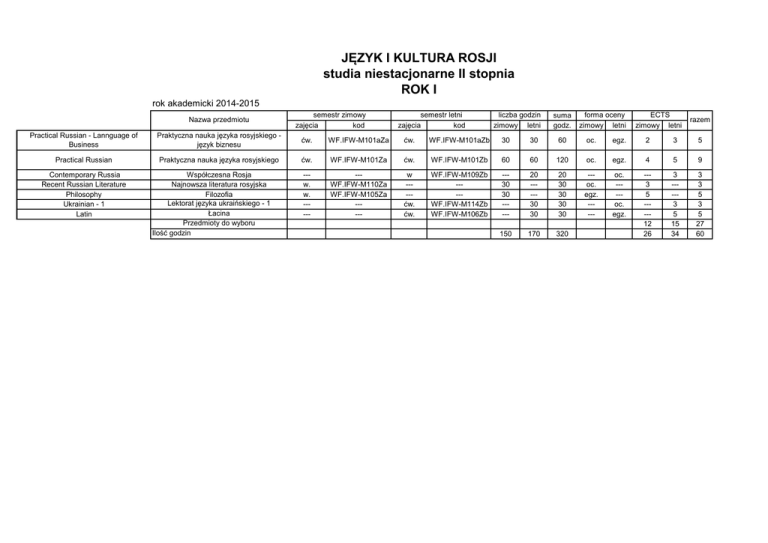 JĘZYK I KULTURA ROSJI studia niestacjonarne II stopnia ROK I rok akademicki 2014-2015 Nazwa przedmiotu semestr zimowy zajęcia kod semestr letni zajęcia kod liczba godzin zimowy letni suma godz. forma oceny zimowy letni ECTS zimowy letni razem Practical Russian - Lannguage of Business Praktyczna nauka języka rosyjskiego język biznesu ćw. WF.IFW-M101aZa ćw. WF.IFW-M101aZb 30 30 60 oc. egz. 2 3 5 Practical Russian Praktyczna nauka języka rosyjskiego ćw. WF.IFW-M101Za ćw. WF.IFW-M101Zb 60 60 120 oc. egz. 4 5 9 --w. w. ----- --WF.IFW-M110Za WF.IFW-M105Za ----- w ----ćw. ćw. WF.IFW-M109Zb ----WF.IFW-M114Zb WF.IFW-M106Zb --30 30 ----- 20 ----30 30 20 30 30 30 30 --oc. egz. ----- oc. ----oc. egz. 150 170 320 --3 5 ----12 26 3 ----3 5 15 34 3 3 5 3 5 27 60 Contemporary Russia Recent Russian Literature Philosophy Ukrainian - 1 Latin Współczesna Rosja Najnowsza literatura rosyjska Filozofia Lektorat języka ukraińskiego - 1 Łacina Przedmioty do wyboru Ilość godzin JĘZYK I KULTURA ROSJI studia niestacjonarne II stopnia ROK II rok akademicki 2014-2015 Nazwa przedmiotu Praktyczna nauka języka rosyjskiego 2 Practical Russian - Lannguage of Praktyczna nauka języka rosyjskiego Business język biznesu Organisation and Stylistics of Academic Organizacja i stylistyka tekstu Texts naukowego Lektorat języka ukraińskiego - 2 Ukrainian - 2 Practical Russian - 2 Protection of Intellectual Property Rights Ochrona własności intelektualnej Przedmioty do wyboru Ilość godzin semestr zimowy zajęcia kod semestr letni zajęcia kod liczba godzin zimowy letni forma oceny suma godz. zimowy letni ECTS zimowy letni razem ćw. WF.IFW-M201Za ćw. WF.IFW-M201Zb 60 60 120 oc. egz. 6 8 14 ćw. WF.IFW-M202Za ćw. WF.IFW-M202Zb 45 45 90 oc. egz. 4 6 10 w. WF.IFW-M203Za --- --- 30 --- 30 oc. --- 3 --- 3 ćw. WF.IFW-M206aZa --- --- 30 --- 30 egz. 4 0 4 w. WF.IFW 15 --- 15 zal. 1 --- 1 180 105 285 12 30 16 30 28 60 --- JĘZYK I KULTURA ROSJI studia niestacjonarne II stopnia Przedmioty do wyboru rok akademicki 2014-2015 Nazwa przedmiotu Comparative Grammar of the Slavonic Languages Theory of Literature and Methodology of Literary Research Gramatyka porównawcza języków słowiańskich Teoria literatury z metodologią badań literackich Seminarium magisterskie I językoznawcze Seminarium magisterskie I literaturoznawcze semestr zimowy zajęcia kod semestr letni zajęcia kod liczba godzin zimowy letni forma oceny suma godz. zimowy letni ECTS zimowy letni --- --- w. WF.IFW-M112Zb --- 30 30 --- oc. --- 7 --- --- w. WF.IFW-M113Zb --- 30 30 --- oc. --- 7 sem. WF.IFW-M119Za sem. WF.IFW-M119Zb 30 30 60 zal. zal. 8 8 sem. WF.IFW-M119aZa sem. WF.IFW-M119aZb 30 30 60 zal. zal. 8 8 The Russian 19th-Century Psychological Rosyjska powieść psychologiczna XIX Novel (Lermontov, Dostoyevsky, Tolstoy) wieku (Lermontow-Dostojewski-Tołstoj) w. WF.IFW-M211Za --- --- 30 --- 30 oc. --- 4 --- Słowotwórstwo współczesnego języka rosyjskiego w. WF.IFW-M212Za --- --- 30 --- 30 oc. --- 4 --- Magister Seminar I - linguistics Magister Seminar I - literary studies Word Formation in Modern Russian