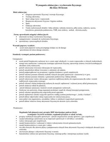 Wymagania edukacyjne z wychowania fizycznego dla klasy III liceum Bloki edukacyjne: Diagnoza sprawności fizycznej i rozwoju fizycznego. Trening zdrowotny. Sport całego życia i wypoczynek. Bezpieczna aktywności fizyczna i higiena osobista. Sport. Edukacja zdrowotna. Tytuły realizowanych działów: lekka atletyka i atletyka terenowa, piłka nożna, siatkowa, ręczna, koszykowa, gimnastyka podstawowa, TMR, tenis stołowy, unihok, siłownia,szachy. Formy sprawdzania osiągnięć edukacyjnych: aktywność na lekcji wychowania fizycznego, zaangażowanie i stosunek do wychowania fizycznego, sprawdziany z poszczególnych działów. Warunki poprawy wyników: uczeń może poprawić ocenę przystępując kolejny raz do danego sprawdzianu do końca danego semestru . Standardy wymagań, poziom podstawowy: Umiejętności: uczeń potrafi bezpiecznie zachować się w czasie zajęć szkolnych i w czasie wypoczynku w różnych środowiskach, stosuje testy analityczne i syntetyczne oceniające sprawność fizyczną, opracowuje zestawy ćwiczeń kształtujących określone cechy motoryczne, potrafi wykorzystać ćwiczenia rekreacyjne do wypoczynku, potrafi samodzielnie dobrać ćwiczenia w zależności od zadania, potrafi podporządkować się przepisom i regułom działania w grach zespołowych, potrafi wykonać poznane elementy techniki różnych dyscyplin sportowych i zastosować je w grze, potrafi wykonać poznane elementy z gimnastyki podstawowej i lekkiej atletyki, potrafi wykorzystać walory rekreacyjne i sportowe najbliższej okolicy do organizowania dla siebie i swoich najbliższych wypoczynku czynnego, potrafi wykonać własną kompozycję ruchową do muzyki zaplanować i wykonać prosty układ gimnastyczny potrafi zatańczyć układ do poloneza, potrafi dokonać samooceny i kontroli swoich umiejętności ruchowych , Zachować się asertywnie, drogą negocjacji przekonać zespół do własnej koncepcji postępowania, potrafi wykonać specjalistyczną rozgrzewkę przed zajęciami, potrafi zaplanować szkolne rozgrywki sportowe według systemu pucharowego i ,,każdy z każdym”, potrafi dobrać odpowiedni rodzaj wypoczynku do wykonywanej pracy, umie pełnić rolę organizatora, zawodnika i kibica w szkolnych rozgrywkach sportowych, potrafi dobrać właściwe formy aktywności fizycznej do okresów życia człowieka. Wiadomości: Regulamin Sali gimnastycznej ,przepisy BHP obowiązujące podczas lekcji, wymagania i kryteria oceniania ,regulamin przejścia ze szkoły na halę . przepisy wybranych dyscyplin sportowych i potrafi zorganizować zawody sportowe z gier zespołowych zasady kulturalnego zachowania się na imprezach sportowych w roli kibica i zawodnika, walory rekreacyjne gier zespołowych, zasady bezpieczeństwa i asekuracji w trakcie wykonywania ćwiczeń gimnastycznych, zasady bezpieczeństwa w czasie gier i zabaw wie jakie korzyści dla zdrowia płyną z podejmowania różnych form aktywności fizycznej w kolejnych okresach życia człowieka zna korzyści płynące z aktywności fizycznej w terenie. Samodzielnie wybiera test sprawności fizycznej, wykonuje próby i interpretuje uzyskane wyniki Zna charakterystykę poszczególnych dyscyplin LA Zna walory rekreacyjne i zdrowotne LA Wie jak dobrać ćwiczenia kształtujące określone umiejętności ruchowe Zna zdrowotne walory ćwiczeń gimnastycznych Wie jak dobrać ćwiczenia w zależności od potrzeb i przeznaczenia Zna rodzaje aerobiku i przestrzega zasad kulturalnego zachowania się w czasie zabaw tanecznych. Postawa: obiektywnie ocenia swoją aktywność fizyczną oraz możliwości i umiejętności ruchowe dokonuje samooceny osiąganych wyników i określa możliwości ich poprawy współpracuje w grupie w celu osiągnięcia zamierzonego wyniku, pomaga słabszym właściwie zachowuje się na boisku i trybunach zarówno w sytuacji zwycięstwa i porażki – czysta gra, kulturalny doping, systematycznie dobrowolnie i świadomie podejmuje wysiłek fizyczny, właściwie zachowuje się w czasie pełnienia roli zawodnika i kibica, stosuje zasadę fair-play, dostrzega grożące niebezpieczeństwo ,zapewnia bezpieczeństwo sobie i innym, podejmuje właściwe decyzje w sytuacjach zagrożenia zdrowia i życia, stosuje samokontrolę i samoocenę w czasie ćwiczeń, stosuje zasady czystej gry i niewykorzystywania przewagi losowej, wykazuje inicjatywę w organizowaniu imprez sportowo- rekreacyjnych, uczestniczy w pozalekcyjnych działaniach rekreacyjnych organizowanych przez szkołę. Standardy wymagań ,poziom rozszerzony: Umiejętności: potrafi swoim przykładem zachęcić innych do aktywności fizycznej, wykorzystuje różnorodne gry z elementami techniki koszykówki i piłki ręcznej w czasie ćwiczeń kształtujących i doskonalących, potrafi zaplanować zestaw ćwiczeń relaksacyjnych, potrafi samodzielnie zorganizować i przygotować turniej sportowy dla swoich rówieśników z gier zespołowych, potrafi dobrać ruch i aktywność fizyczną w zależności zainteresowań i możliwości, potrafi używając argumentów i własnego przykładu, przekonać innych do aktywności fizycznej. Wiadomości: zna różnorodne testy sprawności, potrafi zinterpretować uzyskane wyniki, zna znaczenie zdrowotne i rekreacyjne gier zespołowych, umie wykorzystać predyspozycje w rywalizacji sportowej, wie jak opracować i prowadzić zajęcia ruchowe z muzyką dla rówieśników, wie jakie mogą być negatywne skutki niewłaściwe stosowanej aktywności fizycznej. Postawa: dokonuje rzetelnej i krytycznej samooceny własnej sprawności, przygotowuje indywidualny plan rozwoju, bierze czynny udział w rywalizacji sportowej z wykorzystaniem opanowanych elementów techniki biegów, skoków, rzutów, zachęca innych własnym przykładem do aktywności fizycznej, samodzielnie wybiera określony rodzaj aktywności w zależności od zainteresowań i potrzeb, właściwie ocenia różnorodne zjawiska w sporcie.