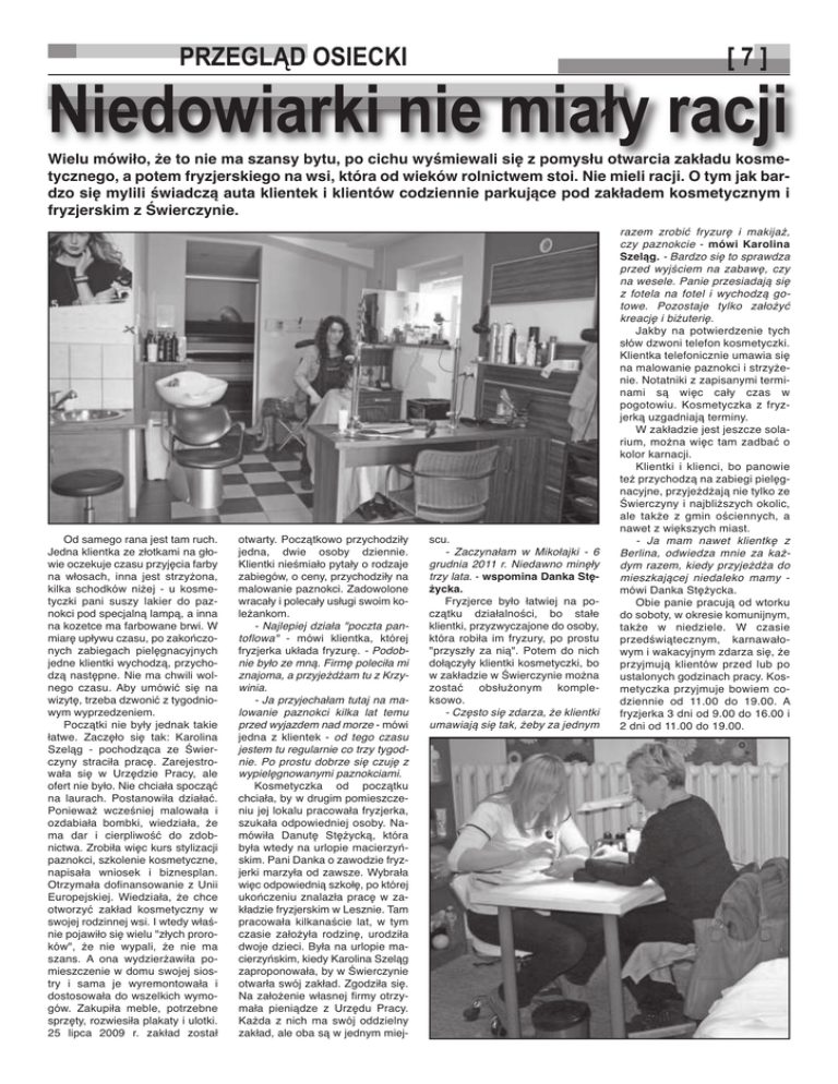 PRZEGLĄD OSIECKI [7] Niedowiarki nie miały racji Wielu mówiło, że to nie ma szansy bytu, po cichu wyśmiewali się z pomysłu otwarcia zakładu kosmetycznego, a potem fryzjerskiego na wsi, która od wieków rolnictwem stoi. Nie mieli racji. O tym jak bardzo się mylili świadczą auta klientek i klientów codziennie parkujące pod zakładem kosmetycznym i fryzjerskim z Świerczynie. Od samego rana jest tam ruch. Jedna klientka ze złotkami na głowie oczekuje czasu przyjęcia farby na włosach, inna jest strzyżona, kilka schodków niżej - u kosmetyczki pani suszy lakier do paznokci pod specjalną lampą, a inna na kozetce ma farbowane brwi. W miarę upływu czasu, po zakończonych zabiegach pielęgnacyjnych jedne klientki wychodzą, przychodzą następne. Nie ma chwili wolnego czasu. Aby umówić się na wizytę, trzeba dzwonić z tygodniowym wyprzedzeniem. Początki nie były jednak takie łatwe. Zaczęło się tak: Karolina Szeląg - pochodząca ze Świerczyny straciła pracę. Zarejestrowała się w Urzędzie Pracy, ale ofert nie było. Nie chciała spocząć na laurach. Postanowiła działać. Ponieważ wcześniej malowała i ozdabiała bombki, wiedziała, że ma dar i cierpliwość do zdobnictwa. Zrobiła więc kurs stylizacji paznokci, szkolenie kosmetyczne, napisała wniosek i biznesplan. Otrzymała dofinansowanie z Unii Europejskiej. Wiedziała, że chce otworzyć zakład kosmetyczny w swojej rodzinnej wsi. I wtedy właśnie pojawiło się wielu "złych proroków", że nie wypali, że nie ma szans. A ona wydzierżawiła pomieszczenie w domu swojej siostry i sama je wyremontowała i dostosowała do wszelkich wymogów. Zakupiła meble, potrzebne sprzęty, rozwiesiła plakaty i ulotki. 25 lipca 2009 r. zakład został otwarty. Początkowo przychodziły jedna, dwie osoby dziennie. Klientki nieśmiało pytały o rodzaje zabiegów, o ceny, przychodziły na malowanie paznokci. Zadowolone wracały i polecały usługi swoim koleżankom. - Najlepiej działa "poczta pantoflowa" - mówi klientka, której fryzjerka układa fryzurę. - Podobnie było ze mną. Firmę poleciła mi znajoma, a przyjeżdżam tu z Krzywinia. - Ja przyjechałam tutaj na malowanie paznokci kilka lat temu przed wyjazdem nad morze - mówi jedna z klientek - od tego czasu jestem tu regularnie co trzy tygodnie. Po prostu dobrze się czuję z wypielęgnowanymi paznokciami. Kosmetyczka od początku chciała, by w drugim pomieszczeniu jej lokalu pracowała fryzjerka, szukała odpowiedniej osoby. Namówiła Danutę Stężycką, która była wtedy na urlopie macierzyńskim. Pani Danka o zawodzie fryzjerki marzyła od zawsze. Wybrała więc odpowiednią szkołę, po której ukończeniu znalazła pracę w zakładzie fryzjerskim w Lesznie. Tam pracowała kilkanaście lat, w tym czasie założyła rodzinę, urodziła dwoje dzieci. Była na urlopie macierzyńskim, kiedy Karolina Szeląg zaproponowała, by w Świerczynie otwarła swój zakład. Zgodziła się. Na założenie własnej firmy otrzymała pieniądze z Urzędu Pracy. Każda z nich ma swój oddzielny zakład, ale oba są w jednym miej- scu. - Zaczynałam w Mikołajki - 6 grudnia 2011 r. Niedawno minęły trzy lata. - wspomina Danka Stężycka. Fryzjerce było łatwiej na początku działalności, bo stałe klientki, przyzwyczajone do osoby, która robiła im fryzury, po prostu "przyszły za nią". Potem do nich dołączyły klientki kosmetyczki, bo w zakładzie w Świerczynie można zostać obsłużonym kompleksowo. - Często się zdarza, że klientki umawiają się tak, żeby za jednym razem zrobić fryzurę i makijaż, czy paznokcie - mówi Karolina Szeląg. - Bardzo się to sprawdza przed wyjściem na zabawę, czy na wesele. Panie przesiadają się z fotela na fotel i wychodzą gotowe. Pozostaje tylko założyć kreację i biżuterię. Jakby na potwierdzenie tych słów dzwoni telefon kosmetyczki. Klientka telefonicznie umawia się na malowanie paznokci i strzyżenie. Notatniki z zapisanymi terminami są więc cały czas w pogotowiu. Kosmetyczka z fryzjerką uzgadniają terminy. W zakładzie jest jeszcze solarium, można więc tam zadbać o kolor karnacji. Klientki i klienci, bo panowie też przychodzą na zabiegi pielęgnacyjne, przyjeżdżają nie tylko ze Świerczyny i najbliższych okolic, ale także z gmin ościennych, a nawet z większych miast. - Ja mam nawet klientkę z Berlina, odwiedza mnie za każdym razem, kiedy przyjeżdża do mieszkającej niedaleko mamy mówi Danka Stężycka. Obie panie pracują od wtorku do soboty, w okresie komunijnym, także w niedziele. W czasie przedświątecznym, karnawałowym i wakacyjnym zdarza się, że przyjmują klientów przed lub po ustalonych godzinach pracy. Kosmetyczka przyjmuje bowiem codziennie od 11.00 do 19.00. A fryzjerka 3 dni od 9.00 do 16.00 i 2 dni od 11.00 do 19.00.