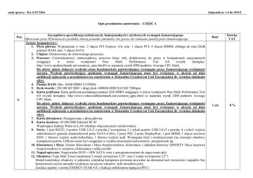 znak sprawy: RA-Z-07/2016 Załącznik nr 1.4 do SIWZ Opis przedmiotu zamówienia – CZĘŚĆ 4 Poz. A Szczegółowa specyfikacja technicznych, funkcjonalnych i użytkowych wymagań Zamawiającego Oferowane przez Wykonawców produkty muszą posiadać parametry nie gorsze niż wskazane poniżej przez Zamawiającego Zestaw komputerowy: 1. Płyta główna: Wyposażona w min. 2 złącze PCI Express x16, min. 1 złącze PCI, 4 złącza DIMM, obsługa do min.32GB pamięci RAM, min. 3 złącza SATA. 2. Chipset: Dostosowany do oferowanego procesora 3. Procesor: Czterordzeniowy ośmiowątkowy procesor klasy x86, dedykowany do pracy w komputerach stacjonarnych osiągający w teście wydajności Pass Mark Performance Test 8.0 (wynik dostępny: http://www.cpubenchmark.net/common_cpus.html#) co najmniej wynik 9900 punktów Average CPU Mark. Do oferty należy dołączyć wydruki stron benchmarków potwierdzające wymagane przez Zamawiającego wydajności sprzętu. Wydruk potwierdzający spełnianie wymagań Zamawiającego musi być wykonany w okresie od dnia publikacji ogłoszenia o przedmiotowym zamówieniu w Dzienniku Urzędowym Unii Europejskiej do terminu składania ofert. 4. Pamięć RAM: Min. 16GB DDR4 2133MHz 5. Dysk twardy: 256 GB M2 SSD + drugi dysk 1000Gb HDD SATAII 7200rpm 6. Karta graficzna: Karta graficzna posiadająca pamięć 2Gb DDR3 osiągająca w teście wydajności Pass Mark Performance Test 8.0 (wynik dostępny: http://www.videocardbenchmark.net/common_gpus.html co najmniej wynik 2200 punktów Average CPU Mark. Do oferty należy dołączyć wydruki stron benchmarków potwierdzające wymagane przez Zamawiającego wydajności sprzętu. Wydruk potwierdzający spełnianie wymagań Zamawiającego musi być wykonany w okresie od dnia publikacji ogłoszenia o przedmiotowym zamówieniu w Dzienniku Urzędowym Unii Europejskiej do terminu składania ofert. 7. Karta dźwiękowa: Zintegrowana z płytą główną 8. Karta sieciowa: 10/100/1000 Ethernet RJ 45 Wspierająca funkcję Wake on LAN (funkcja włączana przez użytkownika) 9. Porty: 1 port RS232, 6 portów USB 2.0 (2 z przodu,2 wewnętrzne 2 z tyłu)6 portów USB 3.0 (2 z przodu, 4 z tyłu)1 wejście mikrofonowe1 gniazdo słuchawkowe4 porty SATA 6 Gb/s, 2 porty PS2, 2 porty DisplayPort, 1 port HDMI, 1 złącze sieciowe RJ45, 1 liniowe wejście audio/mikrofonu, 1 liniowe wyjście audi. Wymagana ilość i rozmieszczenie (na zewnątrz obudowy komputera) portów USB nie może być osiągnięta w wyniku stosowania konwerterów, przejściówek itp. 10. Klawiatura i Mysz: Zestaw Klawiatura i Mysz bezprzewodowa. Klawiatura z układem klawiszy QWERTY Mysz laserowa bezprzewodowa w zestawie z klawiaturą z rolką (scroll) 11. Napęd optyczny: Nagrywarka DVD +/-RW SATA wraz z oprogramowaniem do nagrywania płyt 12. Obudowa: Typu Mini Tower (minimum 2 wnęki zewnętrzne 5,25” oraz 2 wnęki wewnętrzne 3,5”) Moduł konstrukcji obudowy w jednostce centralnej komputera powinien pozwalać na demontaż kart rozszerzeń i napędów bez konieczności użycia narzędzi (wyklucza się użycia wkrętów, śrub motylkowych); Zasilacz zgodny z norma ENERGY STAR 4.0, z funkcja stabilizatora napięcia (PFC) Ilość Stawka VAT 1 szt. 0% znak sprawy: RA-Z-07/2016 B C 13. BIOS: Funkcja blokowania wejścia do BIOS oraz blokowania startu systemu operacyjnego, zgodny ze specyfikacją Plug & Play. Funkcja blokowania/odblokowania BOOT-owania stacji roboczej z dysków twardych, napędów optycznych i zewnętrznych urządzeń. Możliwość wyłączania portów USB. 14. Poziom hałasu: Poziom emitowanego hałasu, mierzony wg normy ISO 7779 i wykazany według normy ISO 9296 w trybie jałowym (IDLE) nie może przekroczyć poziomu 30 dB. 15. Wsparcie techniczne producenta: Możliwość sprawdzenia konfiguracji sprzętowej komputera oraz warunków gwarancji po podaniu numeru seryjnego lub numeru modelu bezpośrednio u producenta. Dostęp do najnowszych sterowników i uaktualnień na stronie producenta zestawu. 16. Kompatybilność: W celu uniknięcia błędów kompatybilności Zamawiający wymaga, aby wszystkie elementy zestawu oraz podzespoły montowane przez producenta były przez niego certyfikowane. Wykonawca nie może samodzielnie dokonywać modyfikacji producenta sprzętu. 17. System operacyjny: Dołączone nośniki z oprogramowaniem i sterownikami sprzętu, lub preinstalowany z dysku twardego komputera Monitor 24”: 1. Typ ekranu: Ekran ciekłokrystaliczny z aktywną matrycą TFT 24” WUXGA IPS 2. Format: 16:10 panoramiczny 3. Jasność: 300cd/m2 4. Kontrast: Minimum 1000:1 lub 2 000 000:1 dynamiczny 5. Kąty widzenia (pion/poziom): Minimum 178/178 stopni 6. Czas reakcji matrycy: Max 8 ms 7. Natywna rozdzielczość: Minimum 1920x1200 8. Bezpieczeństwo: Monitor musi być wyposażony w tzw. Kensington Slot 9. Funkcje: Pivot, Tilt, regulacja wysokości 10. Złącze: 1 x złącze VGA lub złącze DVI z HDCP, 1 x złącze Display Port, 1x złącze USB upstream, 4xUSB downstream 11. Certyfikaty: TCO 03 lub wyższy, ENERGY STAR 4.0 lub wyższy Drukarka Laserowa kolorowa; 1. Rodzaj: Drukarka laserowa kolorowa 2. Dodatkowe moduły: Automatyczny DUPLEX 3. Szybkość druku mono: 25 str./min 4. Szybkość druku kolor: 25 str./min 5. Rozdzielczość: Min 600 x 600 dpi 6. Interfejs: 1 x LAN RJ 45 Karta sieciowa Ethernet 10/100/1000 Base T, 1 x USB 7. Języki druku: PCL 6 , PCL 5 , PostScript , PDF 8. Pojemność podajnika: Standardowy podajnik na min 50 arkuszy A4 9. Oprogramowanie: Standardowe zawierające sterowniki i oprogramowanie producenta umożliwiające odczyt stanu materiałów eksploatacyjnych 10. Standardowy przewód zasilający, przewód USB Załącznik nr 1.4 do SIWZ 1 szt. 0% 1 szt. 0% znak sprawy: RA-Z-07/2016 D Ultrabook: 1. Zastosowanie: Komputer przenośny typu ultrabook wykorzystywany dla potrzeb aplikacji biurowych, aplikacji edukacyjnych, aplikacji obliczeniowych, dostępu do internetu oraz poczty elektronicznej, jako lokalna baza danych, stacja programisty