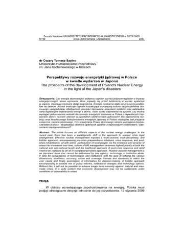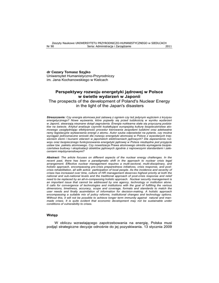 Zeszyty Naukowe UNIWERSYTETU PRZYRODNICZO-HUMANISTYCZNEGO w SIEDLCACH Nr 90 Seria: Administracja i Zarządzanie 2011 dr Cezary Tomasz Szyjko Uniwersytet Humanistyczno-Przyrodniczy im. Jana Kochanowskiego w Kielcach Perspektywy rozwoju energetyki jądrowej w Polsce w Ğwietle wydarzeĔ w Japonii The prospects of the development of Poland's Nuclear Energy in the light of the Japan's disasters Streszczenie: Czy energia atomowa jest zabawą z ogniem czy teĪ jedynym wyjĞciem z kryzysu energetycznego? Nowe wyzwania, które pojawiáy siĊ przed ludzkoĞcią w wyniku wydarzeĔ w Japonii, stwarzają nieznane dotąd zagroĪenia. Energia nuklearna staáa siĊ przyczyną podziaáów na Ğwiecie. Artykuá analizuje czynniki ksztaátujące europejską kulturĊ bezpieczeĔstwa atomowego uwzglĊdniając efektywnoĞü procedur kierowania zespoáami ludzkimi oraz adekwatne ramy legislacyjne wytwarzania energii z atomu. Autor szuka odpowiedzi na pytanie, czy moĪna wyciągaü jednoznaczne wnioski dla rozwoju energetyki atomowej w Polsce z wywoáanych trzĊsieniem ziemi i tsunami zdarzeĔ w japoĔskich elektrowniach jądrowych? Dla zapewnienia rozwoju oraz bezpiecznego funkcjonowania energetyki jądrowej w Polsce niezbĊdne jest przyjĊcie ustaw tzw. pakietu atomowego. Czy nowelizacja Prawa atomowego okreĞla wymagania bezpieczeĔstwa budowy i eksploatacji obiektów jądrowych zgodnie z najnowszymi standardami i zaleceniami miĊdzynarodowymi? Abstract: The article focuses on different aspects of the nuclear energy challenges. In the recent past, there has been a paradigmatic shift in the approach to nuclear crisis legal arrangement. Effective nuclear management requires a multi-sectoral, multi-disciplinary, and holistic approach, encompassing pre-crisis preparedness initiatives, crisis response, and postcrisis rehabilitation, all with active participation of local people. As the incidence and severity of crises has increased over time, culture of HR management deserves highest priority at both the national and sub-national levels and the traditional approach of post-crisis response and relief need to be replaced by an all-in-compassing holistic approach. Nuclear security management is an important issue that cannot be addressed by one agency, technology or institution alone. It calls for convergence of technologies and institutions with the goal of fulfilling the various dimensions, timeliness, accuracy, scope and coverage, formats and standards to match the user needs and finally assimilation of information for decision-making. A holistic approach encompassing a suitable mix of policy reforms, institutional changes and technology options. Without this, it will not be possible to achieve longer term immunity against natural and manmade crises. It is quite evident that economic development may not be sustainable under conditions of vulnerability to crises. WstĊp W obliczu wzrastającego zapotrzebowania na energiĊ, Polska musi podjąü strategiczne decyzje odnoĞnie do jej pozyskiwania. 13 stycznia 2009 150 C.T. Szyjko roku Rada Ministrów przyjĊáa specjalną uchwaáĊ o rozpoczĊciu prac nad Programem Polskiej Energetyki Jądrowej oraz o powoáaniu Peánomocnika Rządu ds. Polskiej Energetyki Jądrowej. Celem programu jest uruchomienie pierwszej elektrowni jądrowej juĪ w roku 2020. Istnieje jednak jeszcze wiele problemów, które muszą zostaü jak najszybciej rozwiązane. Jednym z nich jest budowa bazy intelektualnej dla edukacji, szkolenia i treningu personelu instytucji nadzorujących i przyszáych instalacji jądrowych. 22 lutego 2011 roku Rada Ministrów przyjĊáa przygotowany przez Rządowe Centrum Legislacji we wspóápracy z Ministerstwem Gospodarki i PaĔstwową Agencją Atomistyki projekt ustawy o zmianie ustawy Prawo atomowe oraz o zmianie niektórych innych ustaw. Rząd zdecydowaá, Īe na obecnym etapie wsparcie merytoryczne i organizacyjne rozwoju energetyki jądrowej zapewniaü bĊdzie Ministerstwo Gospodarki, a nie Agencja Energetyki Jądrowej, której utworzenie zakáadaá projekt Programu Polskiej Energetyki Jądrowej. Celem nowelizacji Prawa atomowego jest okreĞlenie wymagaĔ bezpieczeĔstwa budowy i eksploatacji obiektów jądrowych na najwyĪszym osiągalnym poziomie, zgodnie z wymaganiami i zaleceniami miĊdzynarodowymi. Energetyka jądrowa jest sektorem przemysáu o niespotykanych nigdzie standardach bezpieczeĔstwa i jakoĞci i dlatego naleĪy ją postrzegaü przez pryzmat postĊpu technicznego, naukowego, cywilizacyjnego oraz wzrostu zatrudnienia - zwáaszcza przyrostu wysoko páatnych stanowisk specjalistycznych. W pierwszej poáowie 2011 r. na Ğwiecie pracują 442 jądrowe bloki energetyczne o áącznej zainstalowanej mocy netto 375,001 GWe. Kolejnych 5 reaktorów znajduje siĊ w stanie dáugoterminowego wyáączenia. W budowie znajduje siĊ 65 bloków jądrowych1. Energia atomowa, szczególnie w Europie, jest obecnie bardziej niĪ kiedykolwiek kontrowersyjna. Jest to zaskakujące, jeĞli uwzglĊdni siĊ statystyki: w 2004 roku okoáo 440 elektrowni atomowych wytwarzaáo w 30 krajach 16% Ğwiatowego zapotrzebowania na prąd. Z tego w Stanach Zjednoczonych znajdowaáy siĊ 104 elektrownie, a we Francji prawie 60. Przed rozszerzeniem Unii Europejskiej aĪ 30% dostaw prądu pochodziáo z energii nuklearnej. Mimo Īe Komisja Europejska dalej angaĪuje siĊ we wspieranie badaĔ nad kulturą bezpieczeĔstwa nuklearnego, to paĔstwa czáonkowskie są podzielone wzglĊdem wykorzystania energii jądrowej2. 1 Japan Atomic Industrial Forum, www.jaif.or.jp (dostĊp z dnia 4.04.2011 r.). I. Khripunov (ed.), Nuclear Security Culture: From National Best Practices to International Standards, Volume 28, NATO Science for Peace and Security Series: Human and Societal Dynamics, IOS Press 2007. 2 Seria: Administracja i Zarządzanie (17)2011 ZN nr 90 Perspektywy rozwoju energetyki jądrowej w Polsce w Ğwietle wydarzeĔ w Japonii 151 Rys. 1. Liczba pracujących reaktorów energetycznych Fig. 
