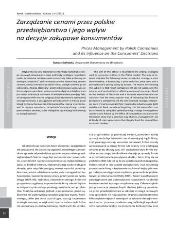 Rynek - Społeczeństwo - Kultura | nr 2/2013 Zarządzanie cenami przez polskie przedsiębiorstwa i jego wpływ na decyzje zakupowe konsumentów Prices Management by Polish Companies and its Influence on the Consumers’ Decisions Artykuł ma na celu przybliżenie informacji na temat strategii cenowych stosowanych przez podmioty działające na polskim rynku. W obszarze zainteresowań znalazły się takie problemy jak strategia „koszt plus”, dyskryminacja cenowa, downsizing, zmowy cenowe, wojny cenowe oraz odbiór danej polityki cenowej przez nabywców. Analiza literatury i praktyki biznesowej wskazuje, że dominującym sposobem polepszania kondycji przedsiębiorstwa jest wciąż orientacja kosztowa. Przedsiębiorstwa pomijają fakt, że identyczny efekt można osiągnąć dzięki stosowaniu optymalnej strategii cenowej. Z postępowań prowadzonych w Polsce przez Urząd Ochrony Konkurencji i Konsumentów można wywnioskować, że częstym sposobem „zarządzania” ceną są różnego rodzaju porozumienia cenowe, które nielegalnie ograniczają konkurencję na danych rynkach. Wstęp Jak dotychczas twórcom teorii ekonomii i specjalistom od zarządzania nie udało się uzgodnić jednolitego stanowiska w sprawie odpowiedzi na pytanie: co jest celem przedsiębiorstwa? Cele te mogą być autonomiczne i powszechne, a wśród nich najczęściej wymienia się: maksymalizację zysku w krótkim okresie, maksymalizację zysku w długim okresie, zysk satysfakcjonujący, wzrost wartości przedsiębiorstwa, wzrost udziałów w rynku, cele managerskie i behawioralne, tworzenie miejsc pracy, przetrwanie na rynku (Noga 2009: 64). Jednakże, niezależnie od tego, który cel przyjmiemy za główny, to powodzenie firmy zależeć będzie w dużym stopniu od optymalnego ustalania cen produktów. Praktyka wskazuje jednak, iż po pierwsze, przedsiębiorstwa nie wykorzystują narzędzia poprawy wyniku finansowego, jakim jest cena, a po drugie, stosują najprostsze strategie cenowe, w większości oparte na kosztach, które nie pozwalają na maksymalizację możliwych do uzyska12 The aim of the article is to present the pricing strategies used by economic entities in the Polish market. The area of interest includes the following issues: a cost-plus strategy, a price discrimination, a downsizing, a price collusion, price wars and a perception of a pricing policy by buyers. The reason for choosing this subject is that Polish companies still do not appreciate the price as an important factor affecting company’s earnings. Based on the analysis of literature and a business experience one can conclude that the most popular way of improving the financial position of a company is still the cost-oriented strategy. Enterprises keep trying to maintain their margins by reducing costs, both variable and fixed, somehow forgetting that the same effect can be achieved by using the optimal pricing strategy. Investigations carried out in Poland by the Office of Competition and Consumer Protection show that a common way of price „management” are all kinds of price agreements that illegally limit the competition in certain markets. nia przychodów. W pierwszej kwestii, powodem takiej sytuacji może być istnienie tzw. dominującej logiki firmy, czyli pewnego rodzaju wzorców zachowań, które zostały wypracowane w danej firmie lub branży i nie podlegają zmianie przez dłuższy czas. Ich pojawienie się w firmie wynikać może z tego, że określone decyzje przyniosły firmie w przeszłości pewne pozytywne skutki, i teraz, liczy się na podobny efekt lub też są to po prostu nawyki managerów, którzy zostali w ten sposób wykształceni, i tak rozumieją prowadzenie firmy – kopiowanie zachowań będących swego rodzaju paradygmatem myślenia, powszechnie podzielanymi przekonaniami (Obłój 2003). Takim współczesnym paradygmatem jest automatyczne nastawienie na obniżki kosztów zamiast lepszego zarządzania ceną. Celem artykułu jest prezentacja powszechnych błędów, jakie są popełniane przez przedsiębiorstwa w zakresie strategii cenowych oraz sposobów ich naprawienia. W pracy zaprezentowano kilka najistotniejszych rozwiązań w zakresie decyzji cenowych m.in.: procesu ustalania ceny, kalkulacji wysokości ceny, sposobów reakcji na poczynania konkurentów oraz ABSTRACT STRESZCZENIE Tomasz Galewski, Uniwersytet Ekonomiczny we Wrocławiu Tomasz Galewski - Zarządzanie cenami przez... wykorzystywania błędów w podejmowaniu decyzji przez konsumentów. Według Iana Ruskina-Browna istnieją cztery sposoby na poprawienie wyniku finansowego: zwiększenie sprzedaży, optymalizacja ceny, cięcie kosztów i optymalizacja inwestycji (Ruskin-Brown 2009). Za najskuteczniejszy i jednocześnie najrzadziej wykorzystywany uważa się zarządzanie cenami, co potwierdzają badania przeprowadzone przez Compustat i Harvard Business Review. Wyniki badań przedstawione są w tabeli 1. Tabela 1. Wpływ poszczególnych działań na poprawę wyniku finansowego Compustat czynnik poprawiony o 1% poprawa wyniku finansowego cena 12,3% koszty zmienne 8,7% wolumen sprzedaży 3,6% koszty stałe 2,6% Harvard Business Review cena 11,1% koszty zmienne 7,8% wolumen sprzedaży 3,3% koszty stałe 2,3% Źródło: Ruskin–Brown I., (2009) Skuteczna polityka cenowa. Aspekty praktyczne, Kraków: Oficyna Wolters Kluwer Buiness, s. 44. Przedstawione w tabeli 1 dane wyraźnie wskazują, że odpowiednie zarządzanie ceną jest najskuteczniejszym sposobem na zwiększenie zysku firmy, dlatego też wiedza na temat zarządzania cenami może się stać kluczową przewagą konkurencyjną na danym rynku. Cena i strategie cenowe – ich cele, funkcje i rodzaje Koncepcja ceny zmieniała się na przestrzeni dziejów wielokrotnie, od ceny sprawiedliwej, opartej na koszcie wytworzenia, wynikającej z wyceny przez nabywcę do cen hedonicznych. Współcześnie cenę najczęściej określa się mianem „rynkowej wartości dobra lub usługi z zastrzeżeniem, że n