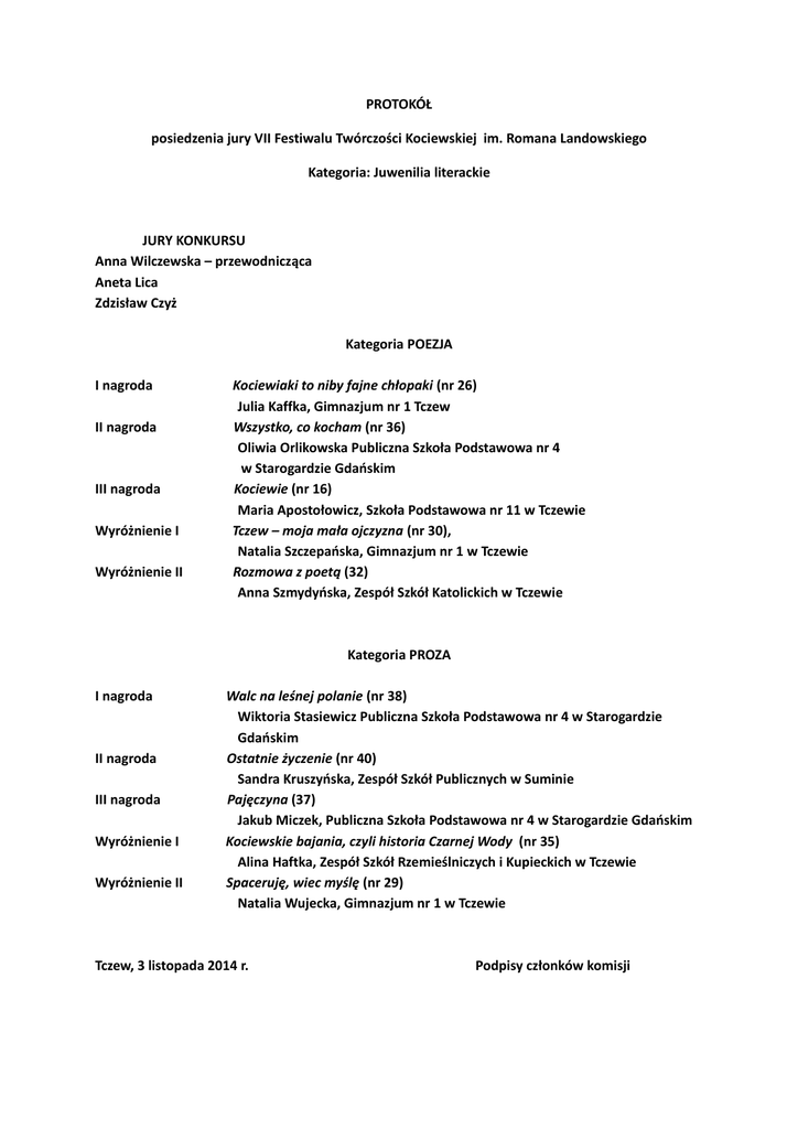 PROTOKÓŁ posiedzenia jury VII Festiwalu Twórczości Kociewskiej im. Romana Landowskiego Kategoria: Juwenilia literackie JURY KONKURSU Anna Wilczewska – przewodnicząca Aneta Lica Zdzisław Czyż Kategoria POEZJA I nagroda II nagroda III nagroda Wyróżnienie I Wyróżnienie II Kociewiaki to niby fajne chłopaki (nr 26) Julia Kaffka, Gimnazjum nr 1 Tczew Wszystko, co kocham (nr 36) Oliwia Orlikowska Publiczna Szkoła Podstawowa nr 4 w Starogardzie Gdańskim Kociewie (nr 16) Maria Apostołowicz, Szkoła Podstawowa nr 11 w Tczewie Tczew – moja mała ojczyzna (nr 30), Natalia Szczepańska, Gimnazjum nr 1 w Tczewie Rozmowa z poetą (32) Anna Szmydyńska, Zespół Szkół Katolickich w Tczewie Kategoria PROZA I nagroda II nagroda III nagroda Wyróżnienie I Wyróżnienie II Walc na leśnej polanie (nr 38) Wiktoria Stasiewicz Publiczna Szkoła Podstawowa nr 4 w Starogardzie Gdańskim Ostatnie życzenie (nr 40) Sandra Kruszyńska, Zespół Szkół Publicznych w Suminie Pajęczyna (37) Jakub Miczek, Publiczna Szkoła Podstawowa nr 4 w Starogardzie Gdańskim Kociewskie bajania, czyli historia Czarnej Wody (nr 35) Alina Haftka, Zespół Szkół Rzemieślniczych i Kupieckich w Tczewie Spaceruję, wiec myślę (nr 29) Natalia Wujecka, Gimnazjum nr 1 w Tczewie Tczew, 3 listopada 2014 r. Podpisy członków komisji