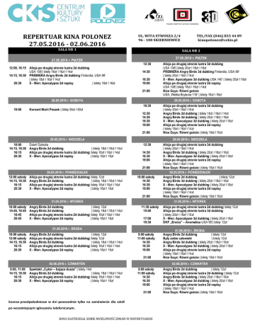 REPERTUAR KINA POLONEZ 27.05.2016 - 02.06.2016 UL. WITA STWOSZA 2/4 96 - 100 SKIERNIEWICE SALA NR 1 27.05.2016 r. PIĄTEK 12:00, 16:15 Alicja po drugiej stronie lustra 2d dubbing USA 108’| bilety 18zł I 16zł I 14zł 14:15, 18:30 PREMIERA Angry Birds 2d dubbing Finlandia, USA 99’ | bilety 18zł I 16zł I 14zł 20:30 X - Men: Apocalypse 2d napisy | bilety 18zł I 16zł SALA NR 2 27.05.2016 r. PIĄTEK 12:30 14:30 16:30 19:00 21:00 28.05.2016 r. SOBOTA 19:00 Koncert Marii Peszek | bilety 55zł I 50zł 10:30 21:00 29.05.2016 r. NIEDZIELA Dzień Dziecka Angry Birds 2d dubbing | bilety 18zł I 16zł I 14zł Alicja po drugiej stronie lustra 2d dubbing| bilety 18zł I 16zł I 14zł X - Men: Apocalypse 2d napisy | bilety 18zł I 16zł 12:30 14:30 16:30 19:00 10:00 szkoły 14:30 16:30 19:00 21:00 31.05.2016 r. WTOREK 10:00 szkoły 14:45, 16:45 18:45 20:45 Angry Birds 2d dubbing | bilety 12zł Angry Birds 2d dubbing | bilety 18zł I 16zł I 14zł Alicja po drugiej stronie lustra 2d dubbing| bilety 18zł I 16zł I 14zł X - Men: Apocalypse 2d napisy | bilety 18zł I 16zł Angry Birds 2d dubbing | bilety 12zł Alicja po drugiej stronie lustra 2d dubbing| bilety 12zł Angry Birds 2d dubbing | bilety 18zł I 16zł I 14zł Alicja po drugiej stronie lustra 2d dubbing| bilety 18zł I 16zł I 14zł X - Men: Apocalypse 2d napisy | bilety 18zł I 16zł 17:00 19:30 9:00 szkoły 11:00 szkoły 14:30 16:30 19:00 21:00 02.06.2016 r. CZWARTEK 9:00, 11:00 14:15, 18:30 16:15 20:30 Spektakl „Cykor – bojąca dusza” | bilety 14zł Angry Birds 2d dubbing | bilety 18zł I 16zł I 14zł Alicja po drugiej stronie lustra 2d dubbing| bilety 18zł I 16zł I 14zł X - Men: Apocalypse 2d napisy | bilety 18zł I 16zł Alicja po drugiej stronie lustra 3d dubbing | bilety 20zł I 18zł I 16zł Angry Birds 3d dubbing | bilety 20zł I 18zł I 16zł X - Men: Apocalypse 3d dubbing | bilety 20zł I 18zł Alicja po drugiej stronie lustra 2d napisy | bilety 18zł I 16zł I 14zł Nice Guys: Równi goście | bilety 18zł I 16zł 30.05.2016 r. PONIEDZIAŁEK Angry Birds 2d dubbing | bilety 12zł Angry Birds 3d dubbing | bilety 20zł I 18zł I 16zł X - Men: Apocalypse 3d dubbing | bilety 20zł I 18zł Alicja po drugiej stronie lustra 2d napisy | bilety 18zł I 16zł I 14zł Nice Guys: Równi goście | bilety 18zł I 16zł 31.05.2016 r. WTOREK 11:30 szkoły 15:00 01.06.2016 r. ŚRODA 10:00 szkoły 12:00 szkoły 14:15, 18:30 16:15 20:30 Alicja po drugiej stronie lustra 3d dubbing | bilety 20zł I 18zł I 16zł Angry Birds 2d dubbing | bilety 18zł I 16zł I 14zł Angry Birds 3d dubbing | bilety 20zł I 18zł I 16zł X - Men: Apocalypse 3d dubbing | bilety 20zł I 18zł Alicja po drugiej stronie lustra 2d napisy | bilety 18zł I 16zł I 14zł Nice Guys: Równi goście | bilety 18zł I 16zł 29.05.2016 r. NIEDZIELA 21:00 30.05.2016 r. PONIEDZIAŁEK 12:00 szkoły Alicja po drugiej stronie lustra 2d dubbing| bilety 12zł 14:15, 18:30 Angry Birds 2d dubbing | bilety 18zł I 16zł I 14zł 16:15 Alicja po drugiej stronie lustra 2d dubbing| bilety 18zł I 16zł I 14zł 20:30 X - Men: Apocalypse 2d napisy | bilety 18zł I 16zł Alicja po drugiej stronie lustra 3d dubbing USA 108’| bilety 20zł I 18zł I 16zł PREMIERA Angry Birds 3d dubbing Finlandia, USA 99’ | bilety 20zł I 18zł I 16zł X - Men: Apocalypse 3d dubbing USA 140’ | bilety 20zł I 18zł Alicja po drugiej stronie lustra 2d napisy USA 108’| bilety 18zł I 16zł I 14zł Nice Guys: Równi goście USA, Wielka Brytania 116’ | bilety 18zł I 16zł 28.05.2016 r. SOBOTA 12:30 14:30 16:30 19:00 10:00 14:15, 18:30 16:15 20:30 TEL/FAX (046) 833 44 89 [email protected] Alicja po drugiej stronie lustra 2d dubbing| bilety 12zł Alicja po drugiej stronie lustra 3d dubbing | bilety 20zł I 18zł I 16zł X - Men: Apocalypse 3d dubbing | bilety 20zł I 18zł DKF „Eroica” – Anomalisa USA 90’| bilety 12zł 01.06.2016 r. ŚRODA Angry Birds 2d dubbing | bilety 12zł Były sobie człowieki | bilety 12zł Angry Birds 3d dubbing | bilety 20zł I 18zł I 16zł X - Men: Apocalypse 3d dubbing | bilety 20zł I 18zł Alicja po drugiej stronie lustra 2d napisy | bilety 18zł I 16zł I 14zł Nice Guys: Równi goście | bilety 18zł I 16zł 02.06.2016 r. CZWARTEK 9:00 szkoły 11:00 szkoły 14:30 16:30 19:00 21:00 Seanse przedpołudniowe w dni powszednie tylko na zamówienie dla szkół po wcześniejszym zgłoszeniu telefonicznym. KINO ZASTRZEGA SOBIE MOŻLIWOŚĆ ZMIAN W REPERTUARZE Angry Birds 2d dubbing | bilety 12zł Alicja po drugiej stronie lustra 2d dubbing | bilety 12zł Angry Birds 3d dubbing | bilety 20zł I 18zł I 16zł X - Men: Apocalypse 3d dubbing | bilety 20zł I 18zł Alicja po drugiej stronie lustra 2d napisy | bilety 18zł I 16zł I 14zł Nice Guys: Równi goście | bilety 18zł I 16zł